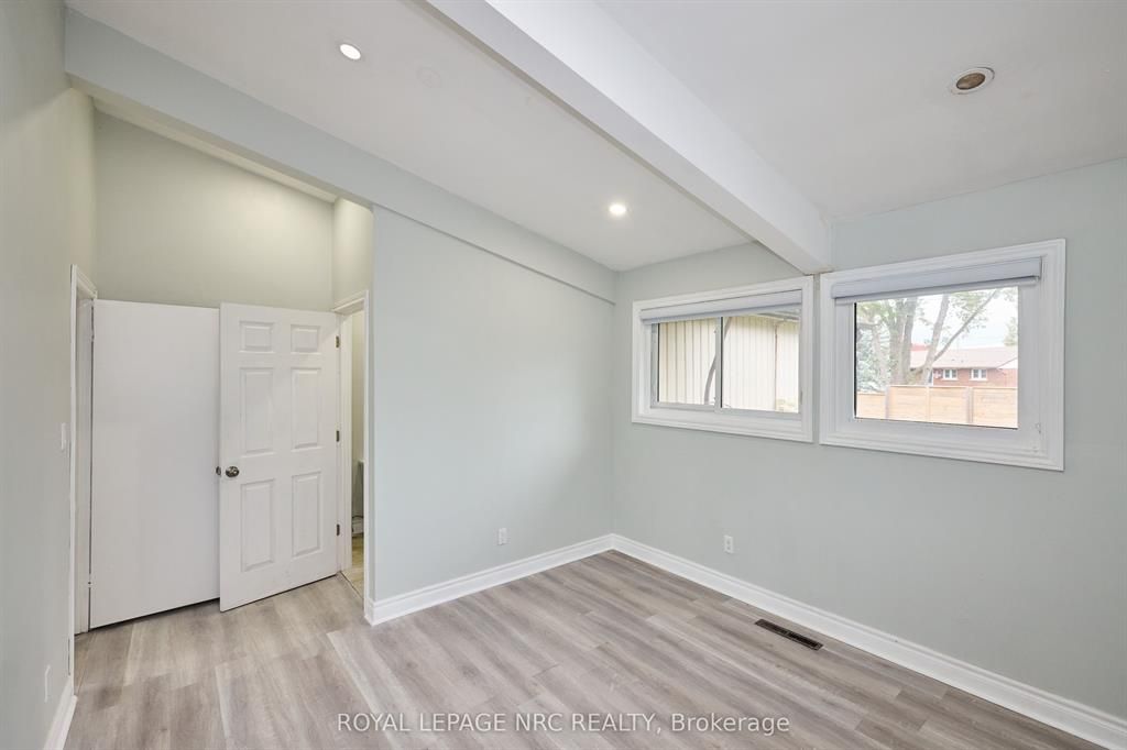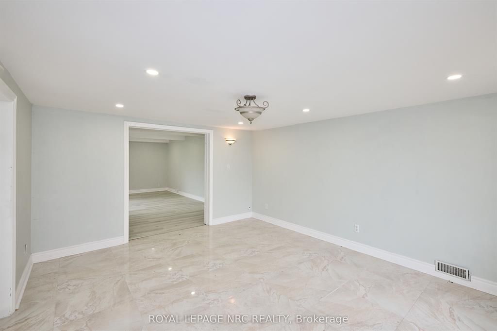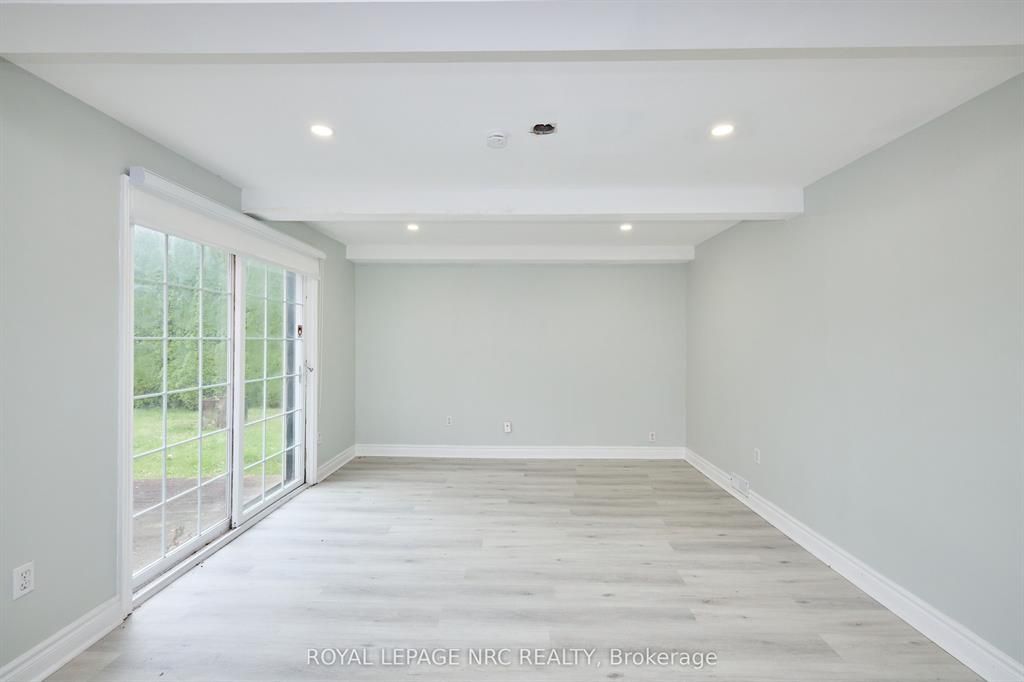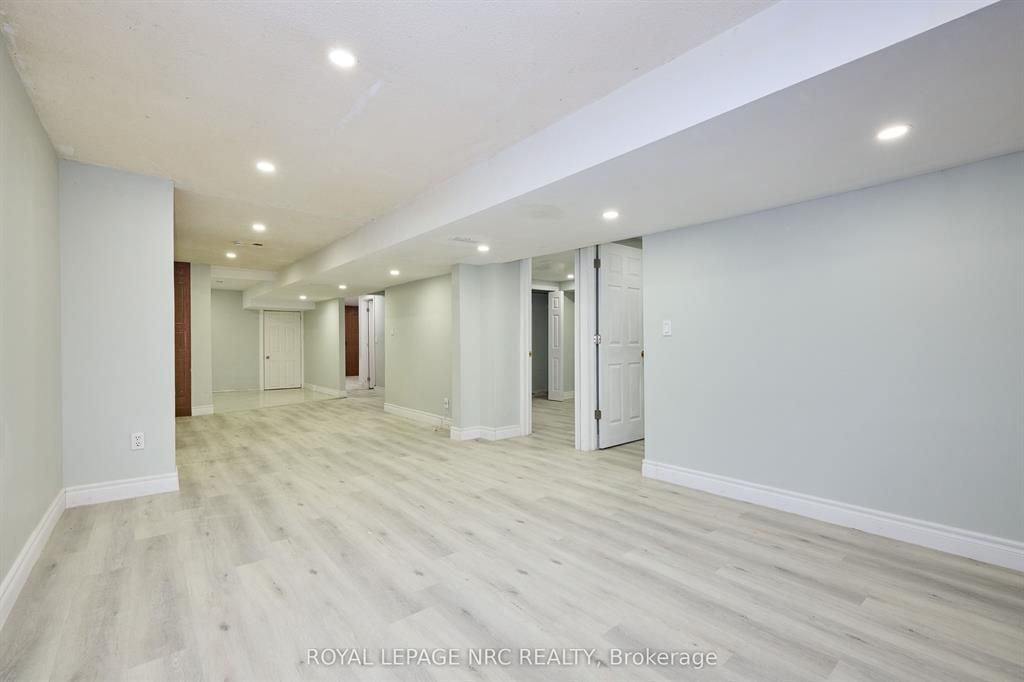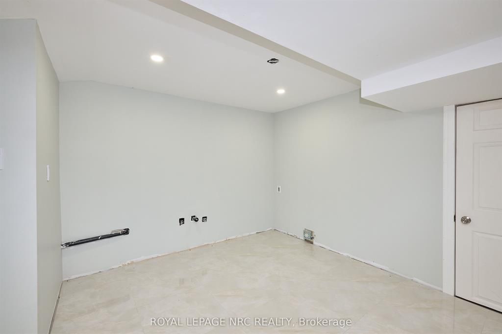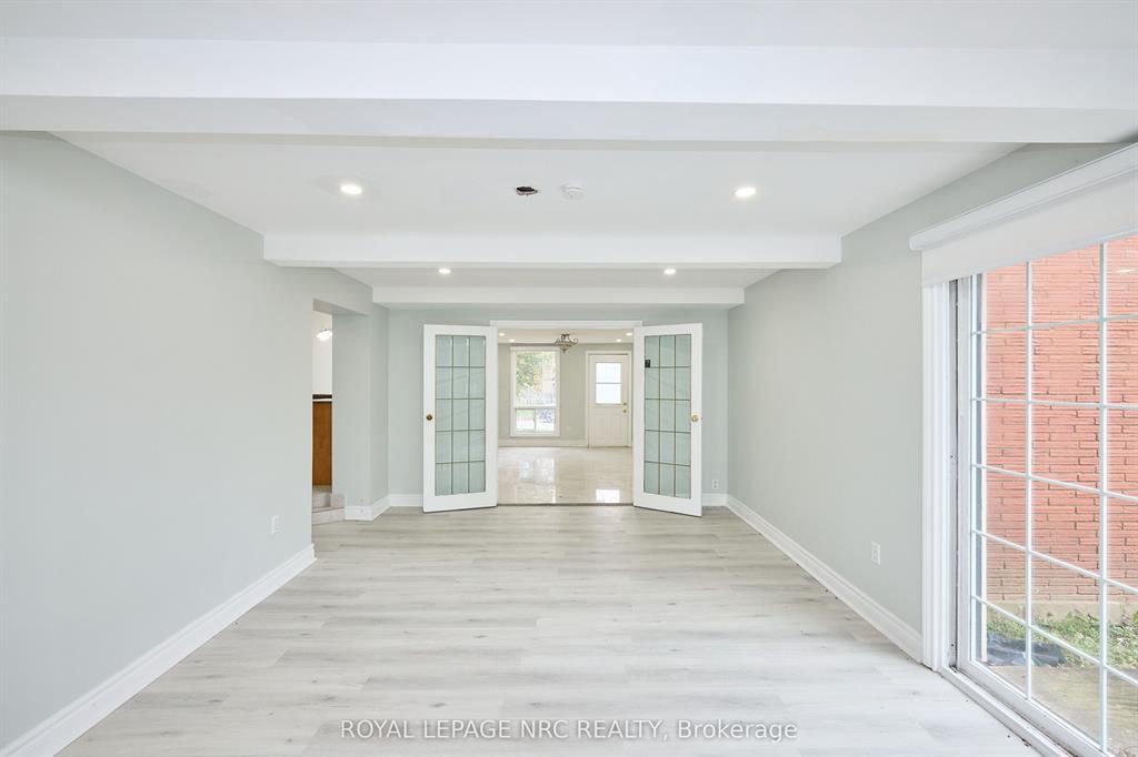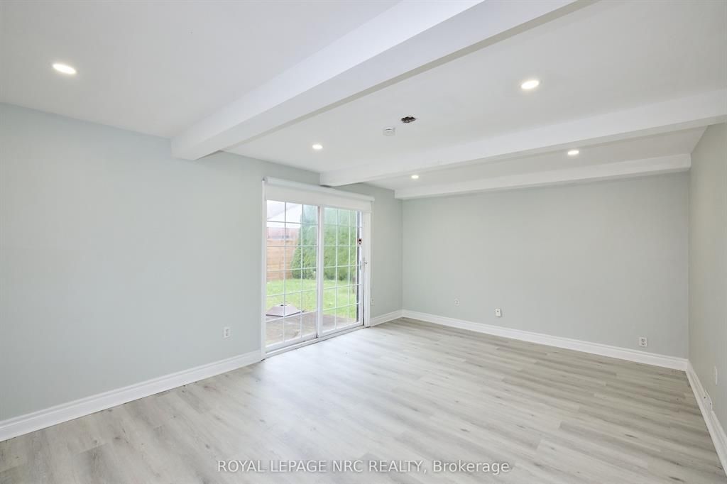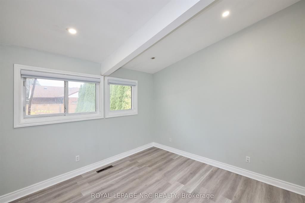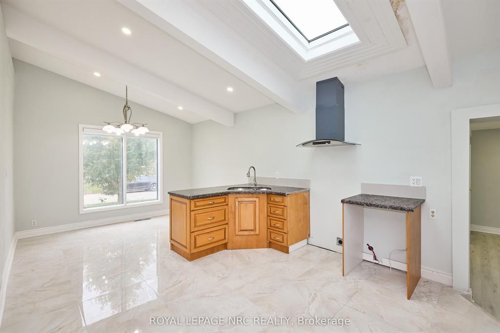 Large 3+2 bedroom bungalow with 2 car garage, located in the heart of stamford center. This unique and spacious layout features a kitchen skylight and vaulted ceilings. A large dining area with french doors leads to a family room and bedroom with updated laminate flooring. Patio doors off the family room lead to a private backyard deck with a fenced-in backyard. An attached living room with vaulted ceilings and plenty of windows offers natural light. A brick reclaimed ceiling height, gas fireplace, and four-piece bathroom are also included. The main four-piece bathroom, large living room, and two bedrooms are located on the main floor. This bungalow is within walking distance of shopping, restaurants, and schools.