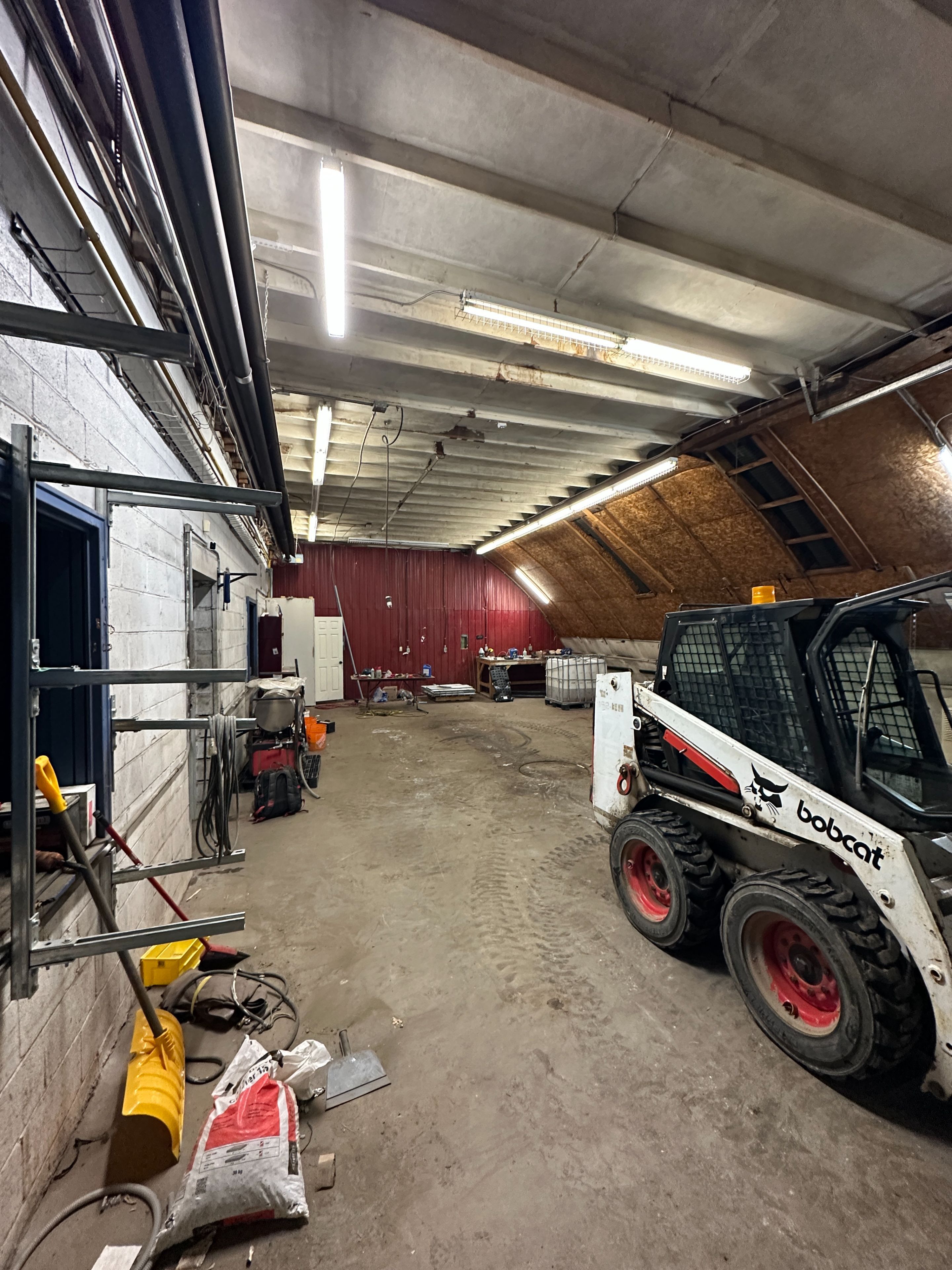 • Durable concrete floors and industrial lighting for a functional workspace.