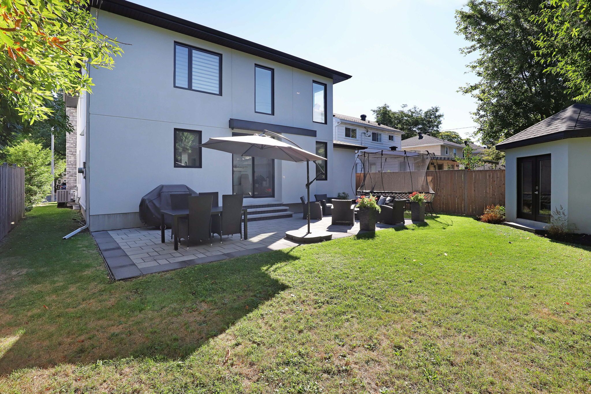 Welcome to 668 mansfield, a quality 2020 full reno and expansion family home in one of ottawa's most sought-after neighbourhoods. Surrounded by top schools, parks, and community amenities, this property combines modern design with everyday convenience. The two-storey foyer opens to a formal living and dining area, leading into a stunning family room with soaring ceilings, gas fireplace, and abundant natural light. The chef's kitchen features a massive quartz island, walk-in pantry, gas stove, stainless appliances, and beverage fridge. A custom mudroom connects to the extra-deep garage (33' deep) with rear yard access. Upstairs offers four bedrooms (one ideal as a home office), a full bath with double sinks, laundry room, and a spacious primary suite with coffered ceiling, walk-in closet with built-ins, and a luxurious five-piece ensuite. The finished lower level includes a large rec room, gym area, guest/den bedroom, and full bath. White oak hardwood on both levels, on-demand hot water, central vacuum, built-in speakers, and thoughtful finishes highlight the quality of this home. The private yard is perfect for family living with an interlock stone patio, large stylish shed, and ample space for a trampoline or future pool? 668 mansfield delivers style, space, and location an ideal setting for modern family life.