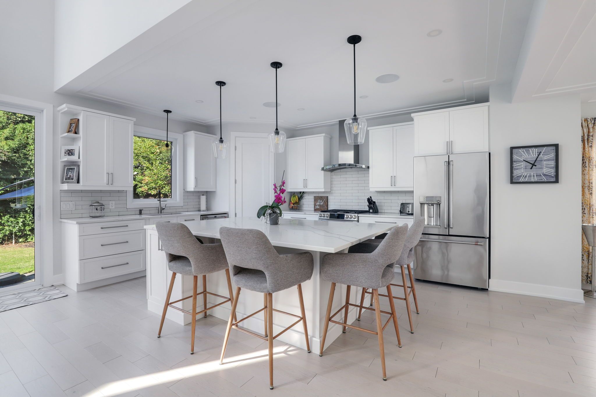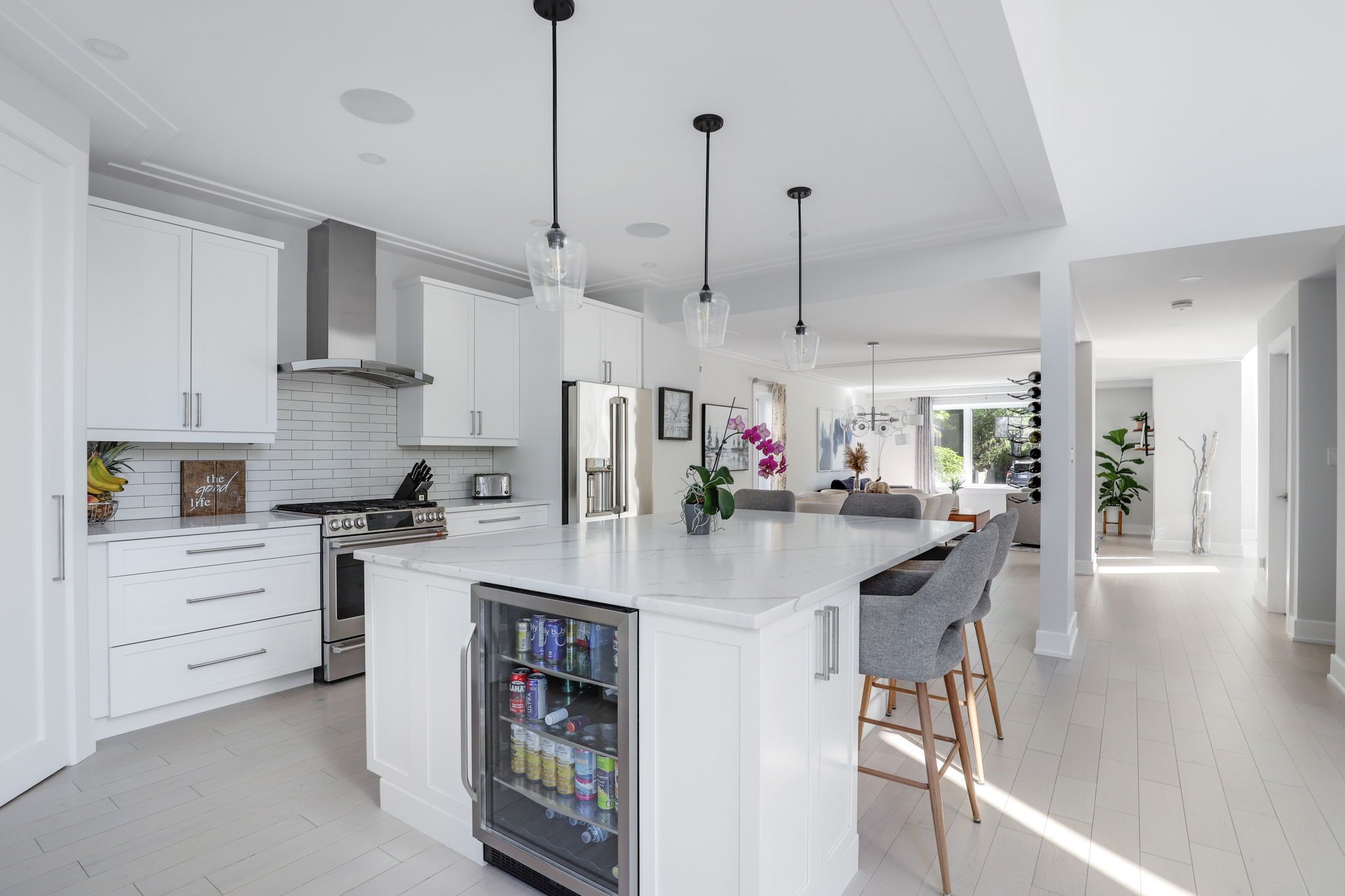 • Gourmet kitchen with a huge quartz island and stainless appliances.