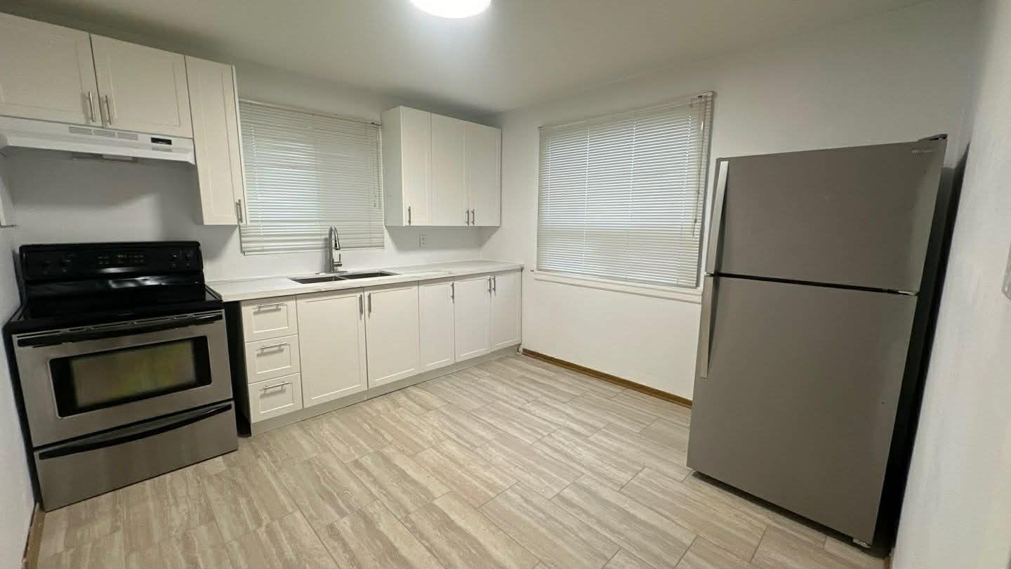 • Modern kitchen equipped with stainless steel appliances and ample storage.