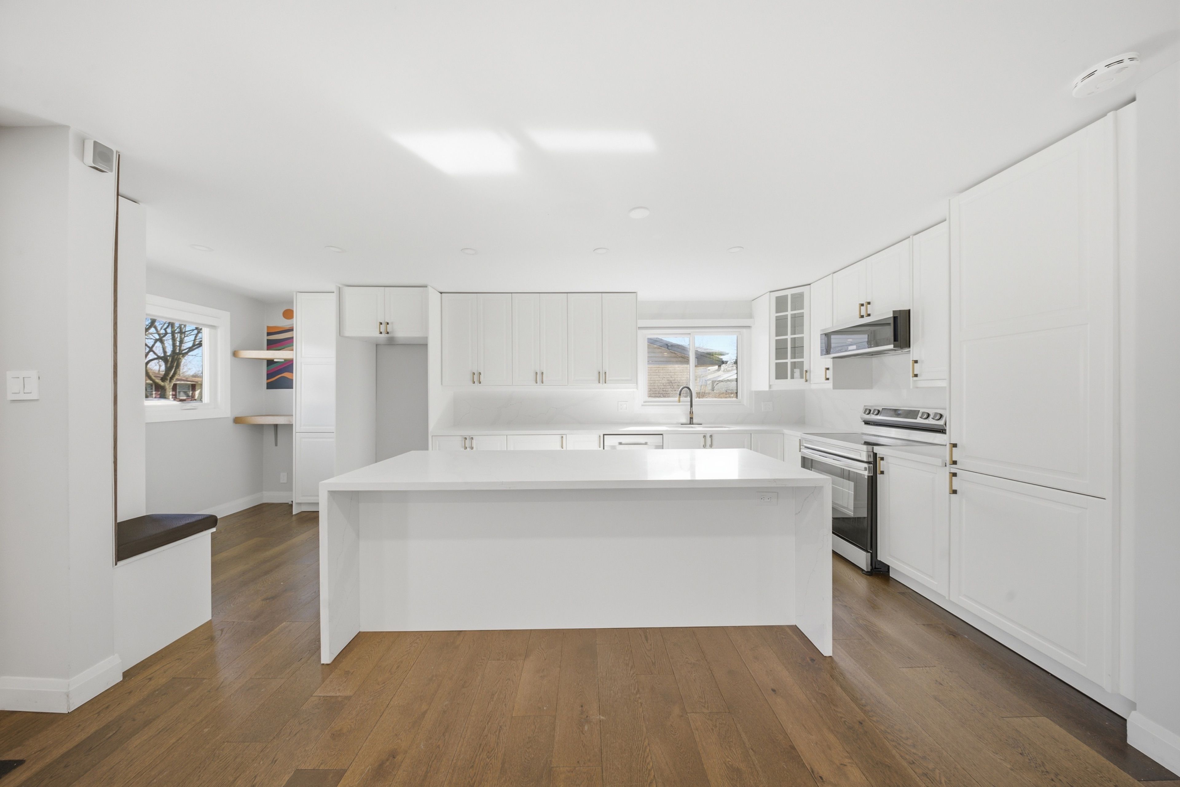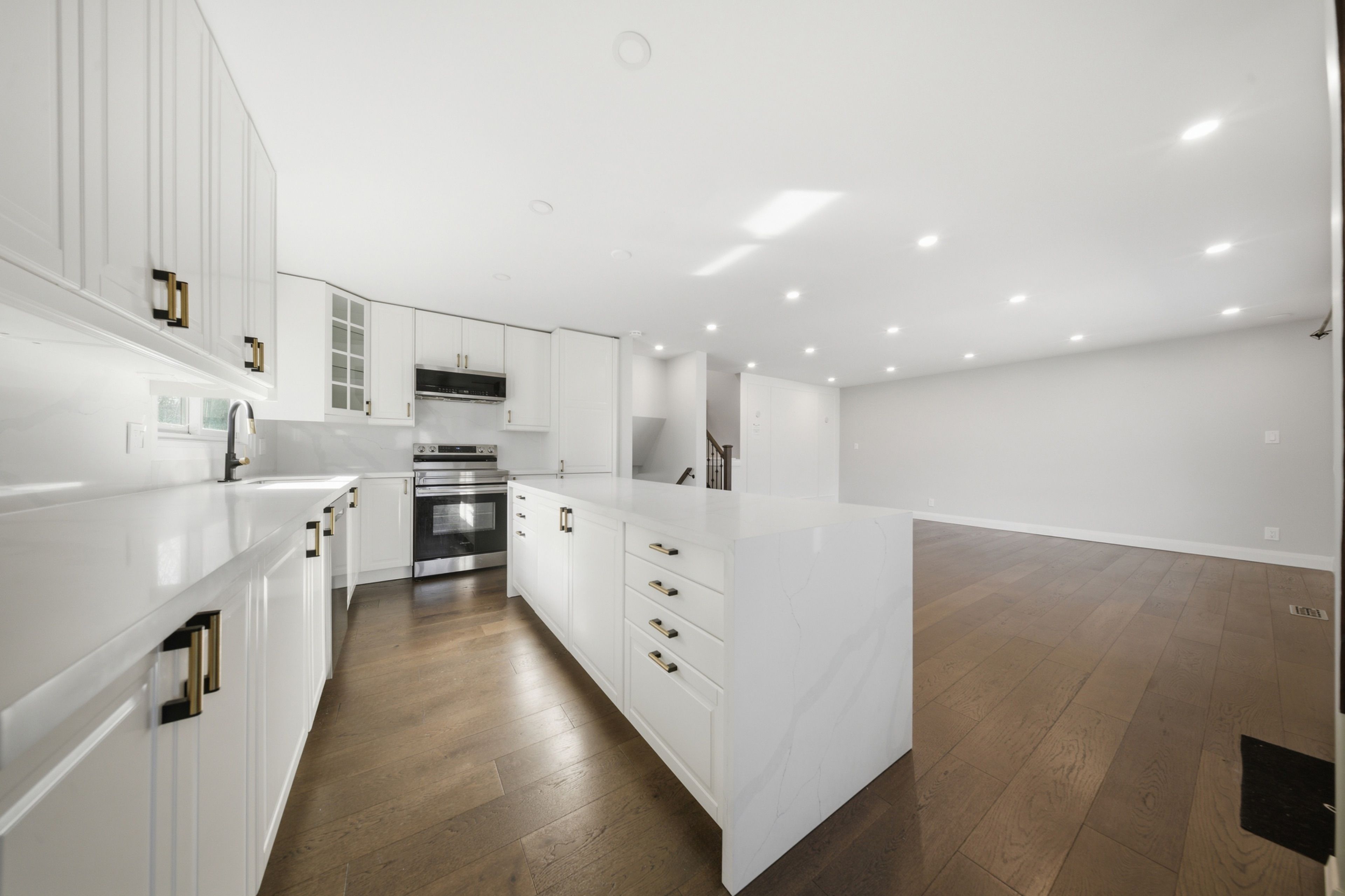 • Contemporary kitchen with large island and quartz countertops in open layout.