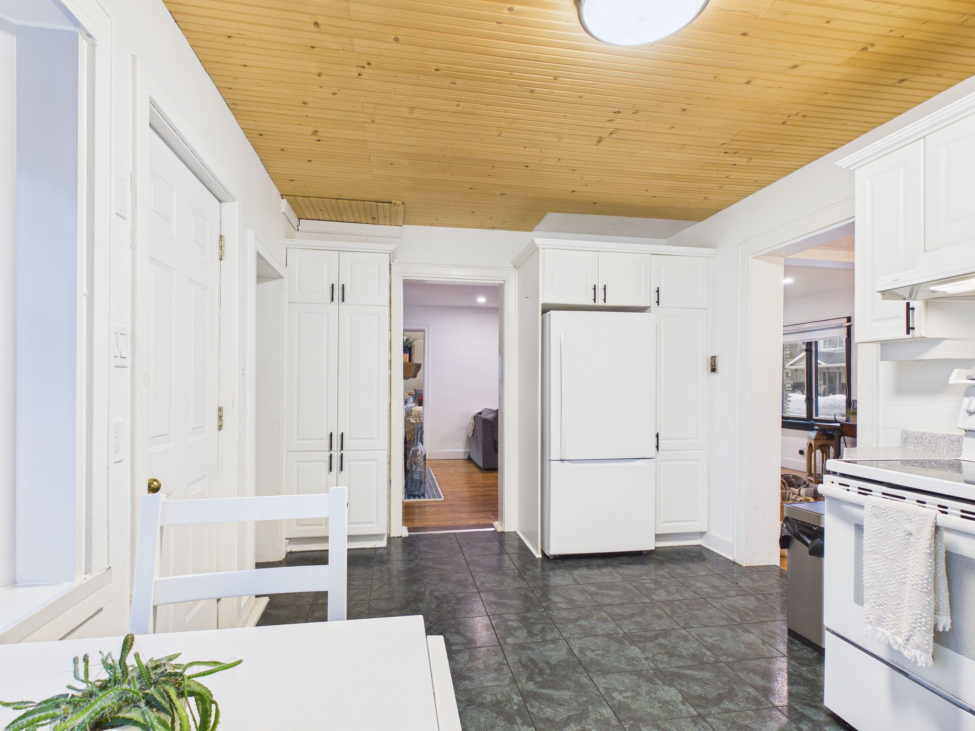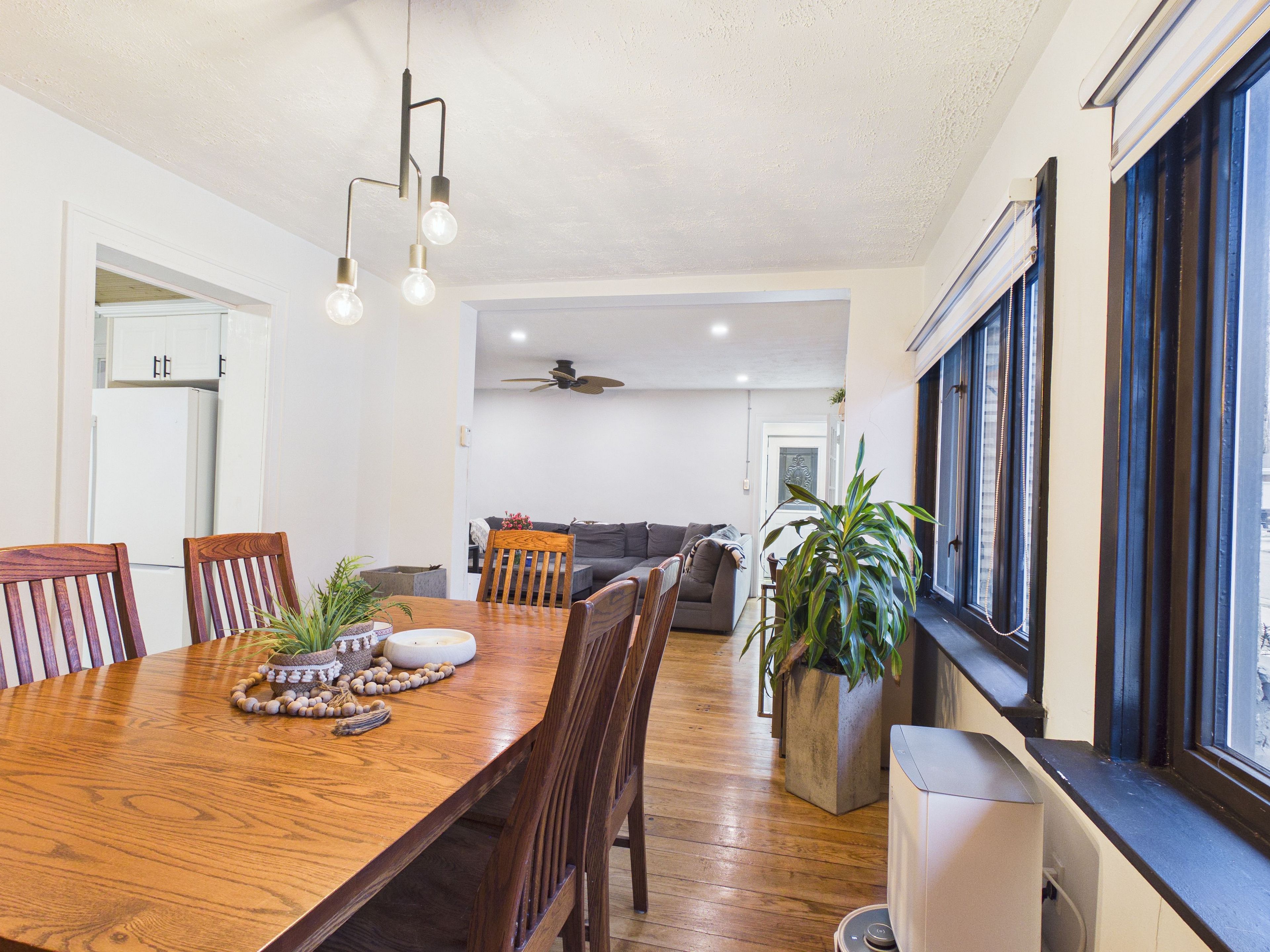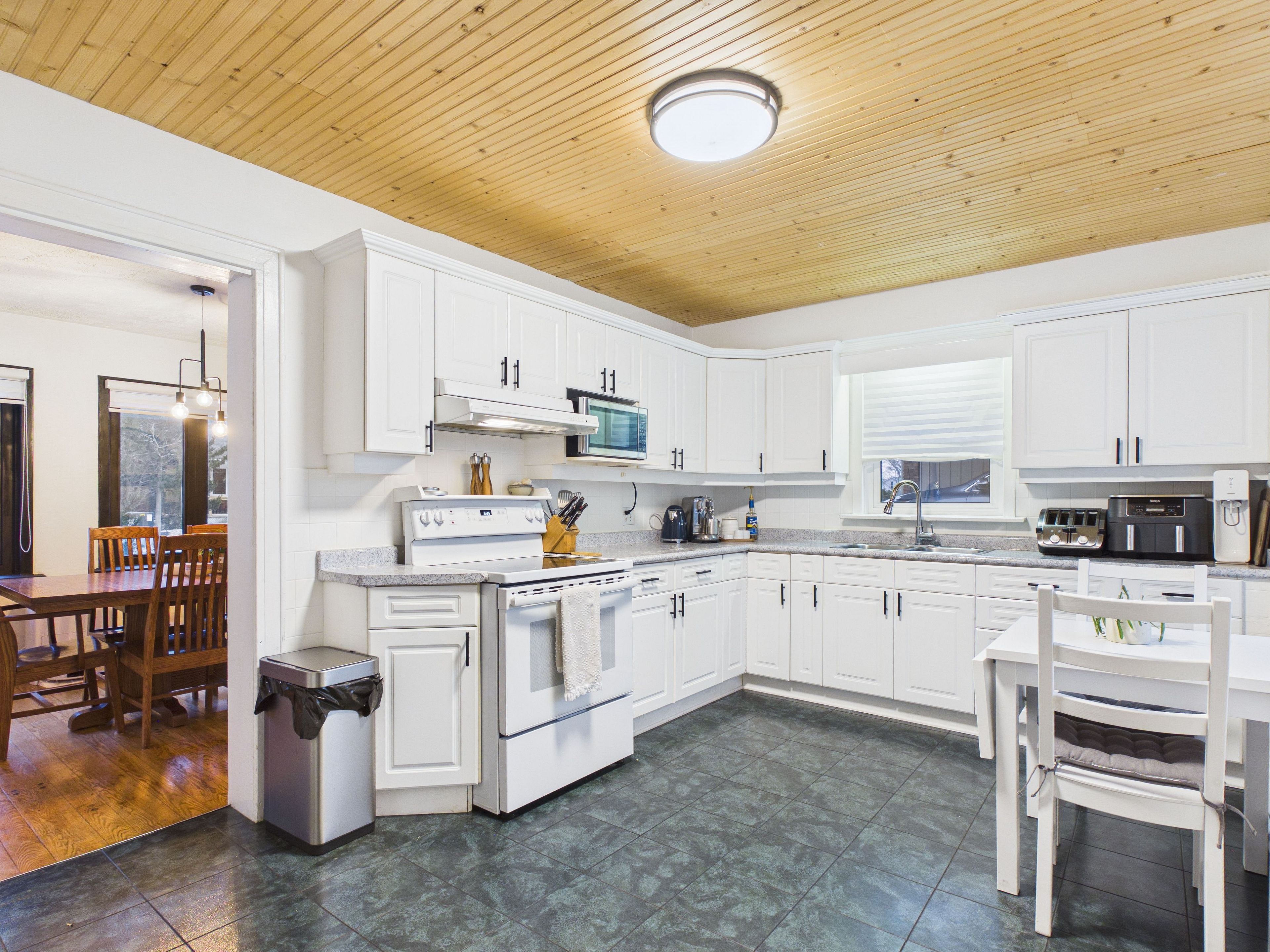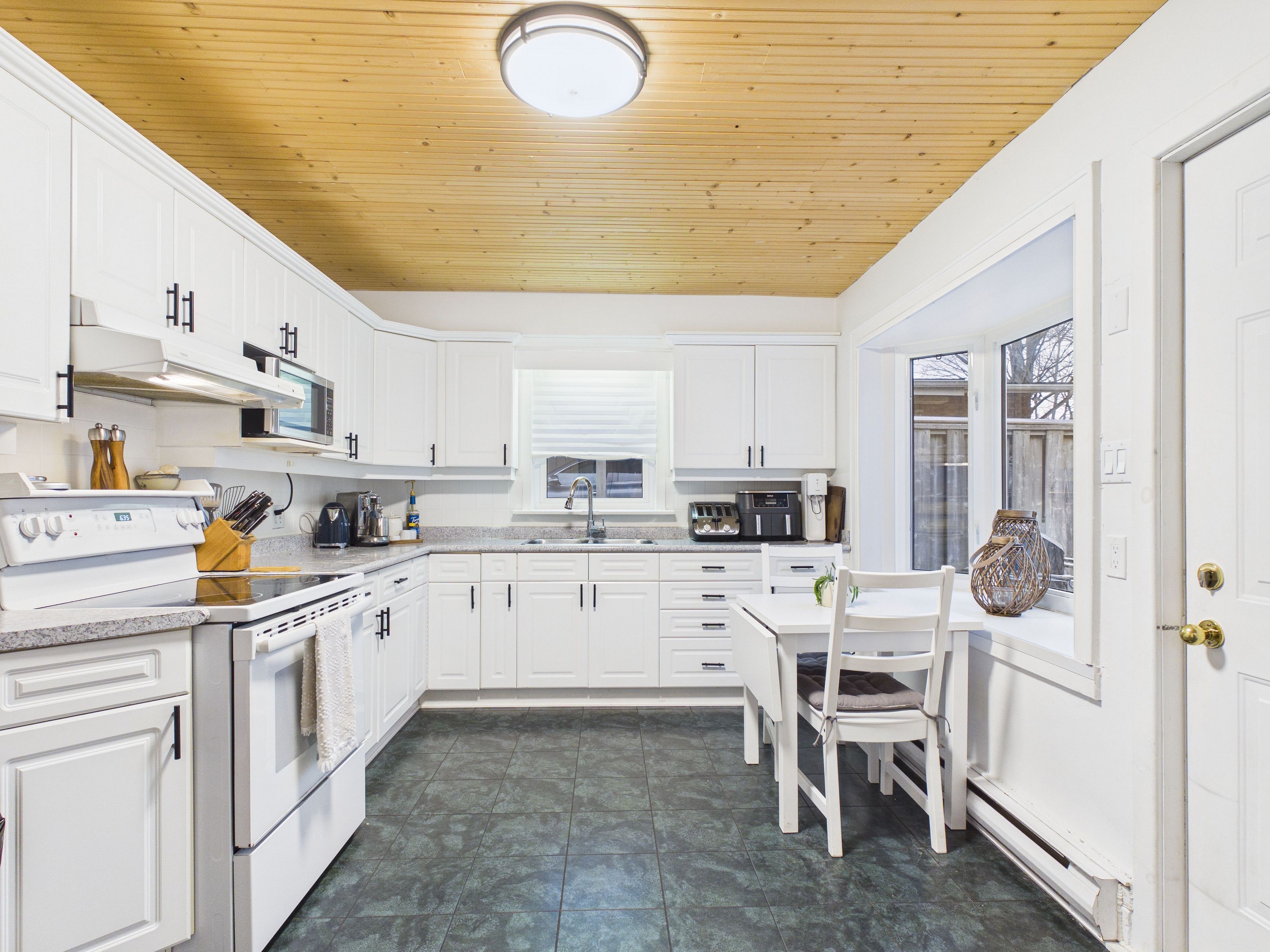 • Well-equipped kitchen with a cozy breakfast nook and backyard view.
