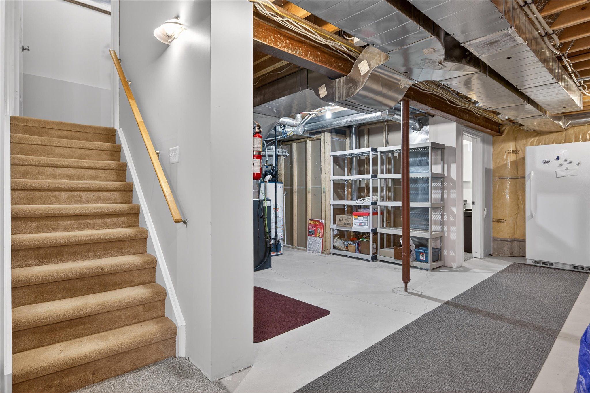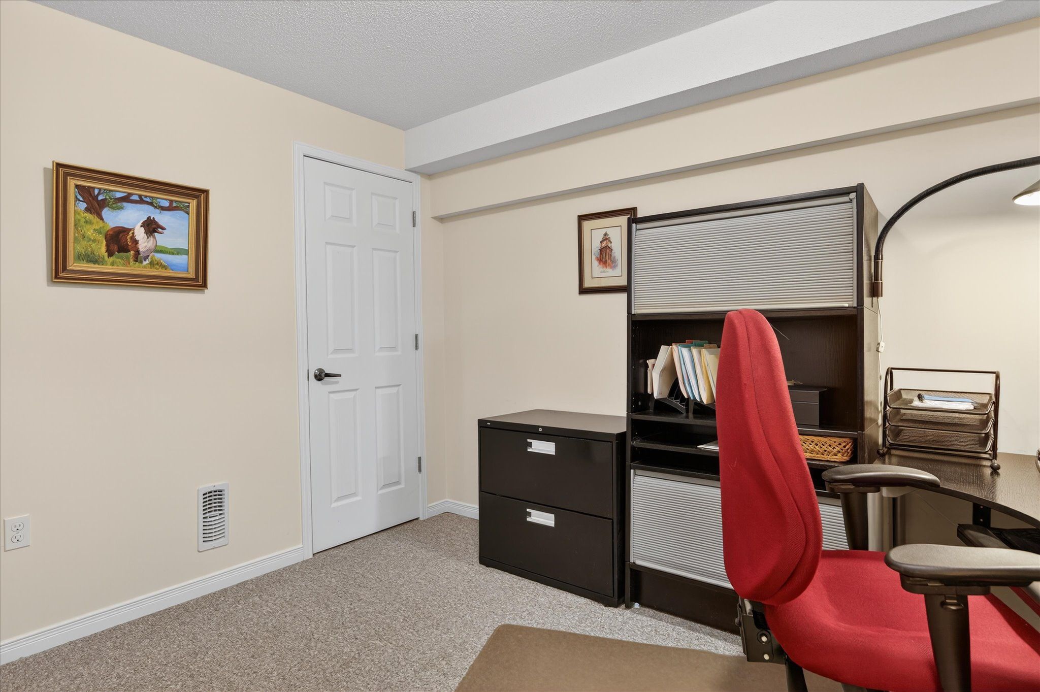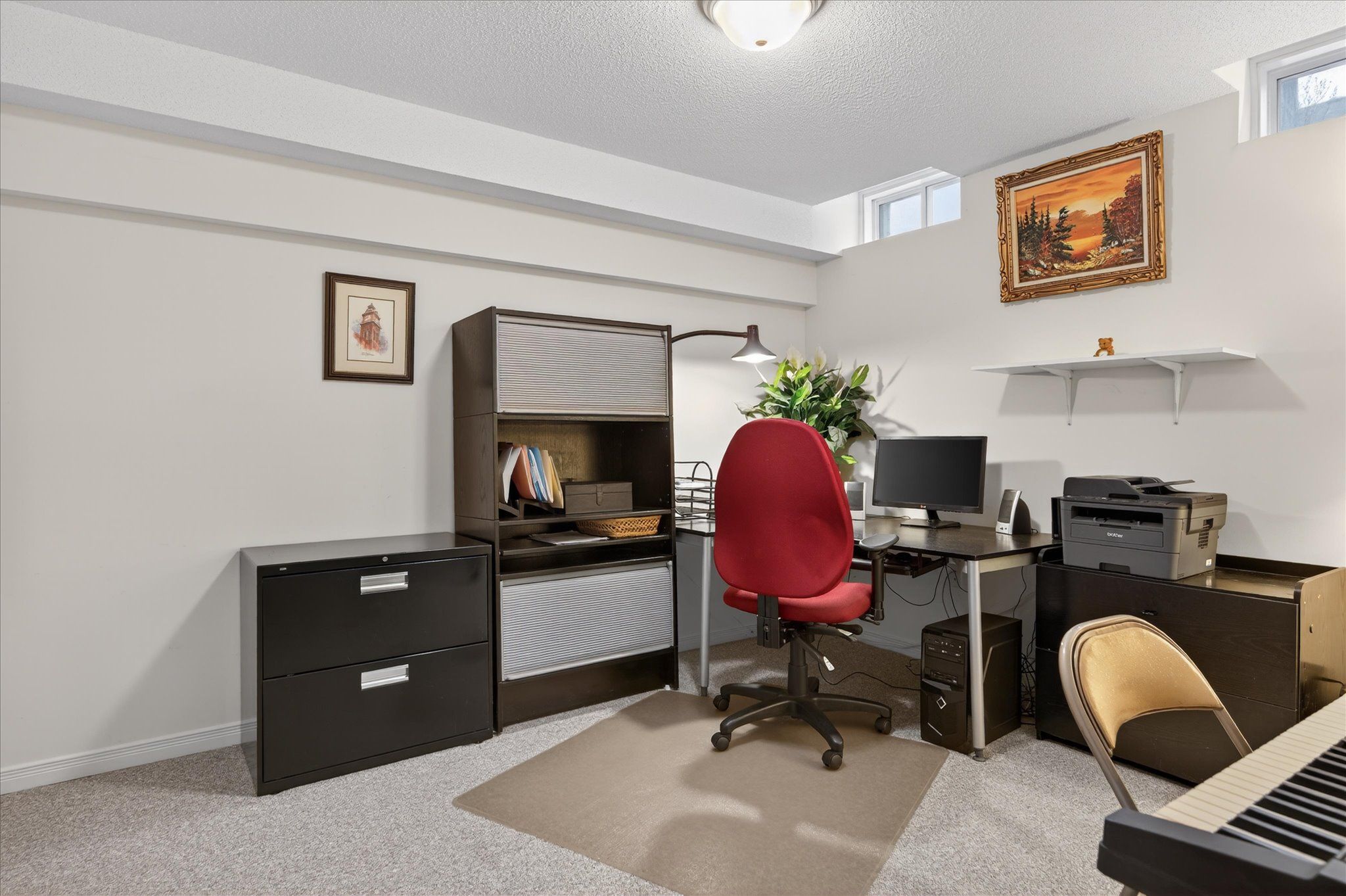 • Finished basement office area with ample storage and versatility.