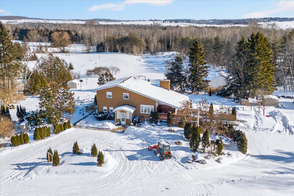Set on 12. 5 picturesque acres, this exceptional property offers a rare blend of privacy, beauty, and functionality. Expansive lawns, vibrant gardens, and a tranquil private pond create a peaceful, storybook setting that feels like a true retreat. Inside, the open-concept design is ideal for effortless entertaining, featuring a soaring vaulted ceiling in the living room, an airy layout, and an abundance of natural light that fills the home with warmth and charm. The upper level hosts three bright and generously sized bedrooms, each complete with double closets for ample storage, along with a centrally located family bathroom designed for everyday comfort. The finished basement adds valuable living space, providing a versatile retreat perfect for movie nights, games, or accommodating extended family and guests. Perched above the backyard, the home captures sweeping views of the surrounding landscape and offers plenty of room for a future shop or detached garage. With 1,657 sq. Ft. Of above-grade living space plus a finished basement, this property delivers space, serenity, and endless possibilities in a truly unforgettable setting.