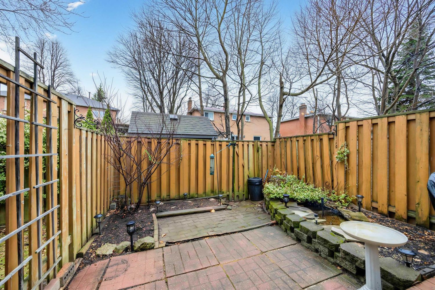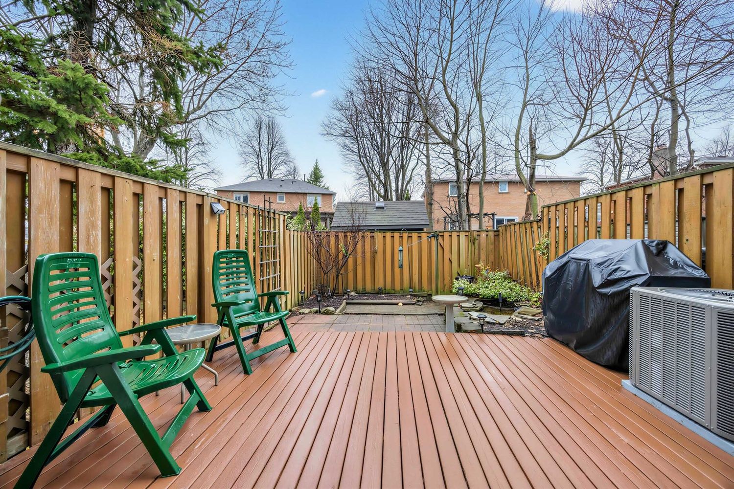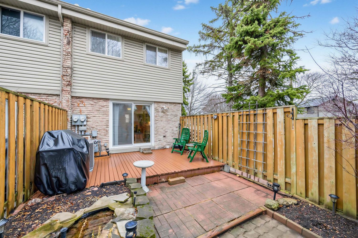 • Private fenced backyard oasis complete with pond and wood deck.