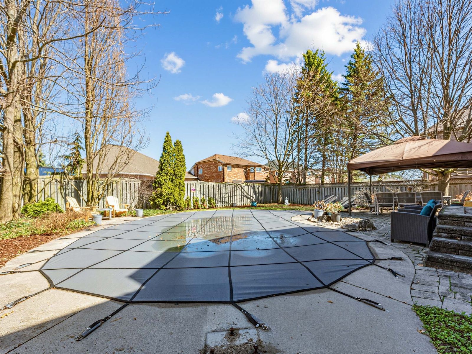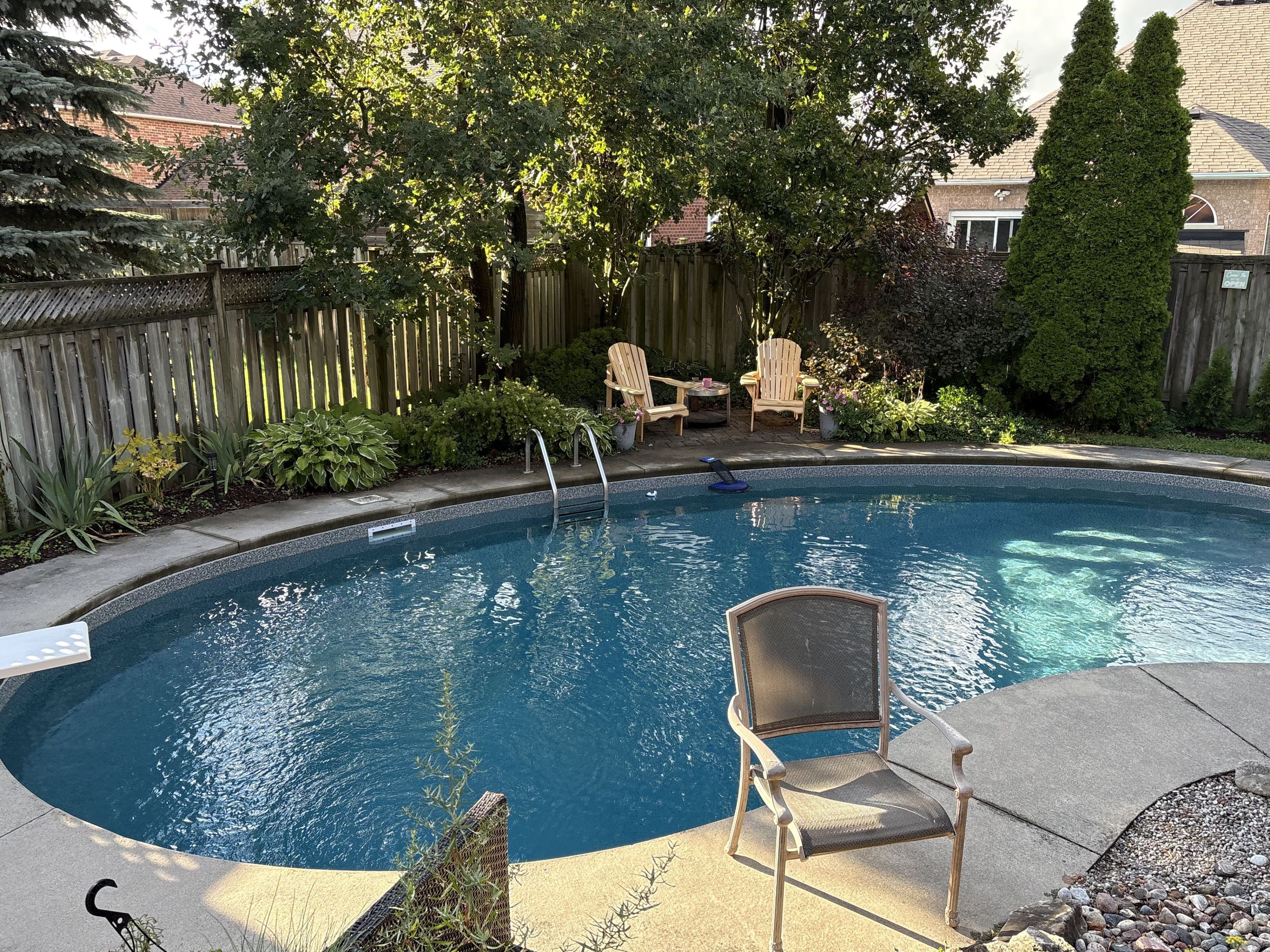 • Backyard features a private pool surrounded by mature trees for relaxation.