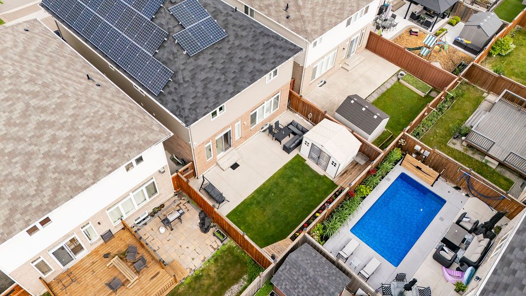 • Fully fenced backyard with landscaping, patio, and garden shed.