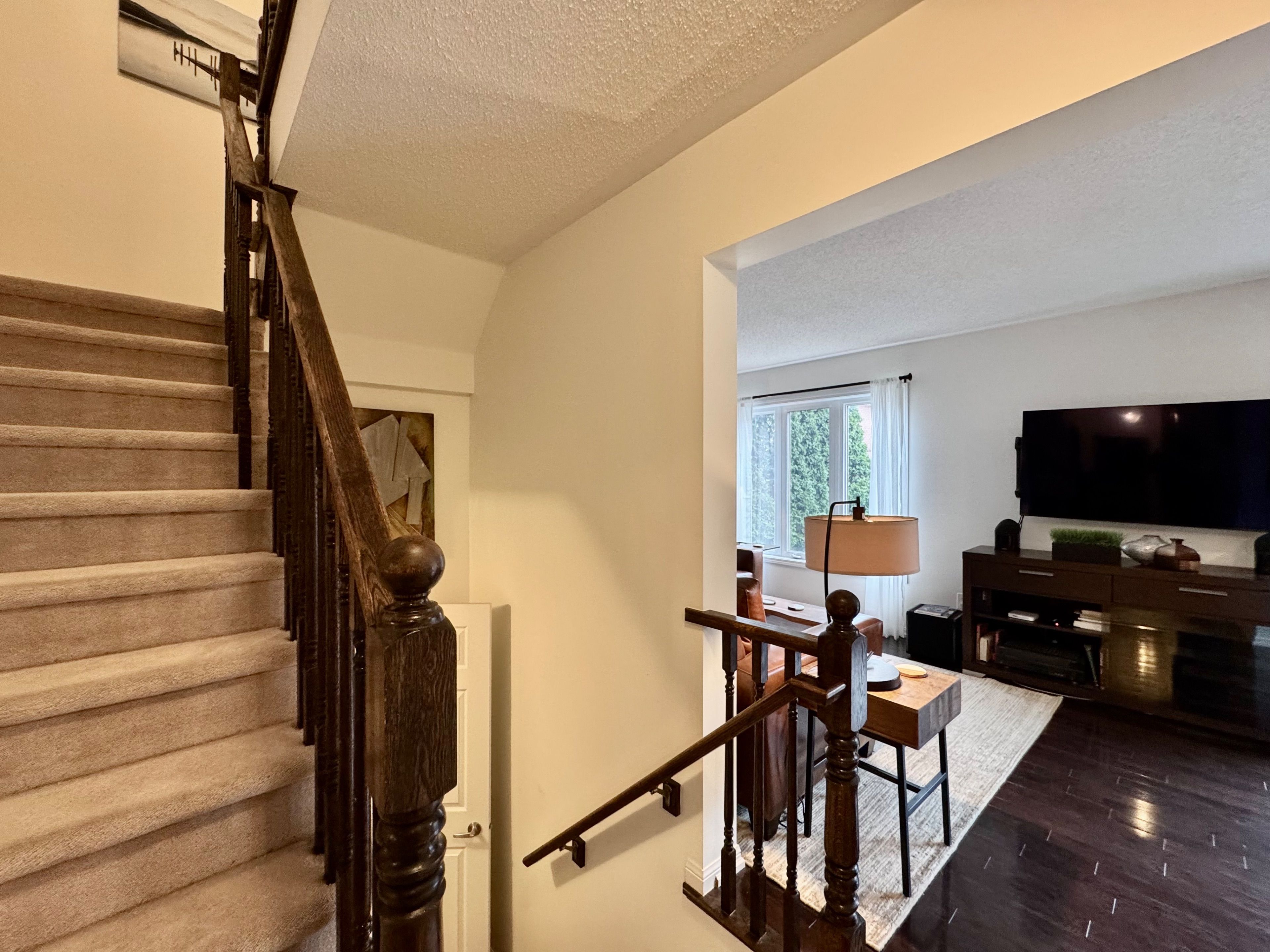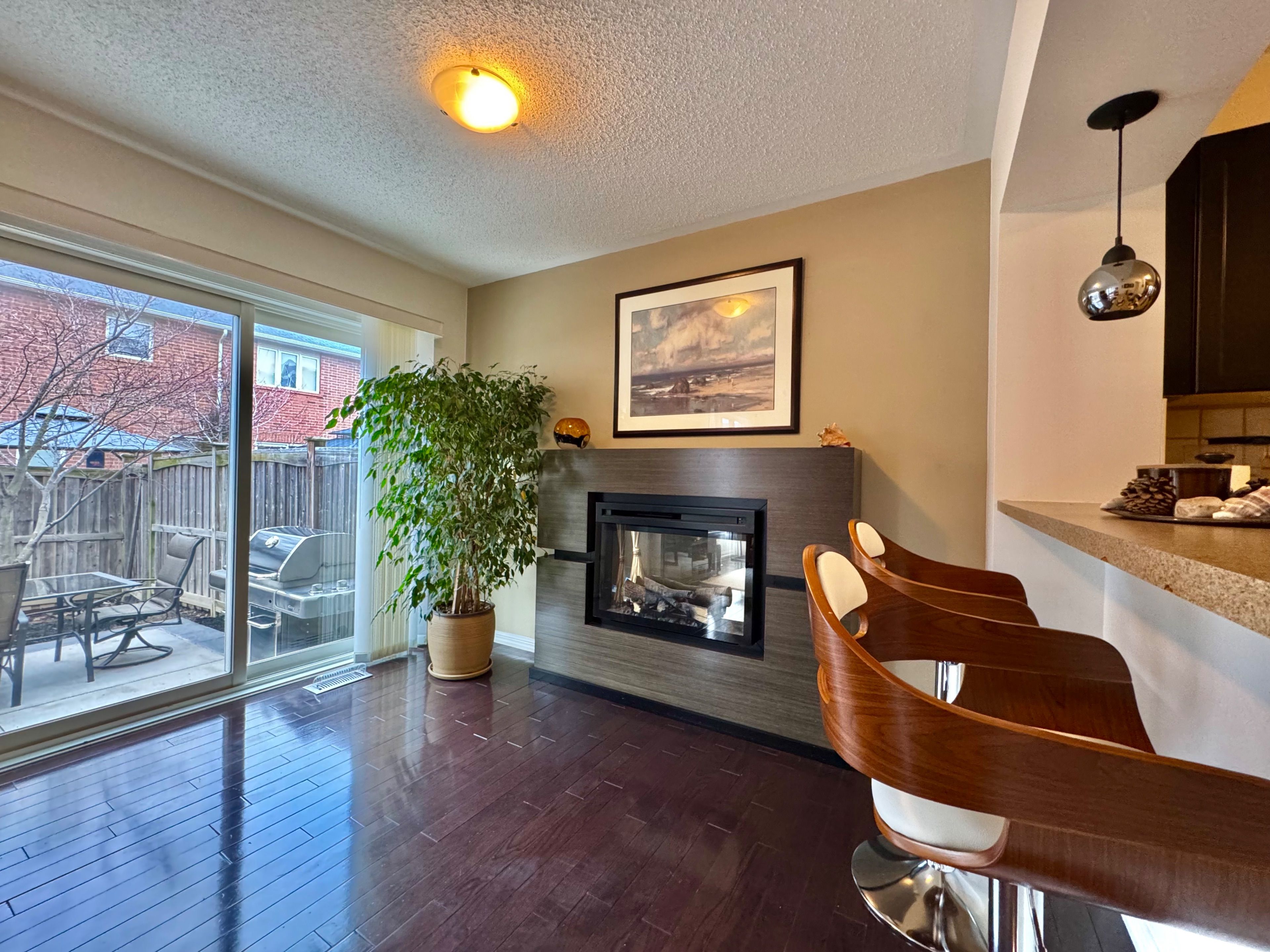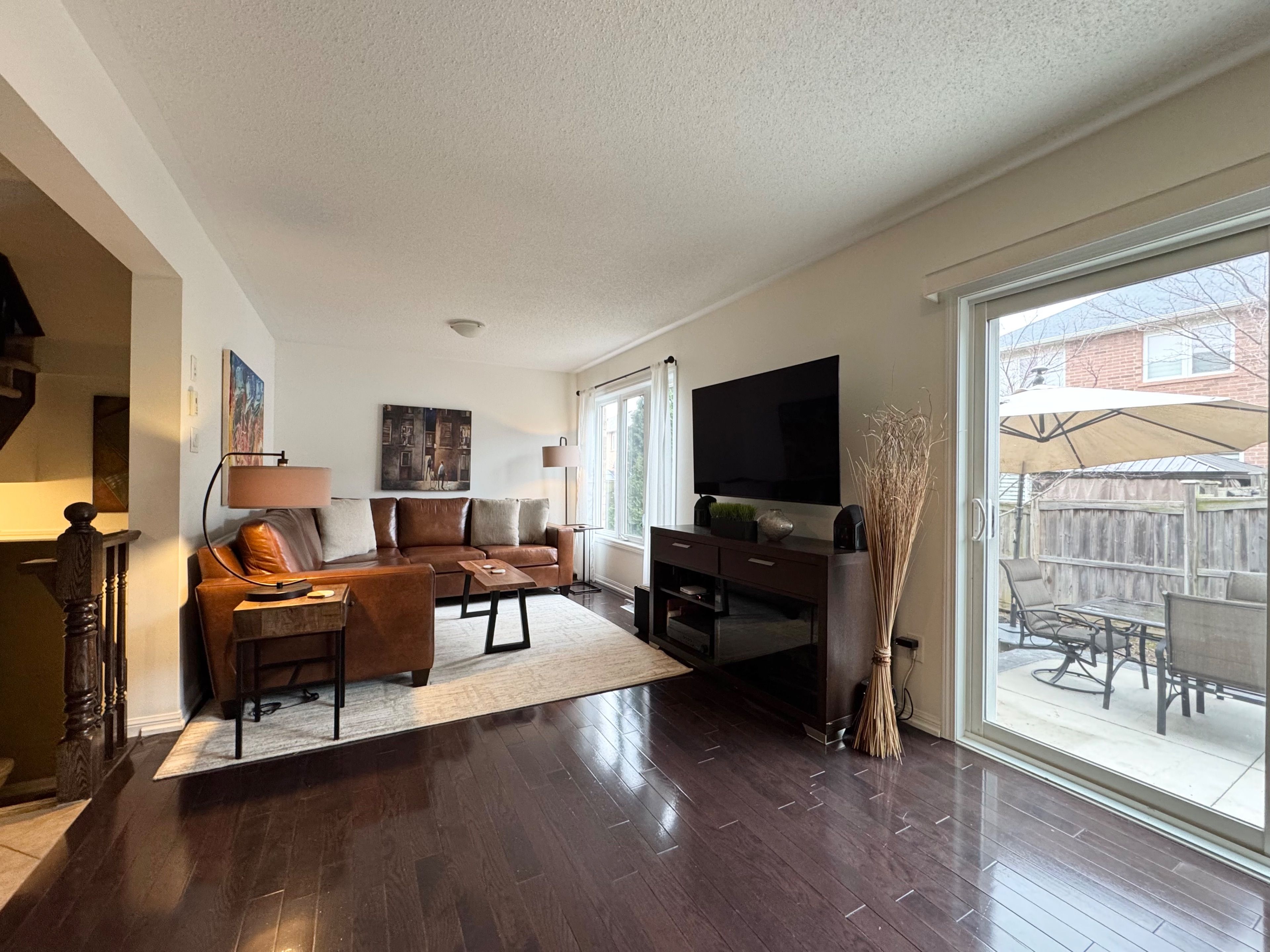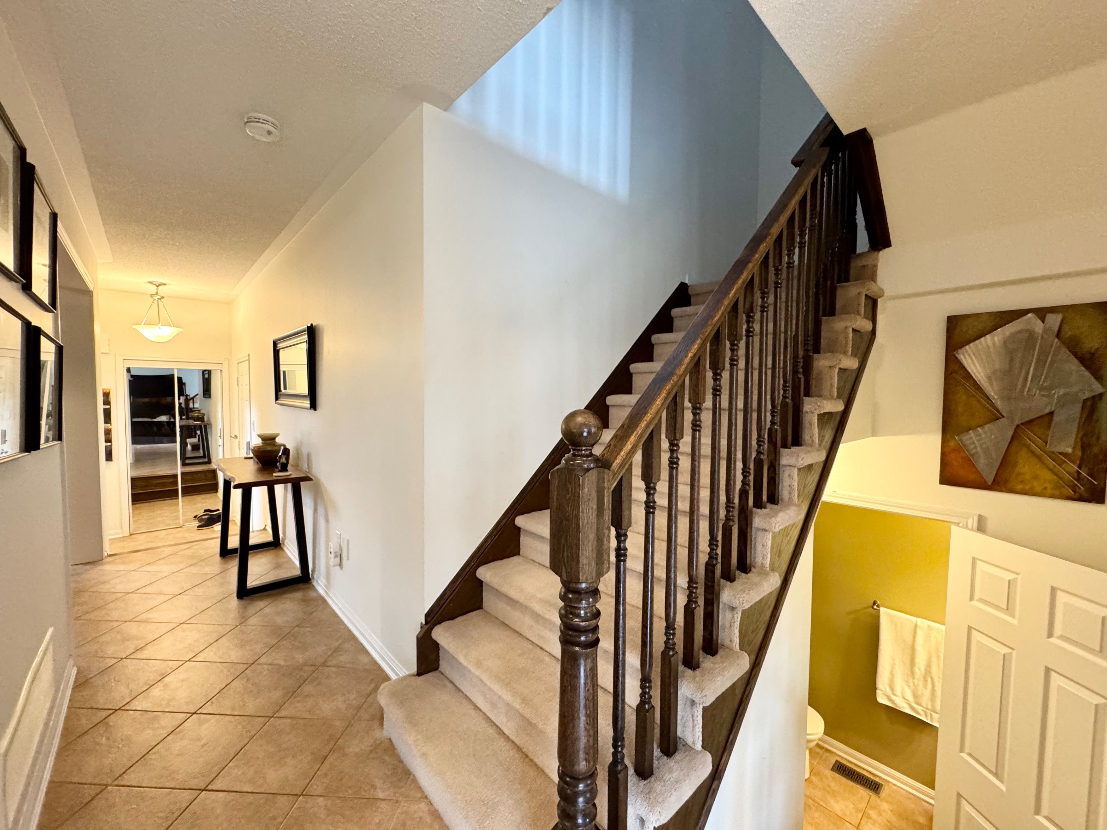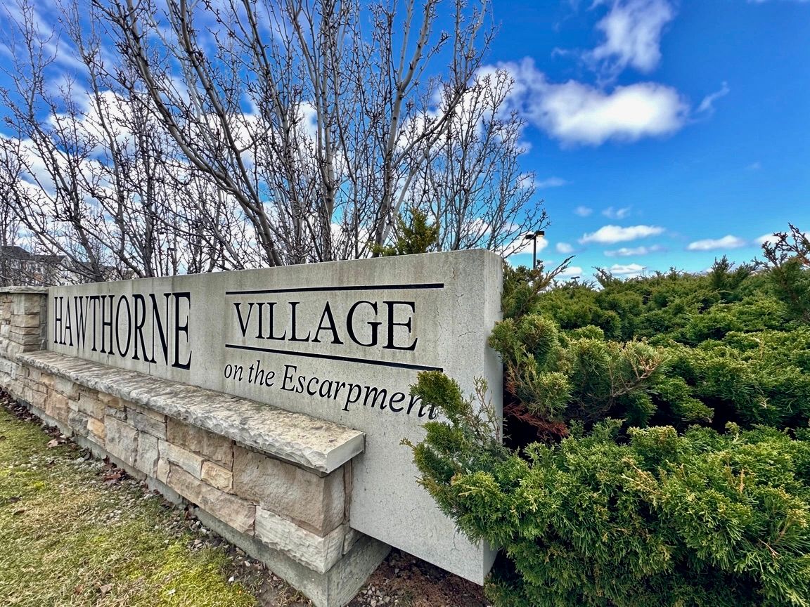 Absolutely stunning mattamy "bolton" model townhouse located on a quiet street in the highly sought-after hawthorne village on the escarpment. This 3-bedroom, 1. 5-bath home shows like new and is completely move-in ready. The main floor features an open-concept layout with new dark hardwood flooring in the living and dining areas. Modern eat-in kitchen with dark stained cabinets, upgraded pantry, tumbled stone backsplash, 45-degree tilework, sleek black appliances, and a raised breakfast bar. Walkout to garage for convenient access. The second floor offers a spacious primary bedroom with his and hers closets and semi-ensuite access, along with two additional well-sized bedrooms. Unfinished basement includes larger windows, 3-piece bathroom rough-in, and open laundry area-ready for customization. Additional features include central air conditioning, whole-home humidifier, and energy star efficiency features for reduced utility costs. Located in a family-friendly neighbourhood close to parks, schools, and amenities. Shows 10+.