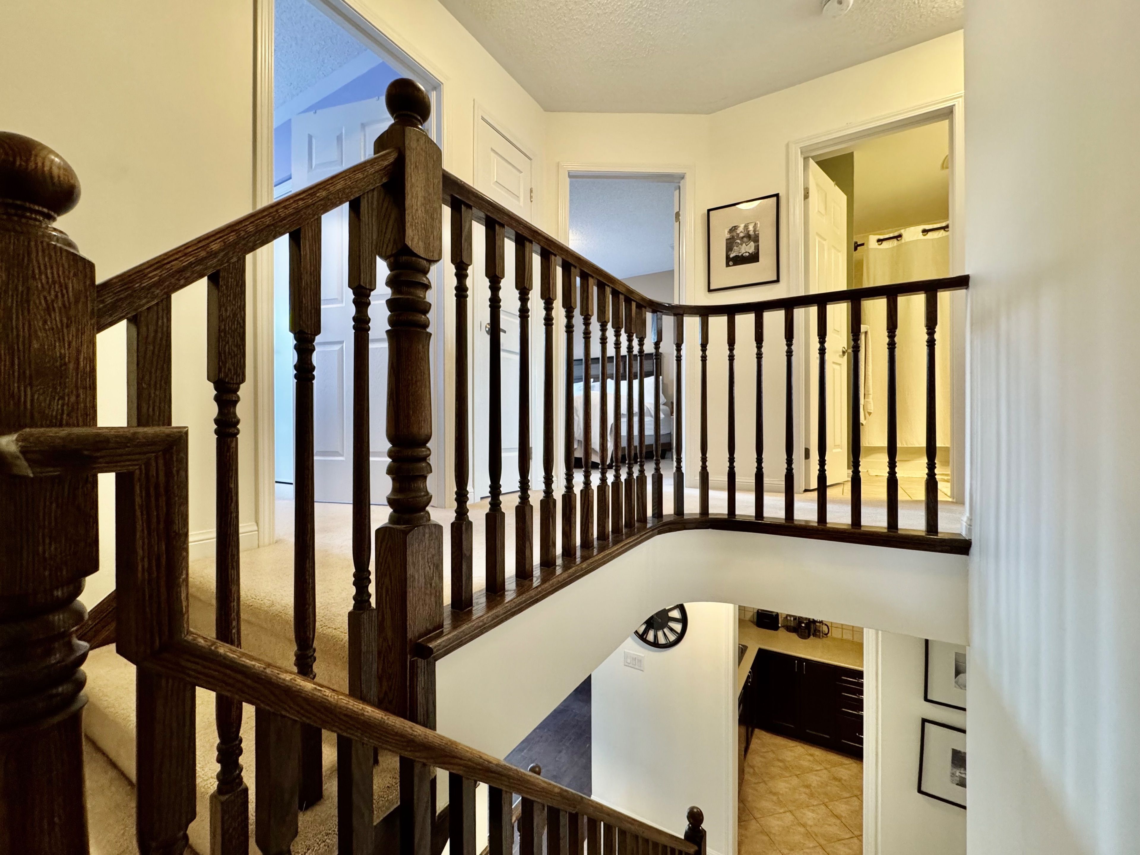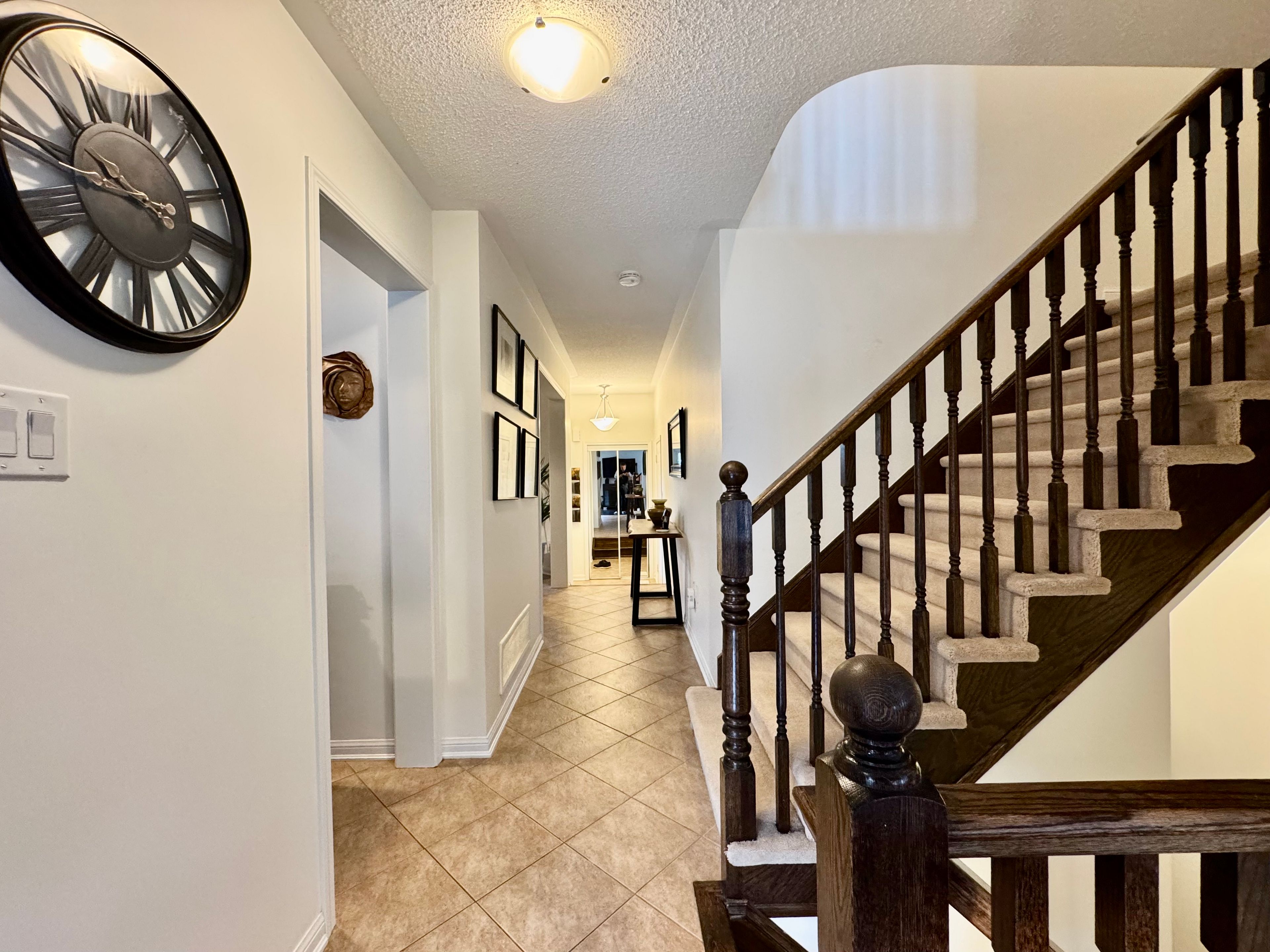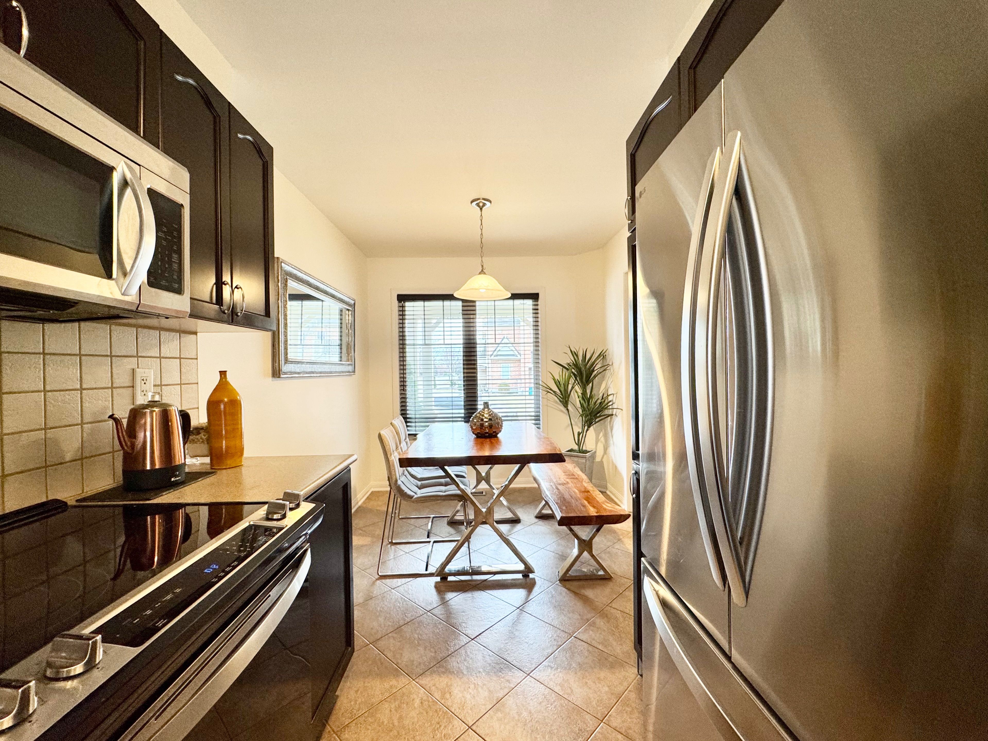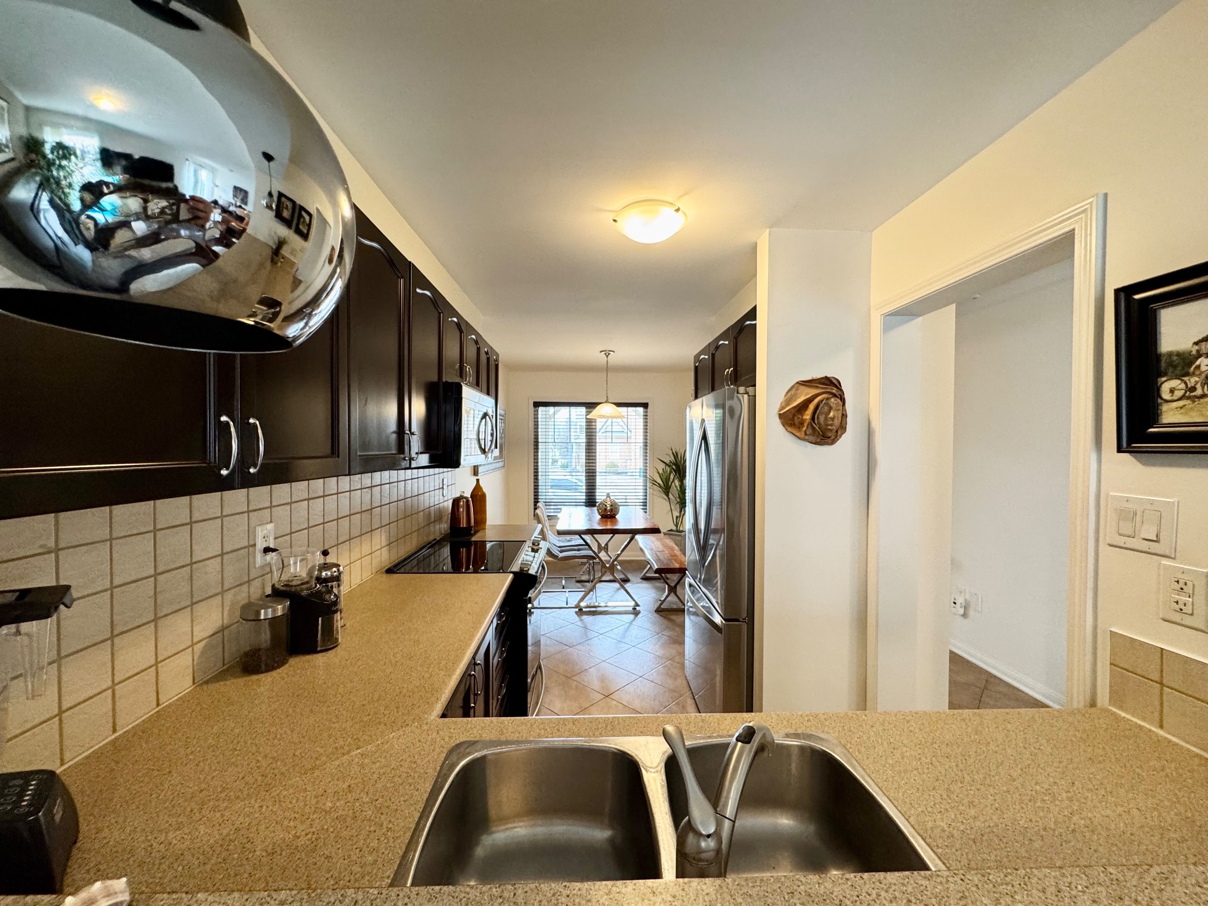 Absolutely stunning mattamy "bolton" model townhouse located on a quiet street in the highly sought-after hawthorne village on the escarpment. This 3-bedroom, 1. 5-bath home shows like new and is completely move-in ready. The main floor features an open-concept layout with new dark hardwood flooring in the living and dining areas. Modern eat-in kitchen with dark stained cabinets, upgraded pantry, tumbled stone backsplash, 45-degree tilework, sleek black appliances, and a raised breakfast bar. Walkout to garage for convenient access. The second floor offers a spacious primary bedroom with his and hers closets and semi-ensuite access, along with two additional well-sized bedrooms. Unfinished basement includes larger windows, 3-piece bathroom rough-in, and open laundry area-ready for customization. Additional features include central air conditioning, whole-home humidifier, and energy star efficiency features for reduced utility costs. Located in a family-friendly neighbourhood close to parks, schools, and amenities. Shows 10+.