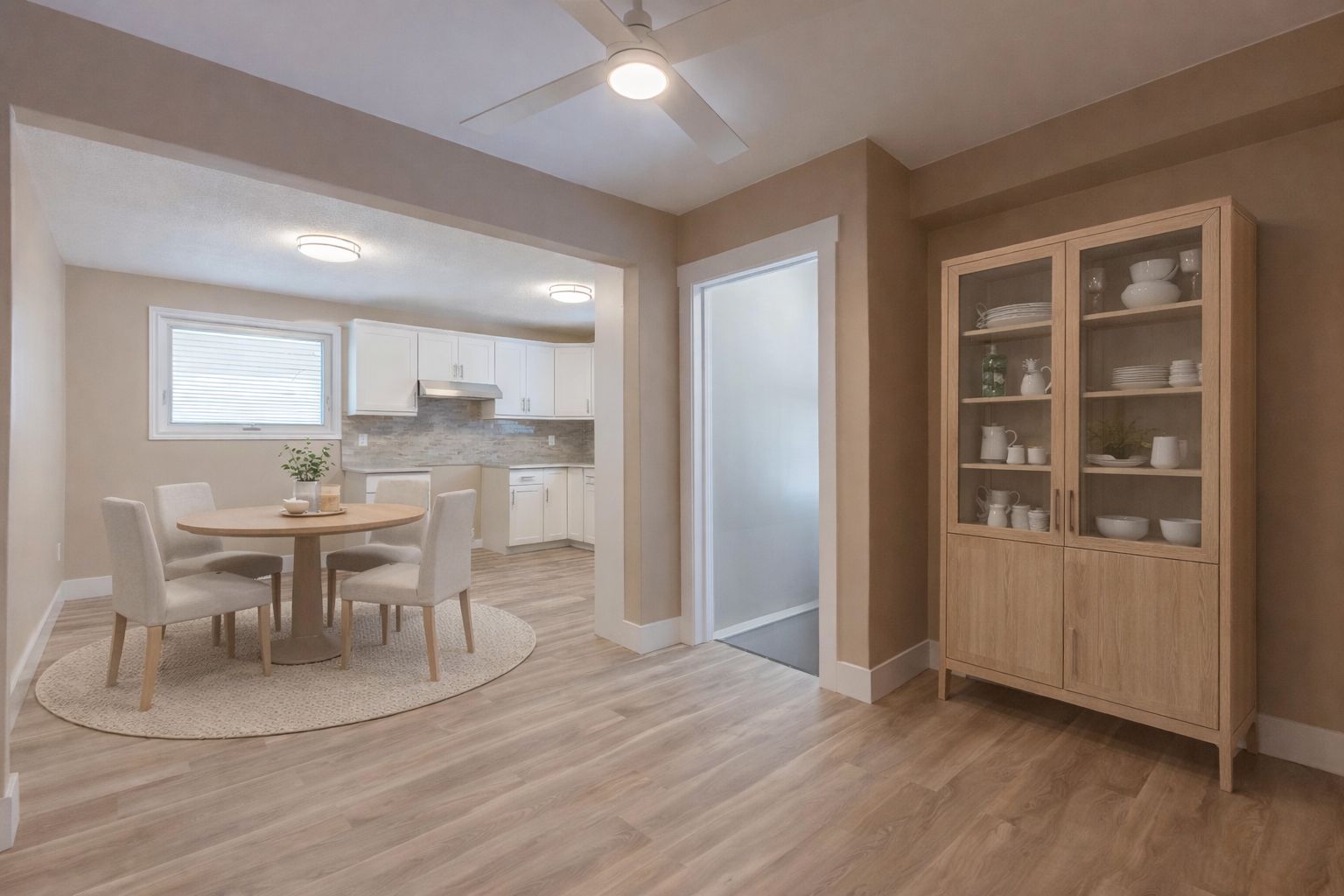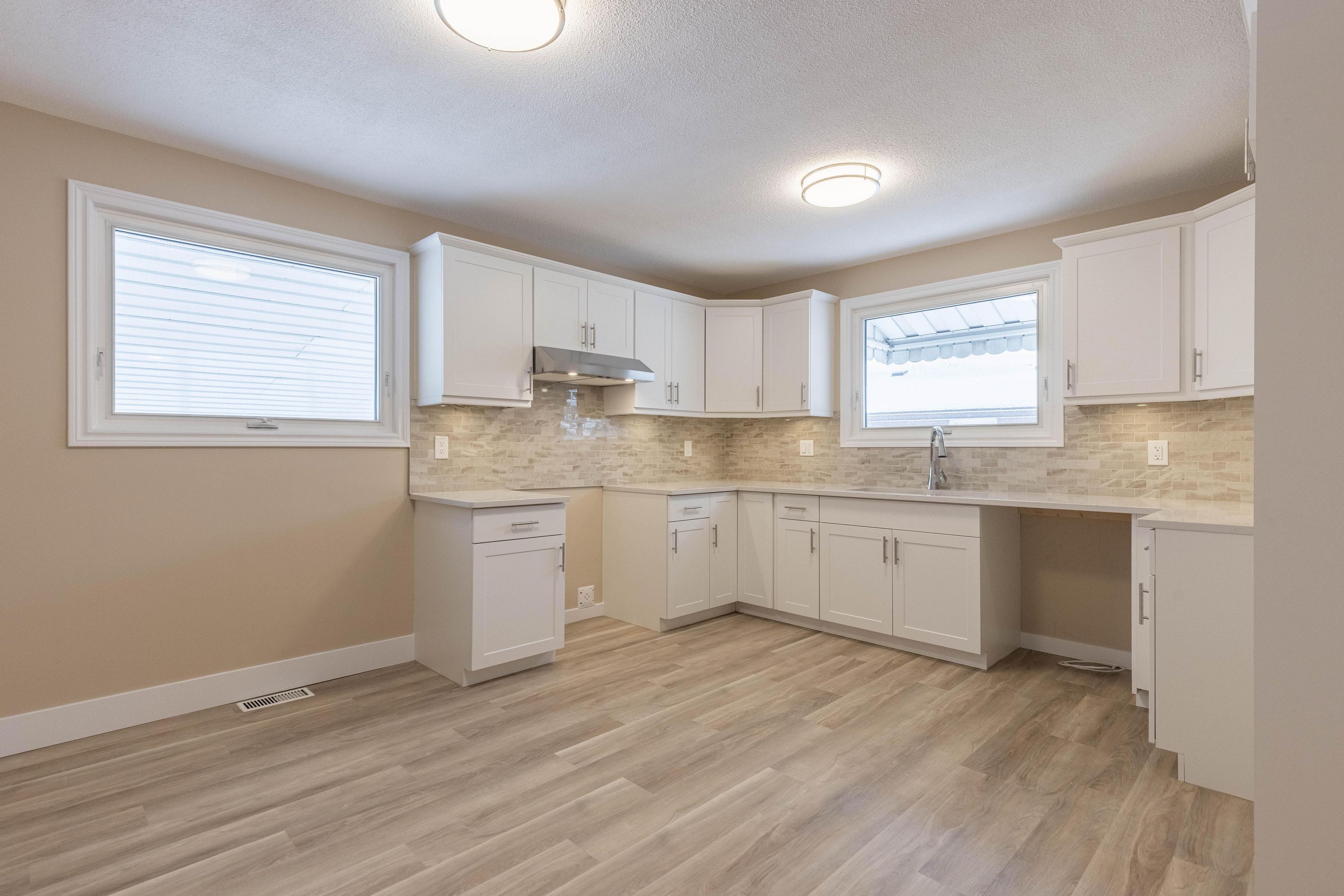 • Renovated kitchen with quartz countertops and modern lighting features.