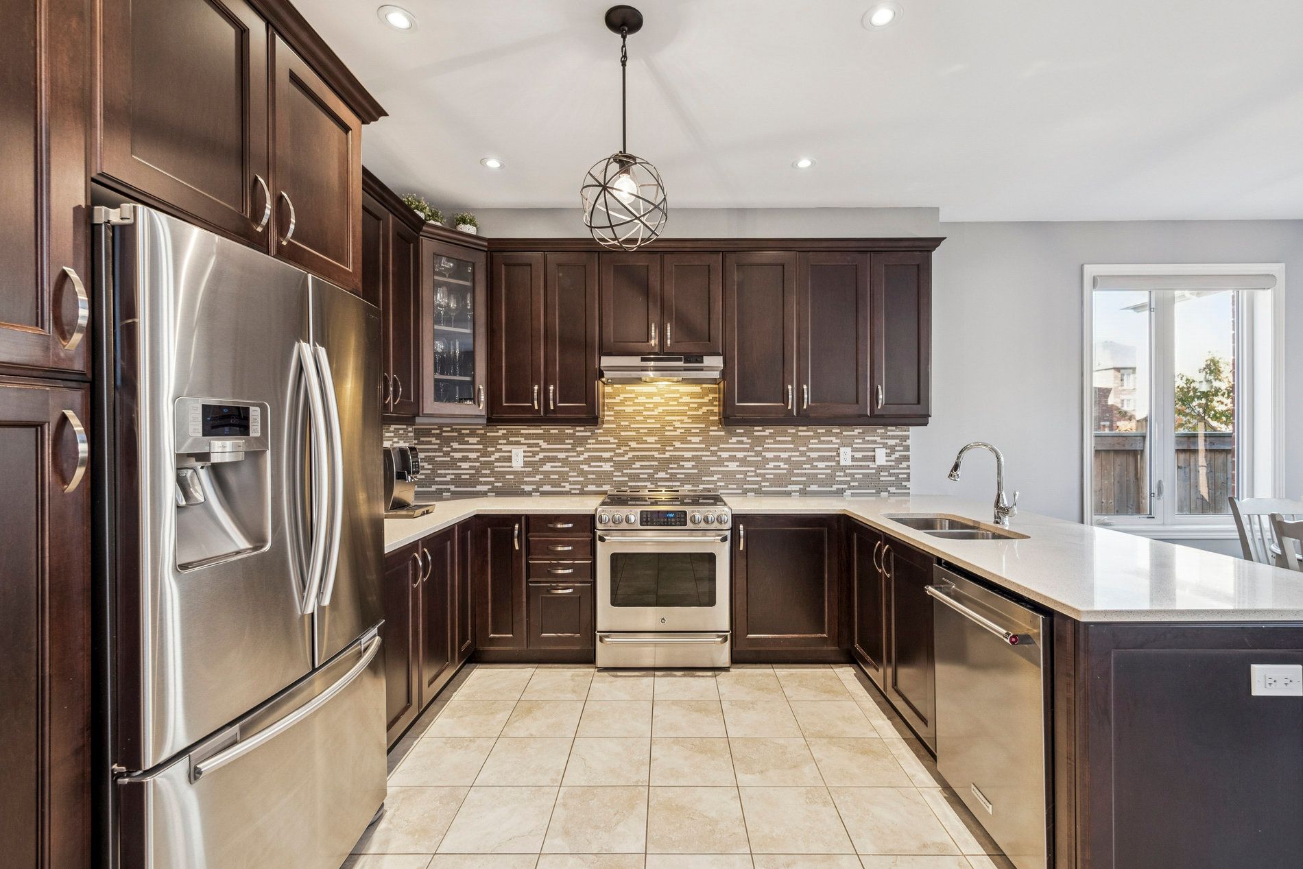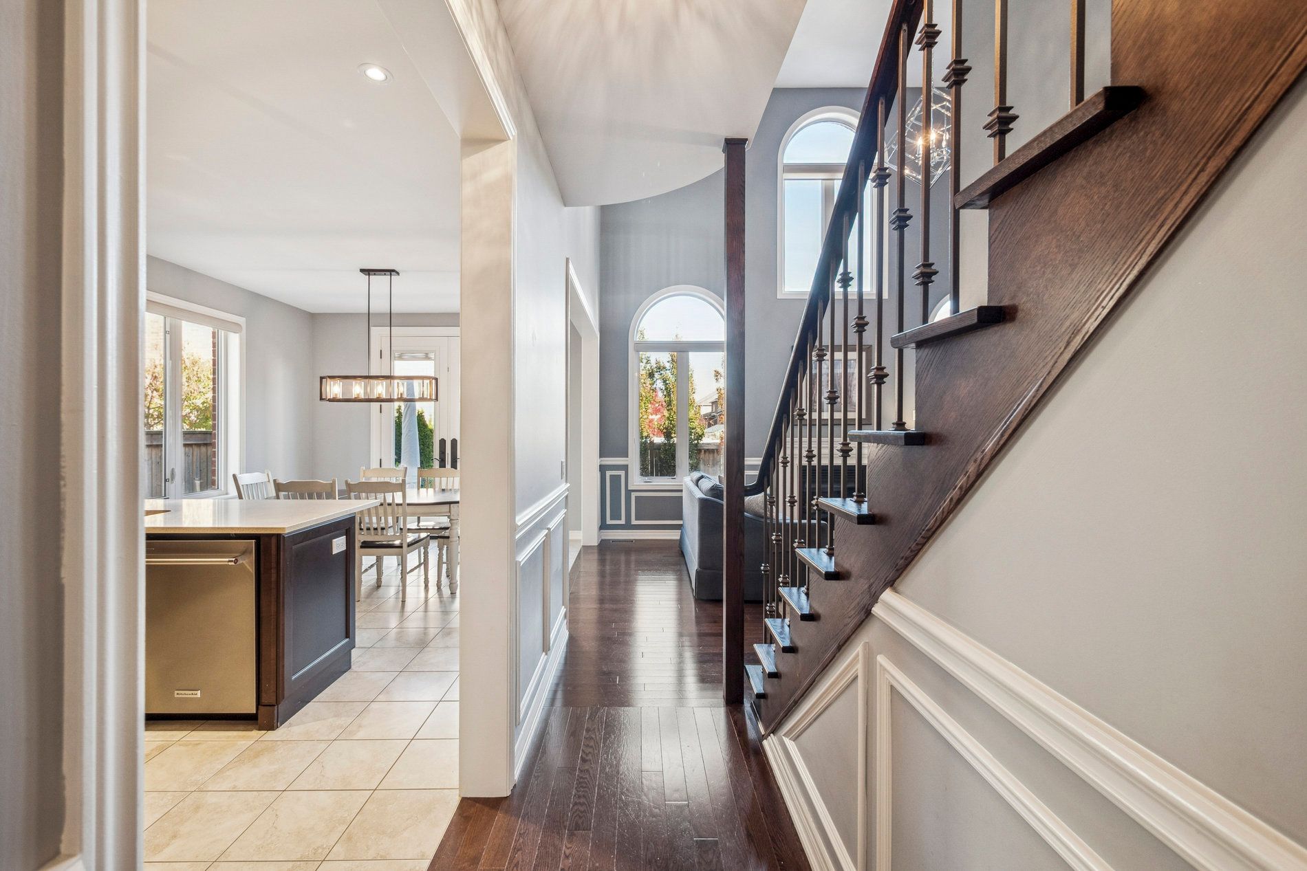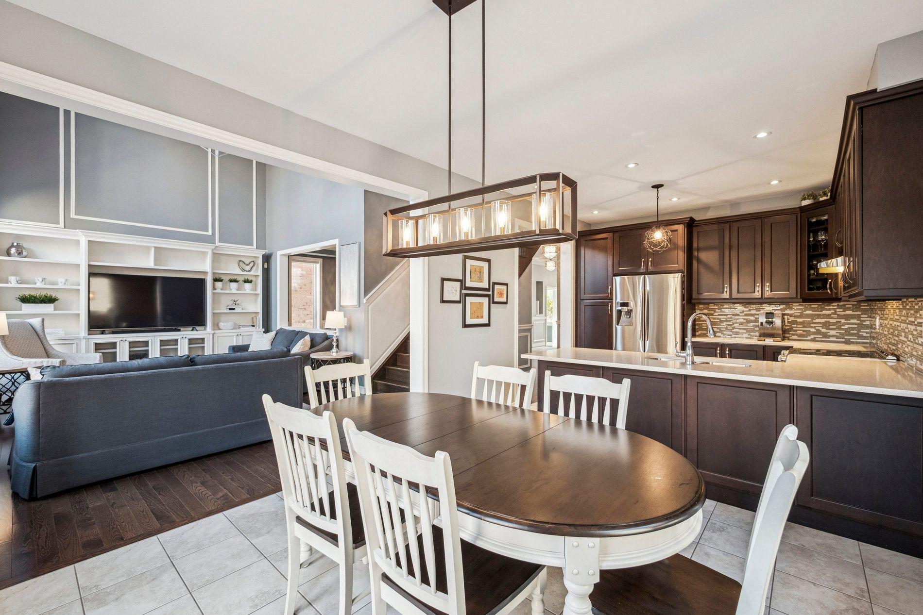 • Modern kitchen features quartz counters and flows into a stylish dining area.