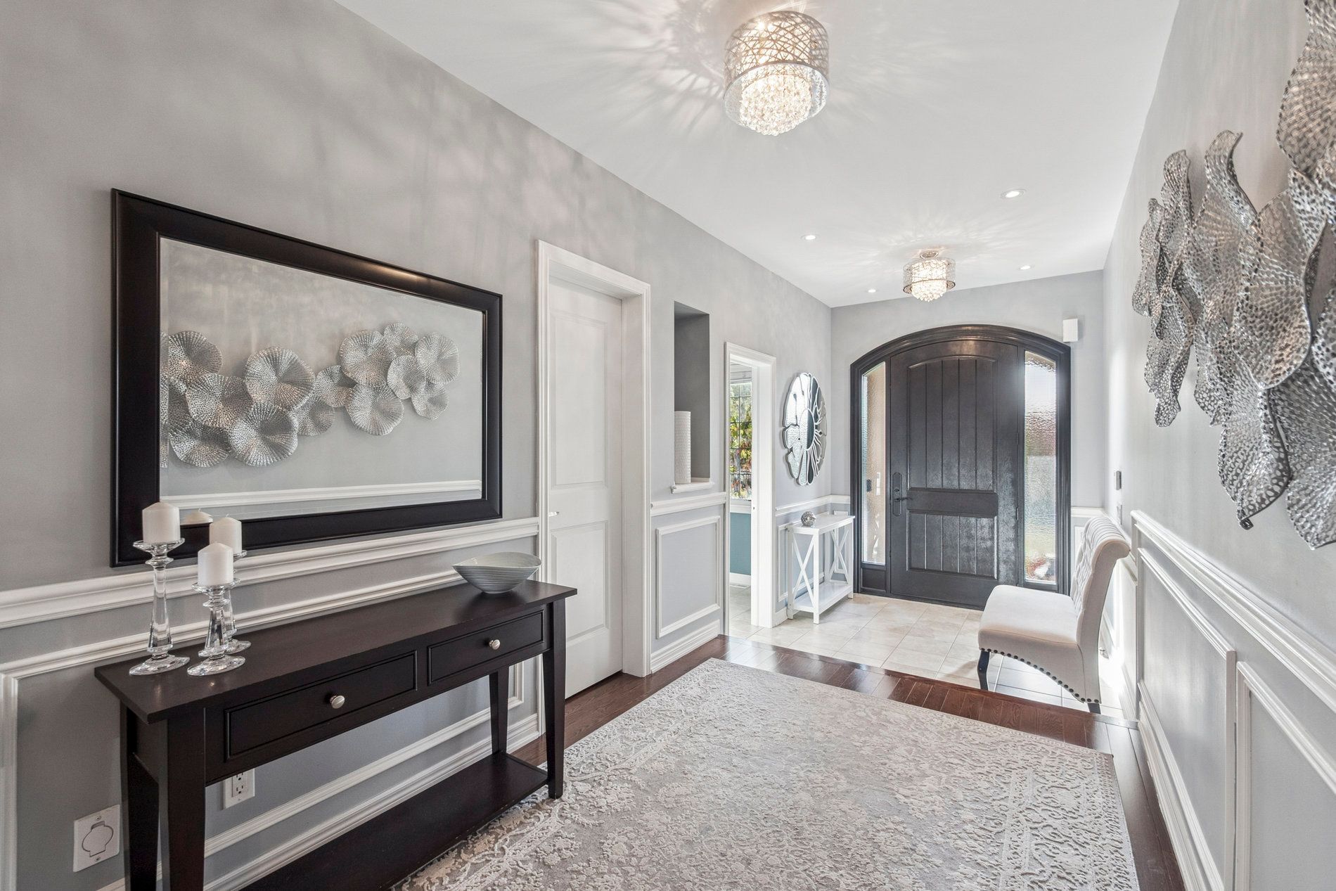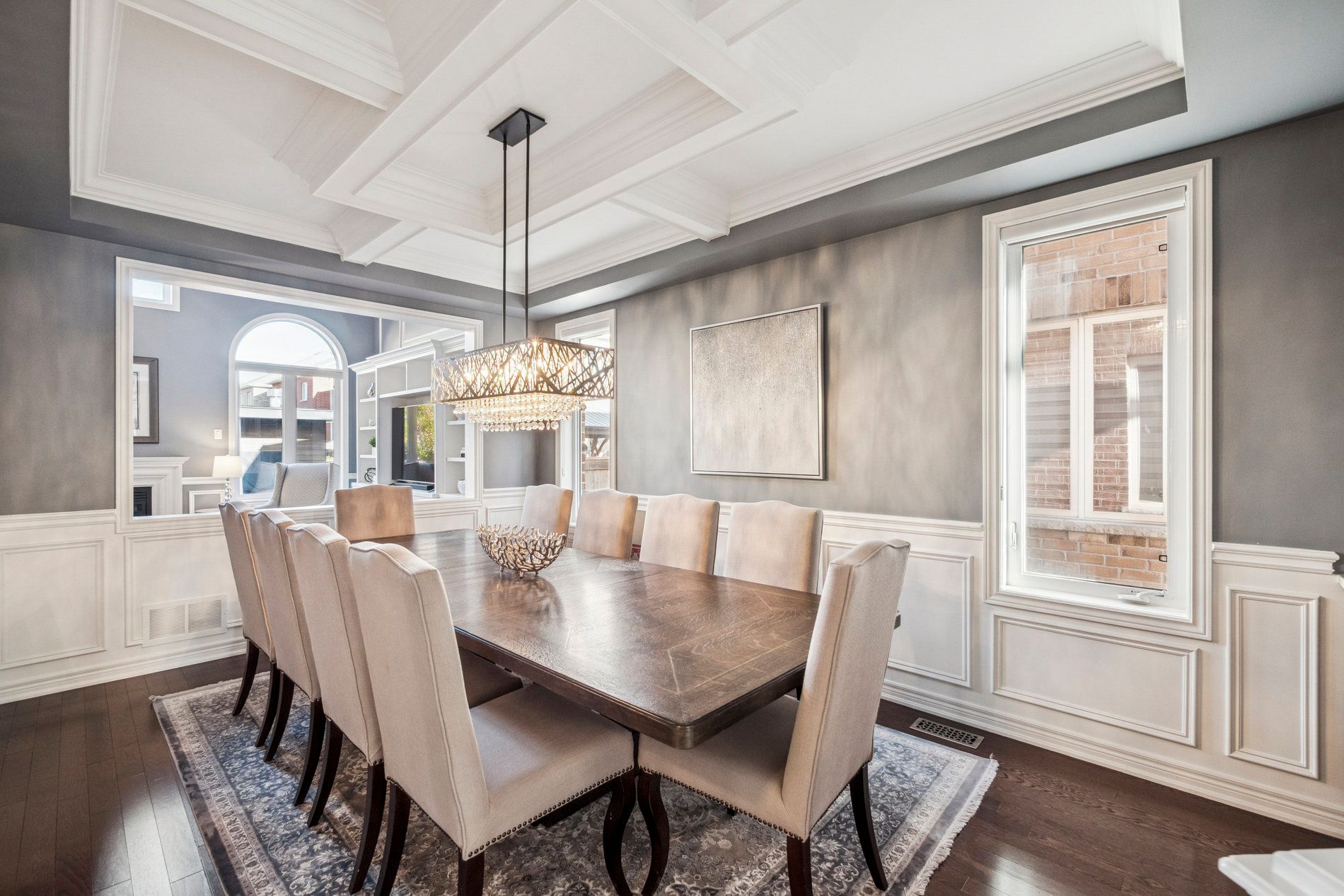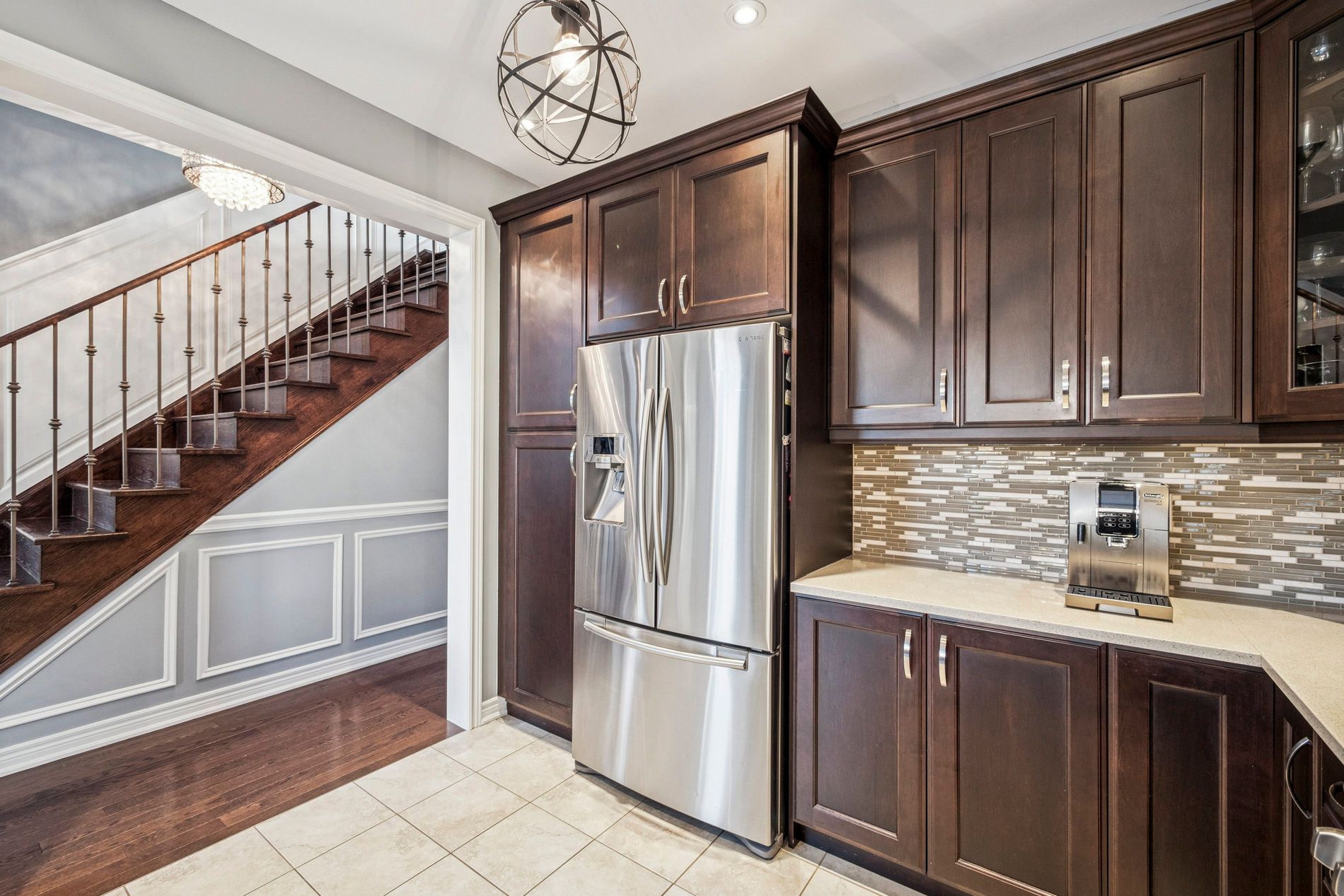 • Modern kitchen features quartz counters and flows into a stylish dining area.
