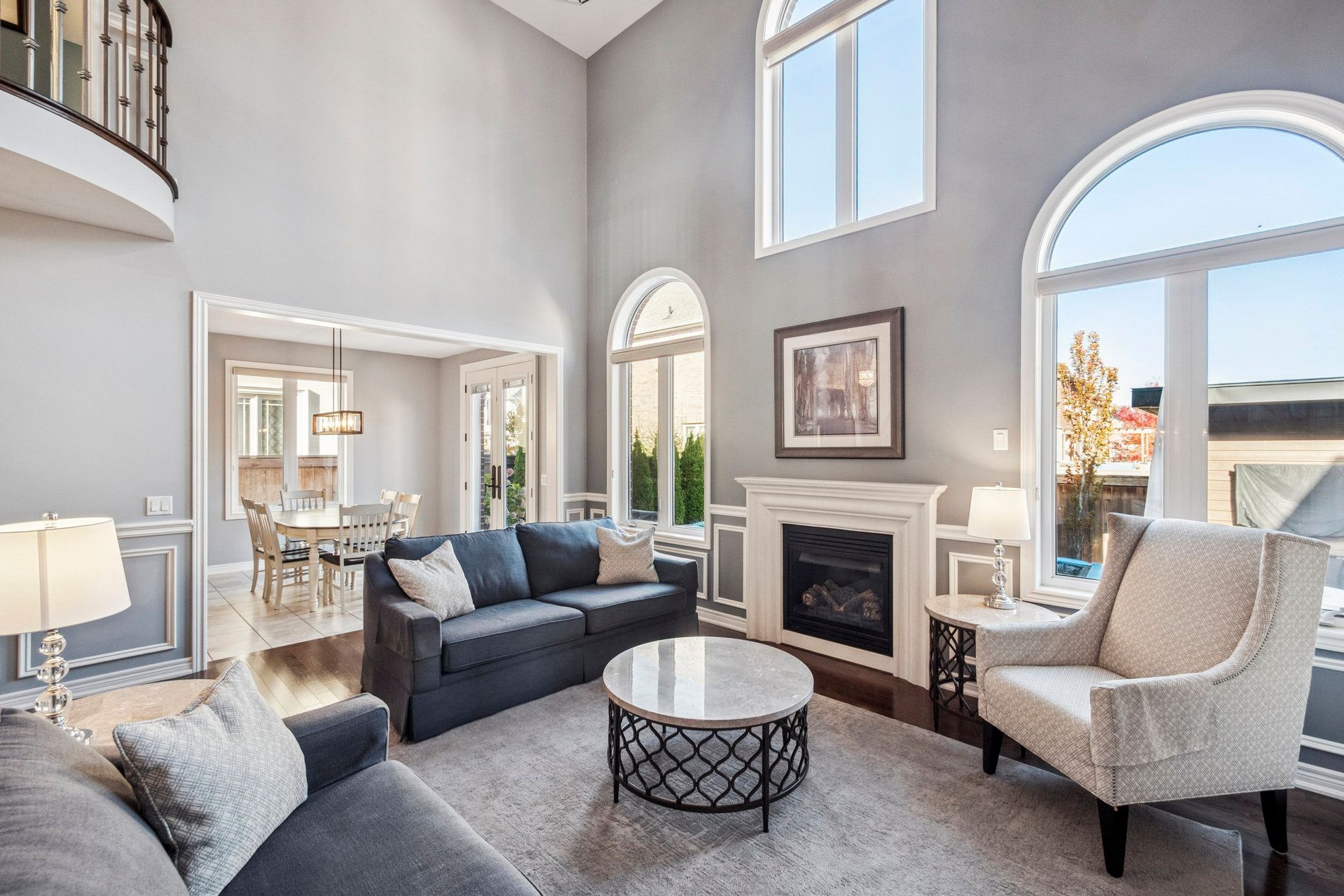 • Open family room with rich maple hardwood floors and dramatic high ceilings.