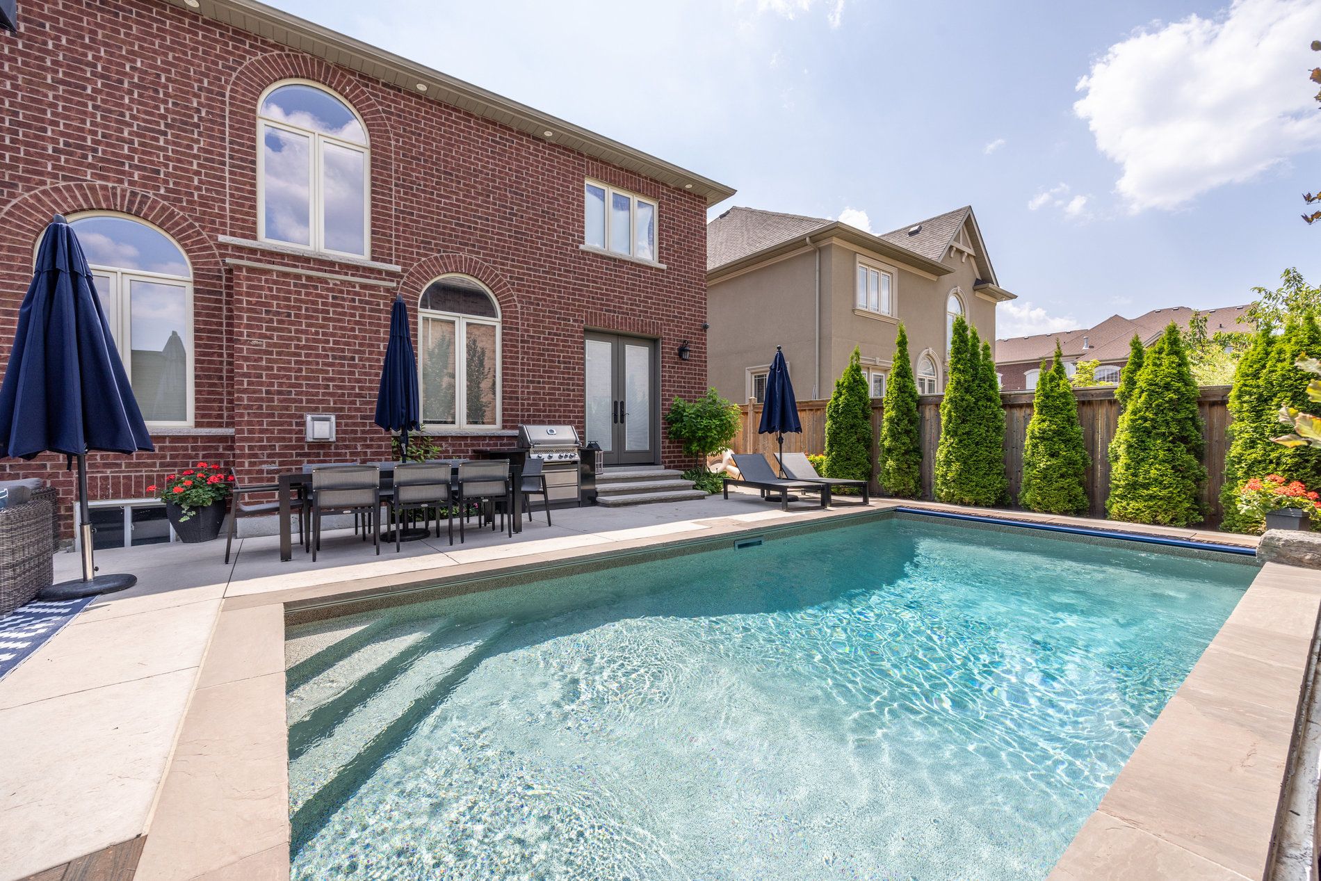• Resort-style backyard with an automated saltwater pool and outdoor BBQ setup.