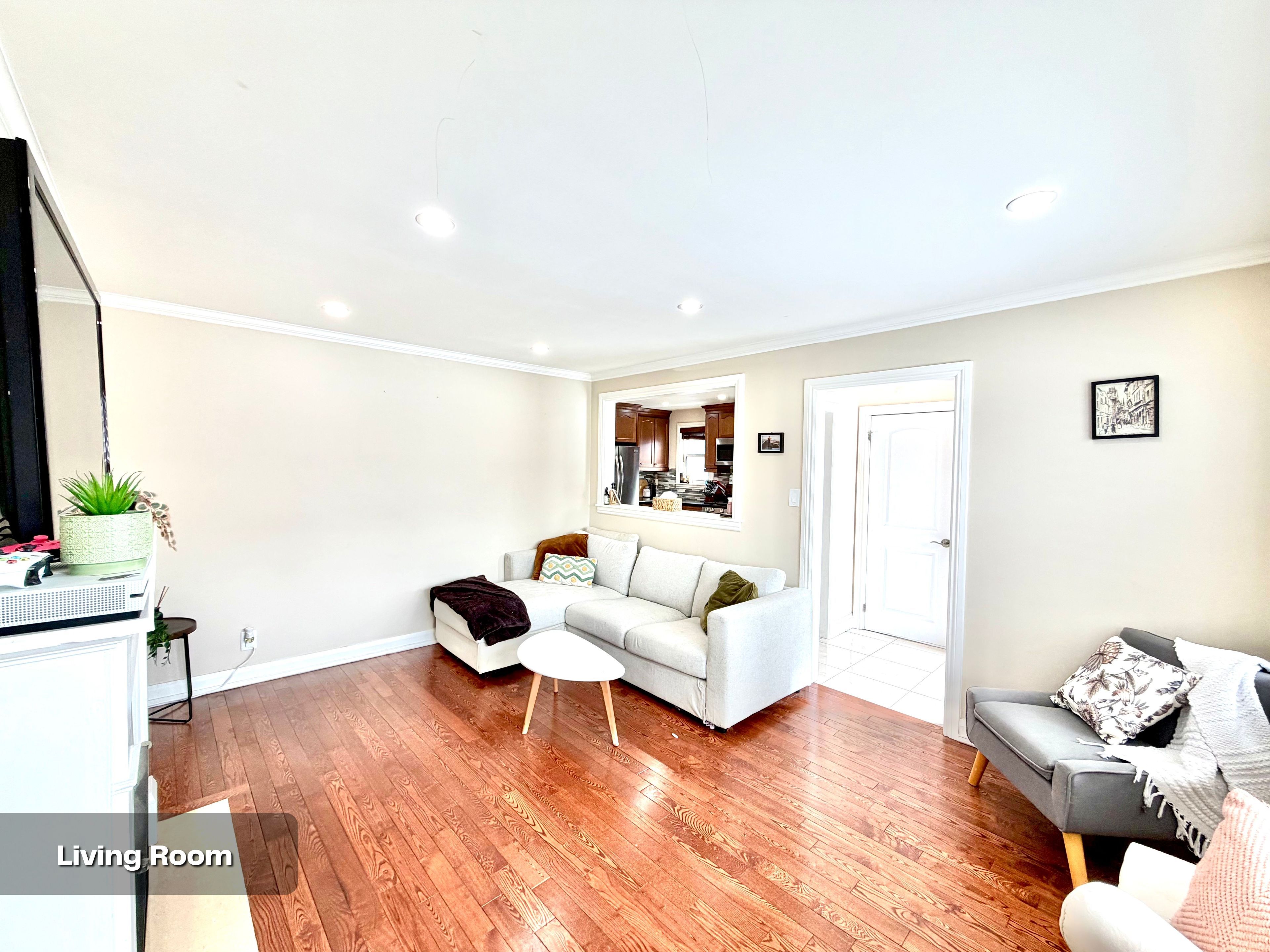 • Spacious living room with hardwood floors and a cozy gas fireplace.