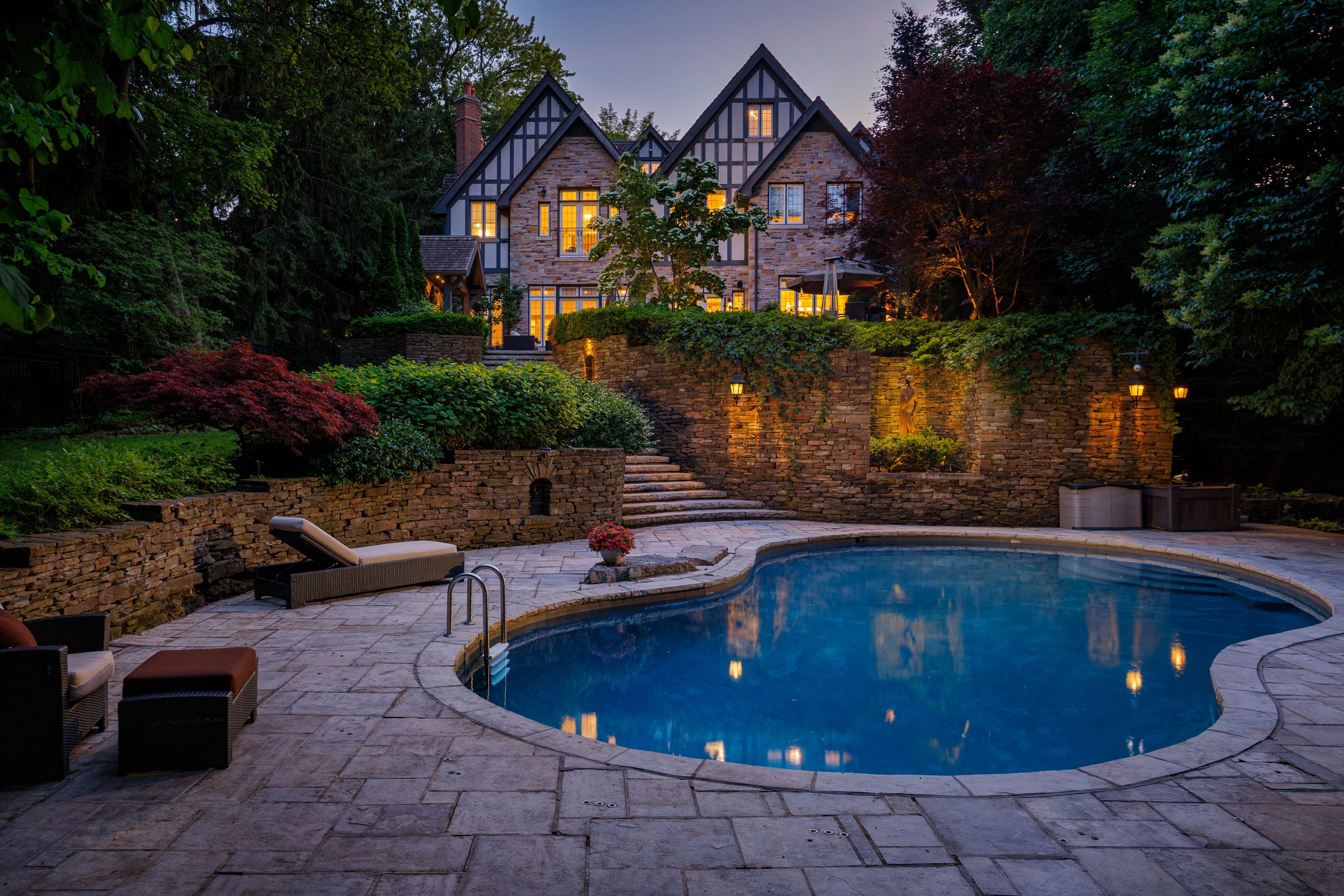Welcome to a truly exceptional estate tucked away in one of the kingsway's most coveted, family-friendly enclaves. Perfectly positioned on a breathtaking ravine lot, this majestic custom-built tudor-style home offers the ultimate in luxury, privacy, and natural beauty. Enjoy a resort-inspired backyard oasis complete with a stunning pool, lush landscaping, and endless space to entertain. Inside, the beautifully renovated chef's kitchen is the heart of the home - thoughtfully designed for both everyday living and large gatherings. Expansive windows throughout invite spectacular ravine views into nearly every room, filling the home with natural light. With approximately 10,000 sq ft of luxurious living space, this remarkable residence offers 7+2 spacious bedrooms, including an opulent primary suite with a private sitting area, custom dressing room, and spa-like ensuite. Heated floors in the bathrooms add another layer of comfort. This is a rare opportunity to live in a quiet, prestigious pocket that offers incredible convenience. Walk to top-rated schools like our lady of sorrows (ols) and lambton kingsway junior middle school (lks), stroll to nearby parks, shops, and the subway, and enjoy effortless access to downtown and major highways. This is more than a home it's a lifestyle.