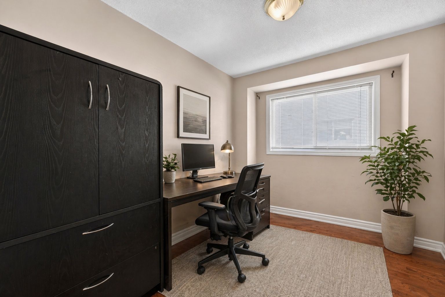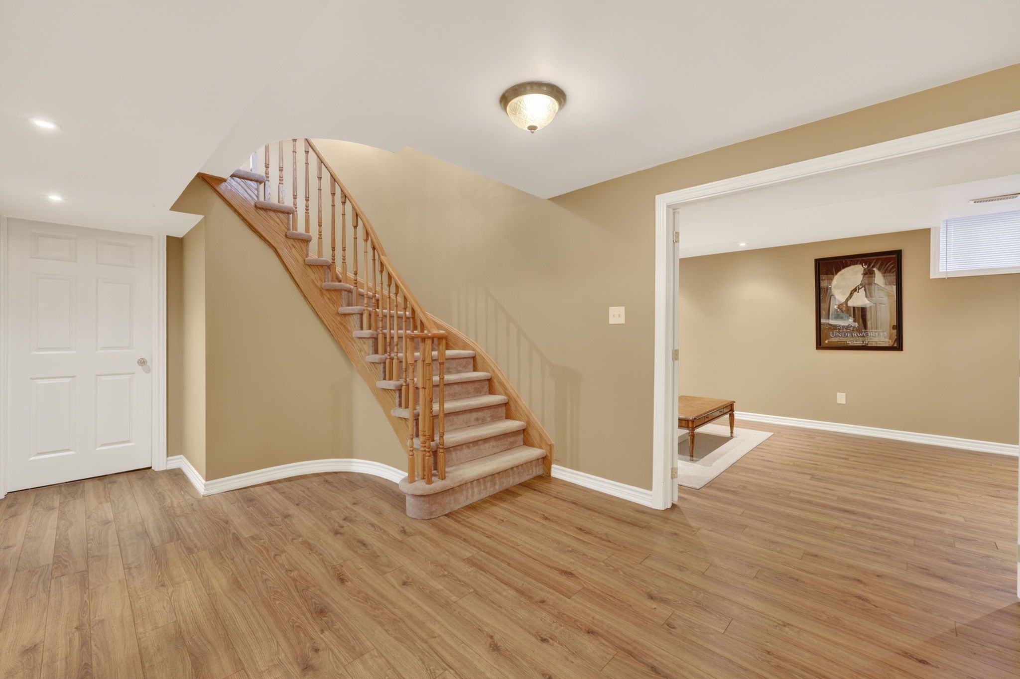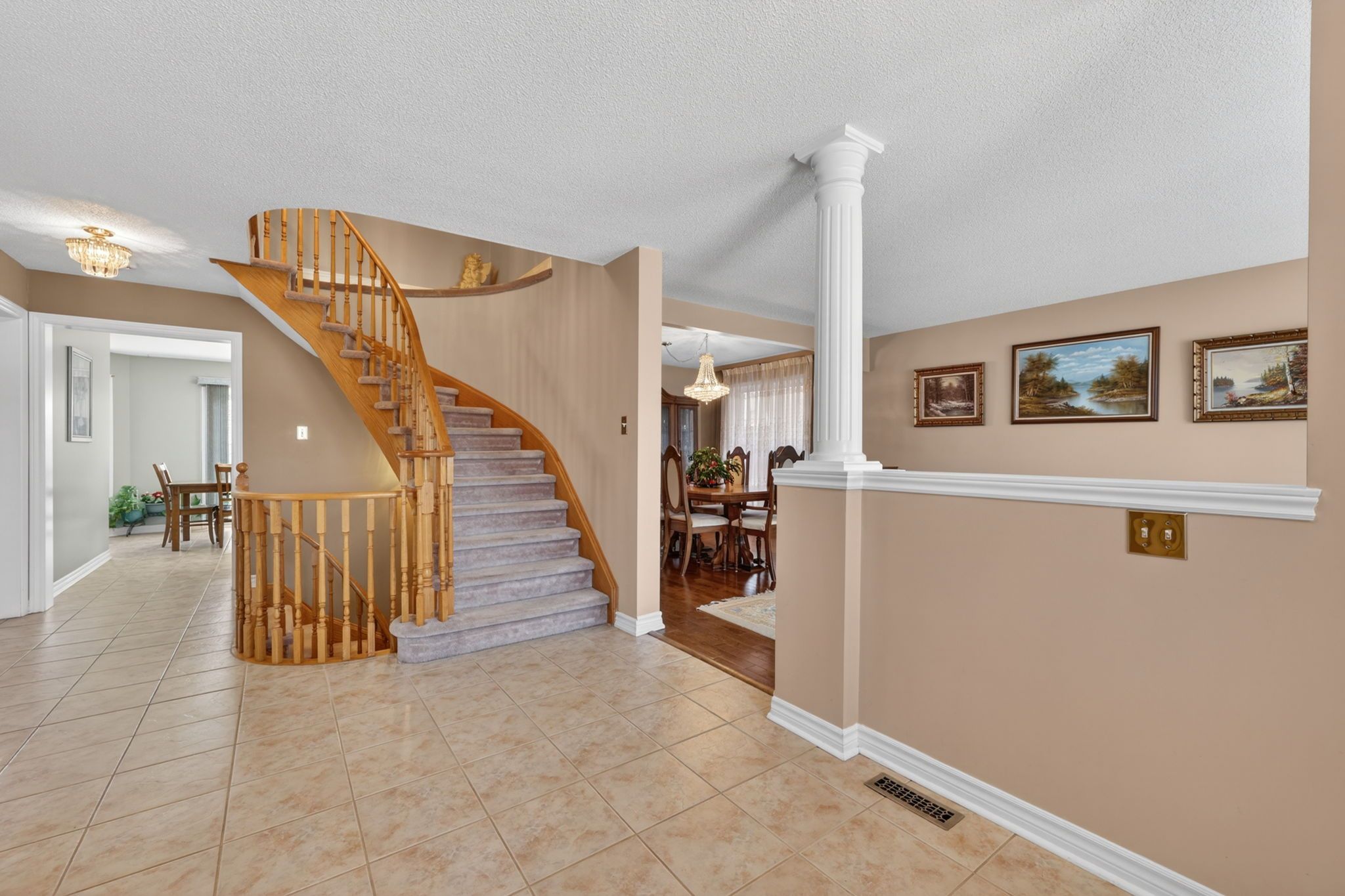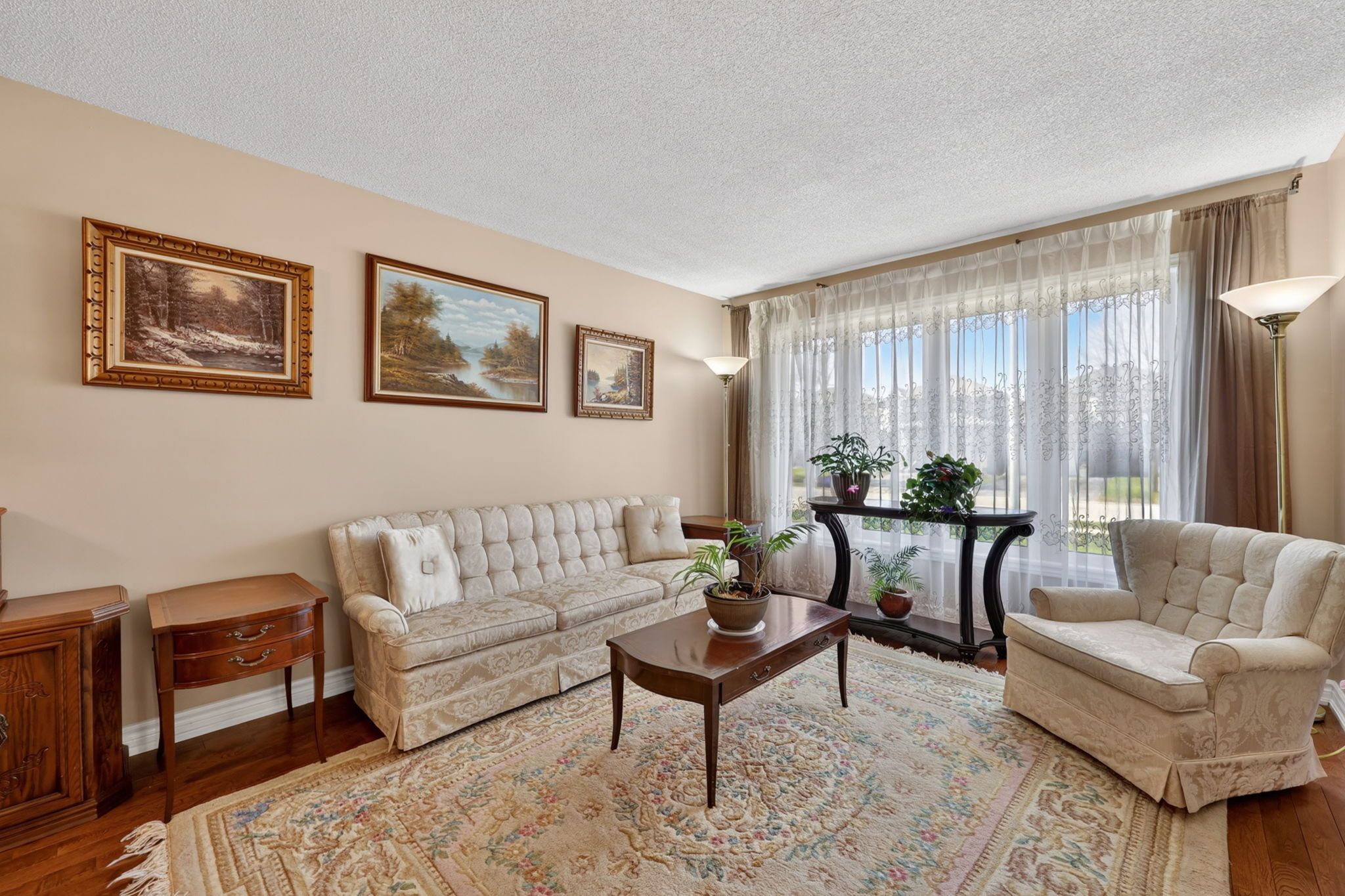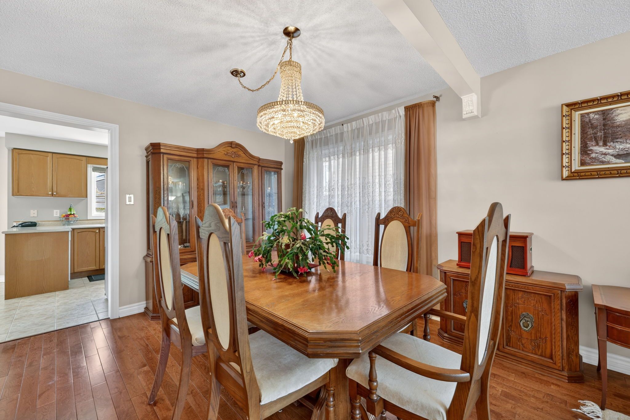 • Formal great room and dining area with hardwood flooring and large windows.