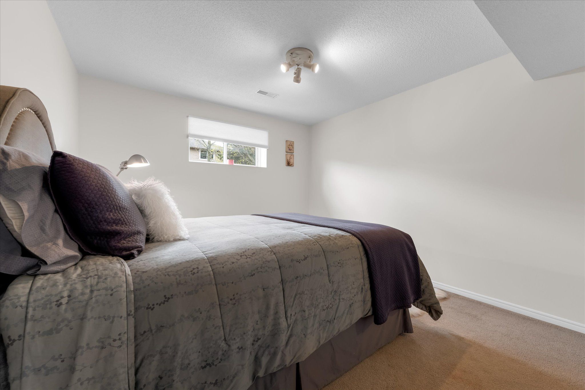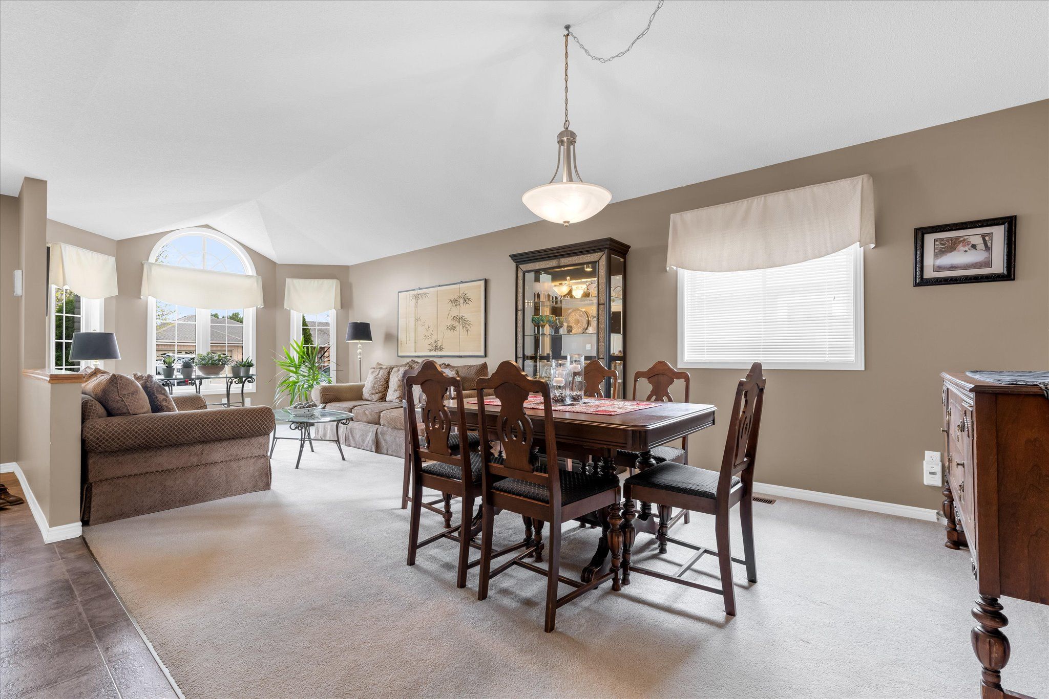 • Bright living room with vaulted ceiling and elegant bay-style windows.