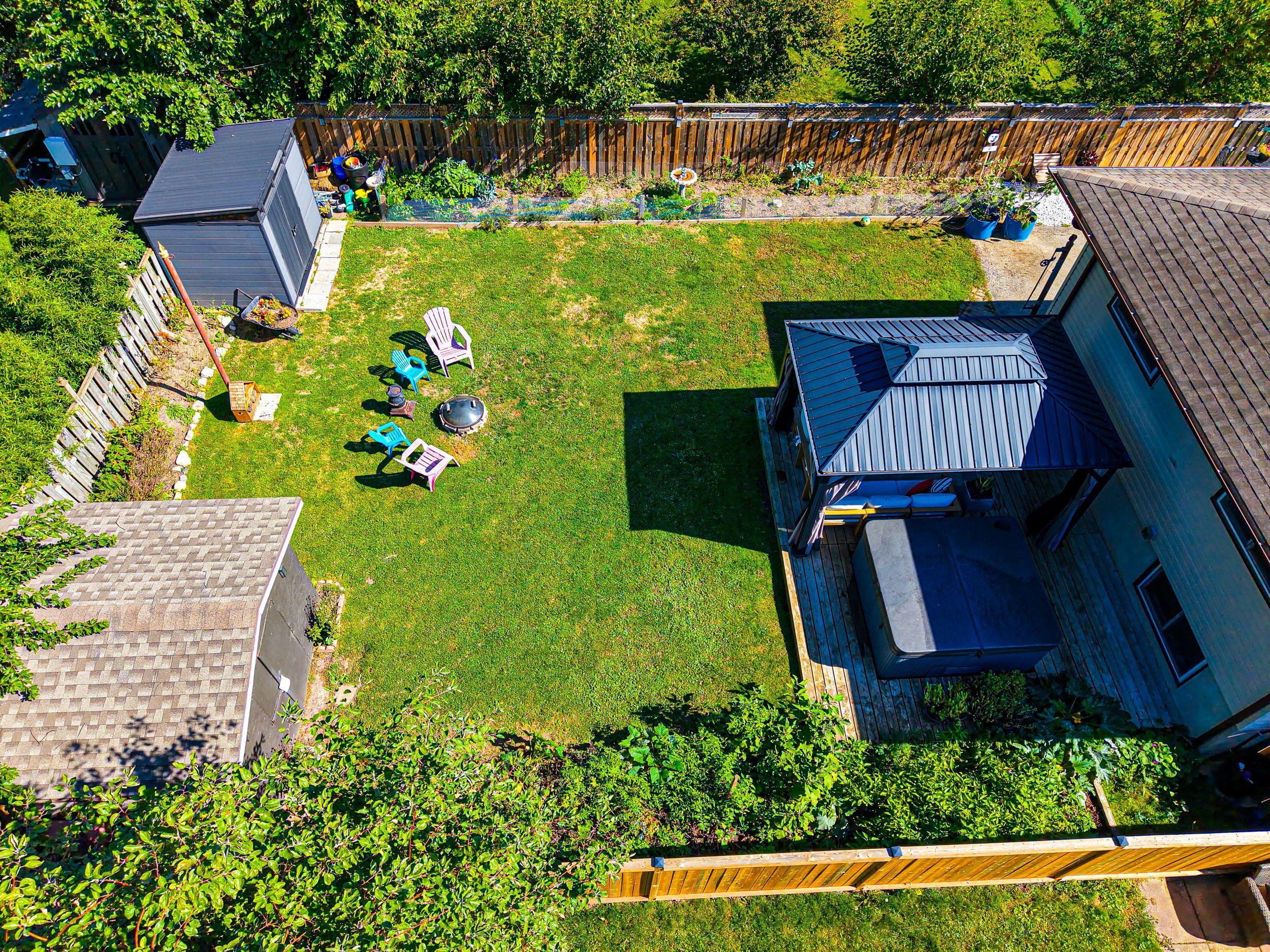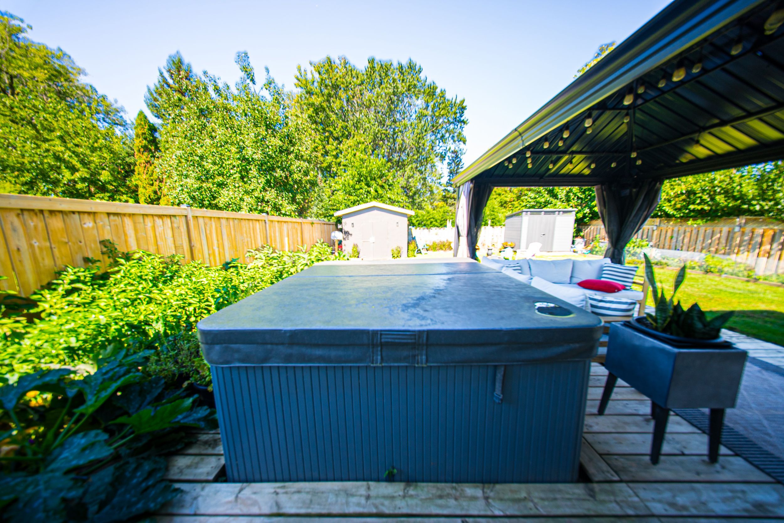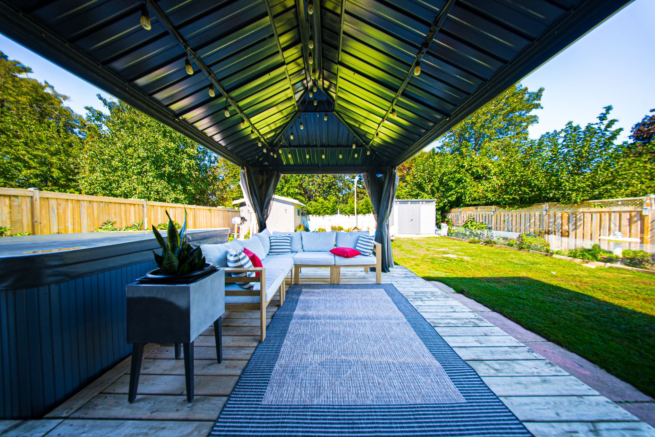 • Private backyard oasis with hot tub, deck, and gazebo for relaxing and entertaining.
