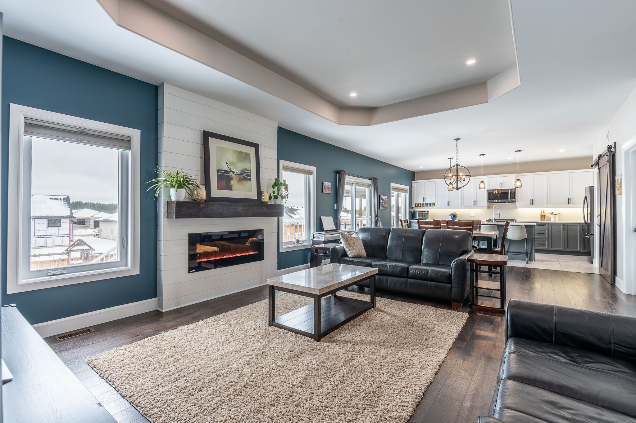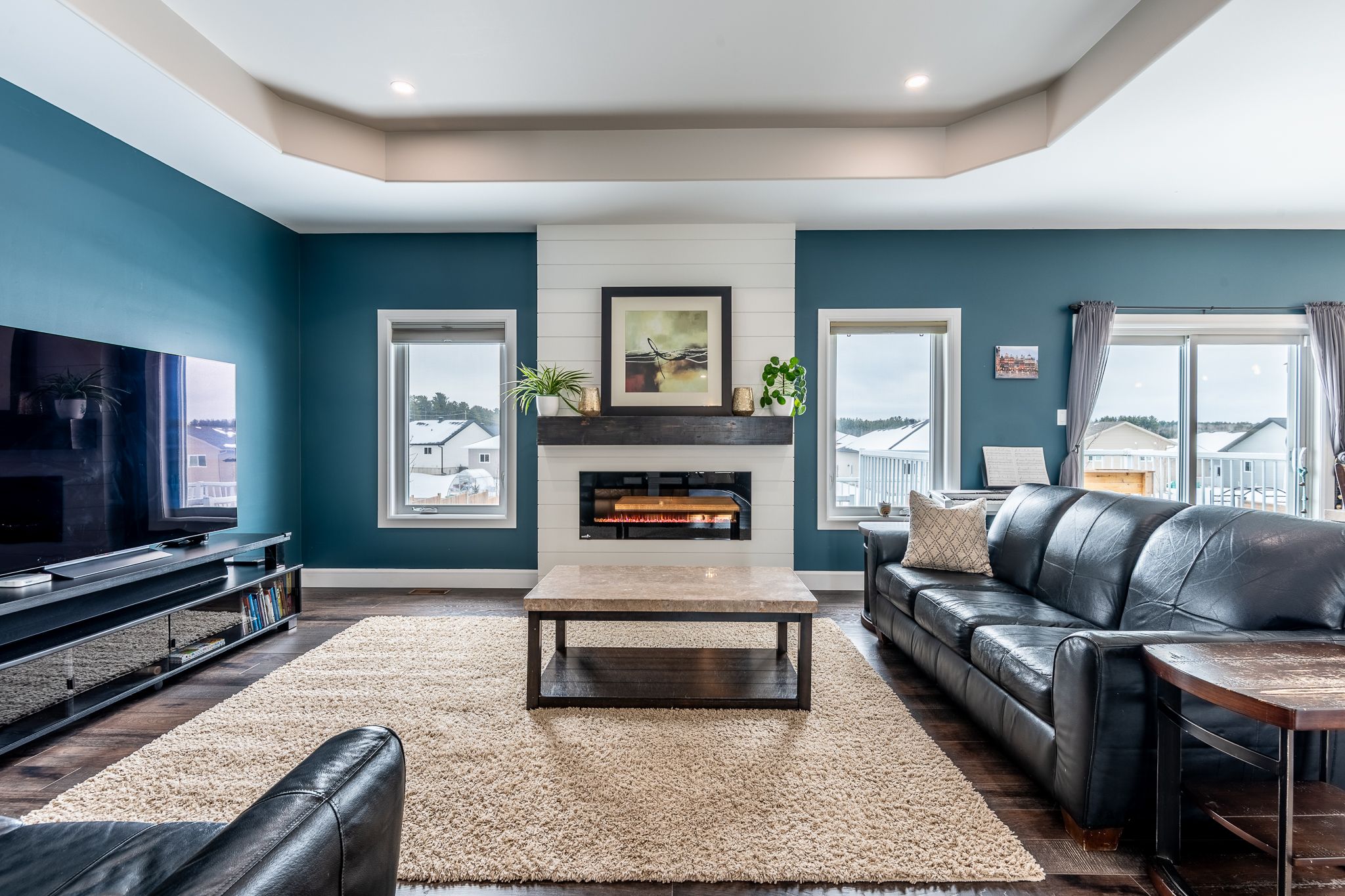 • Bright open-concept main floor with a gas fireplace and tray ceiling.
