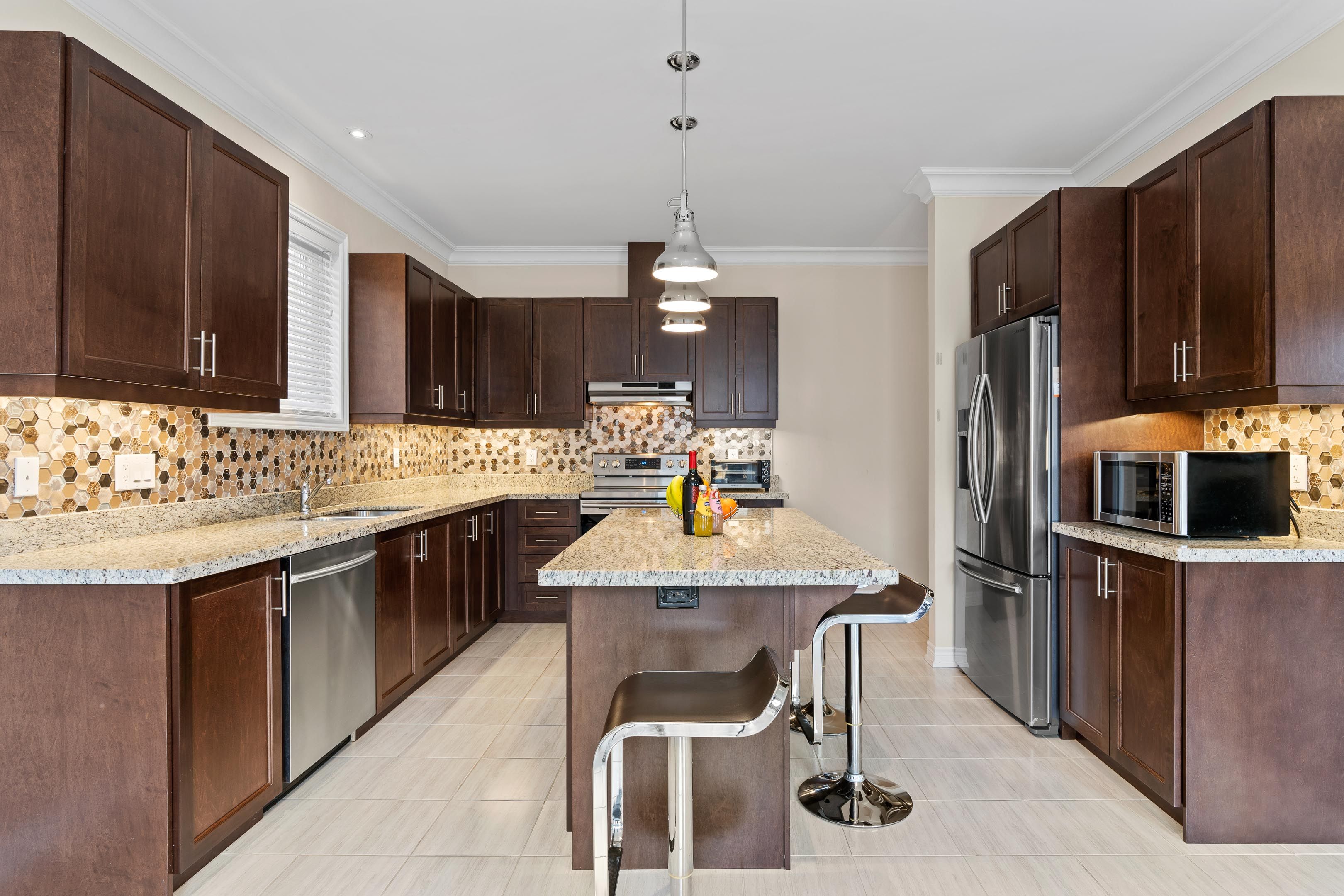 • Modern kitchen features granite island and loads of storage.