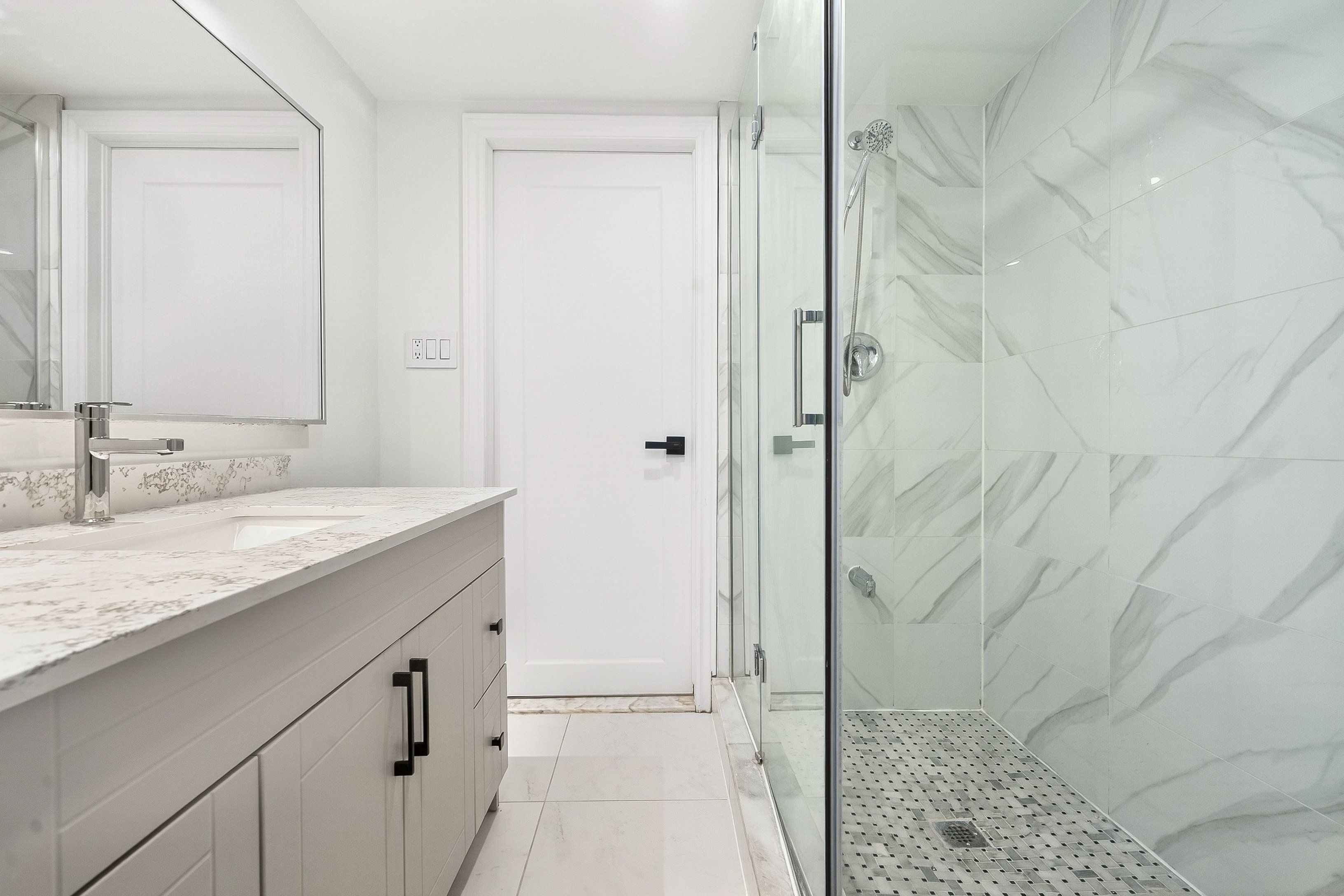 • Custom bathroom with frameless glass walk-in shower for a modern touch.