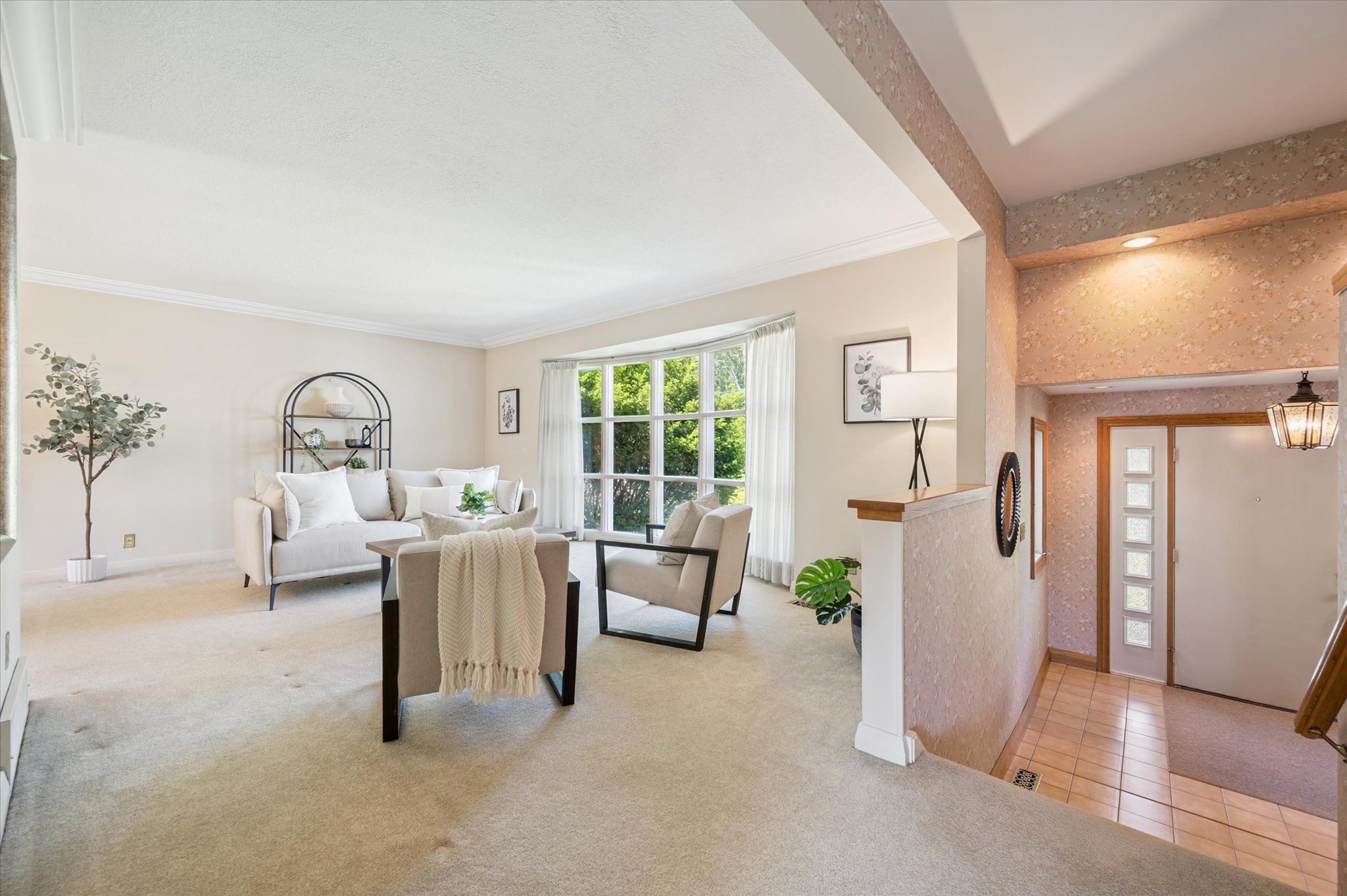 • Large, private backyard with mature landscaping and a deck for relaxation.