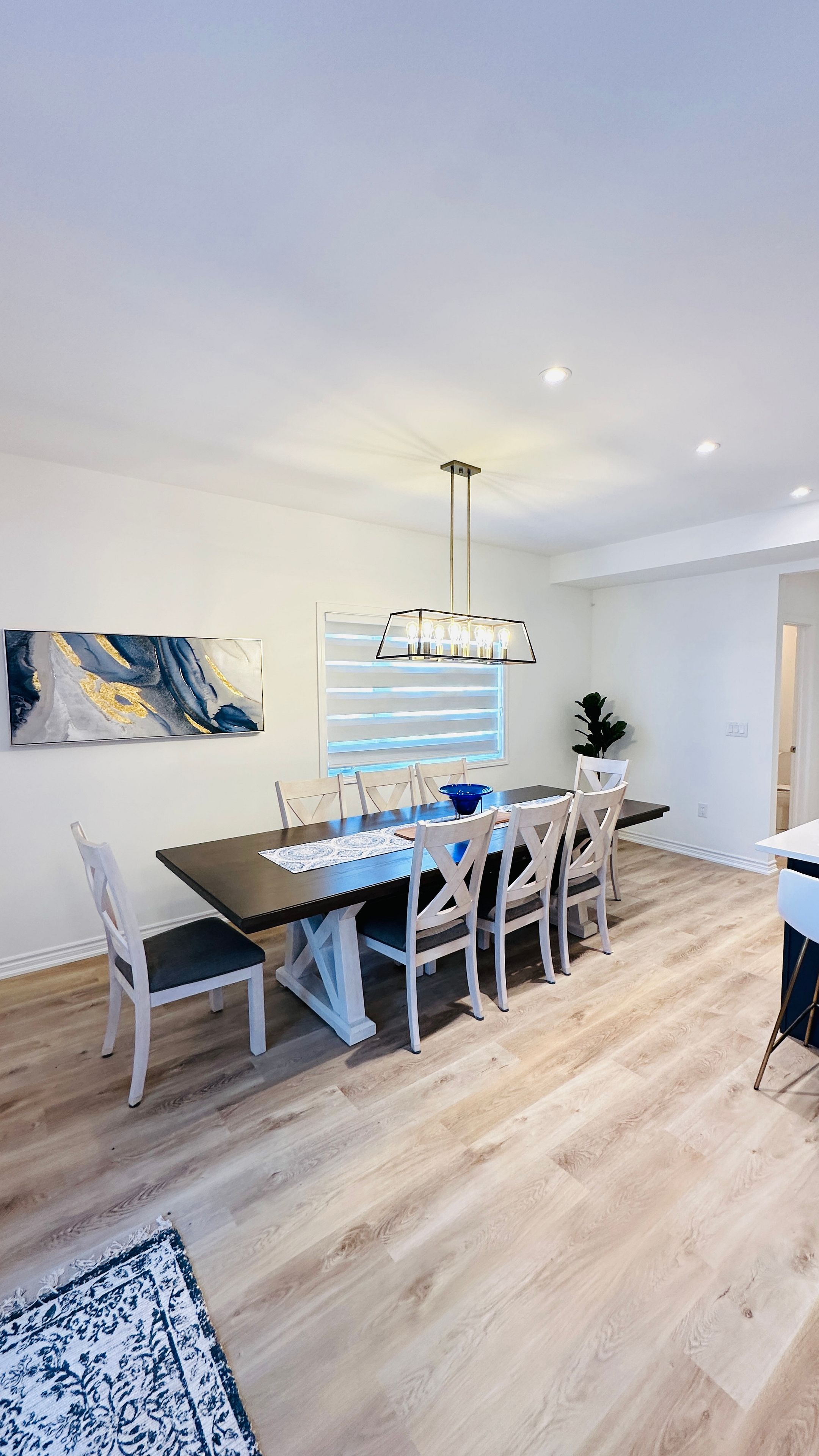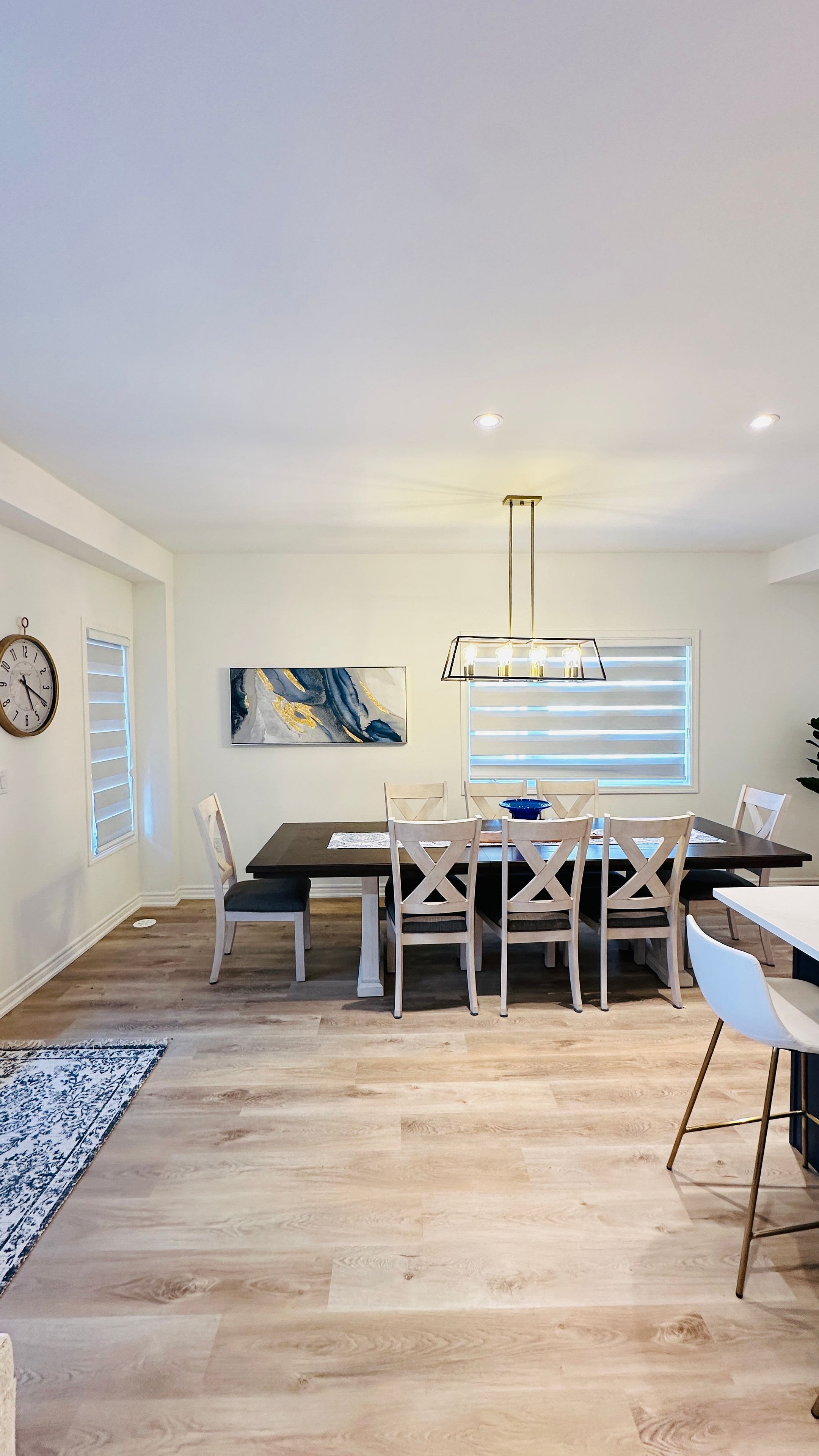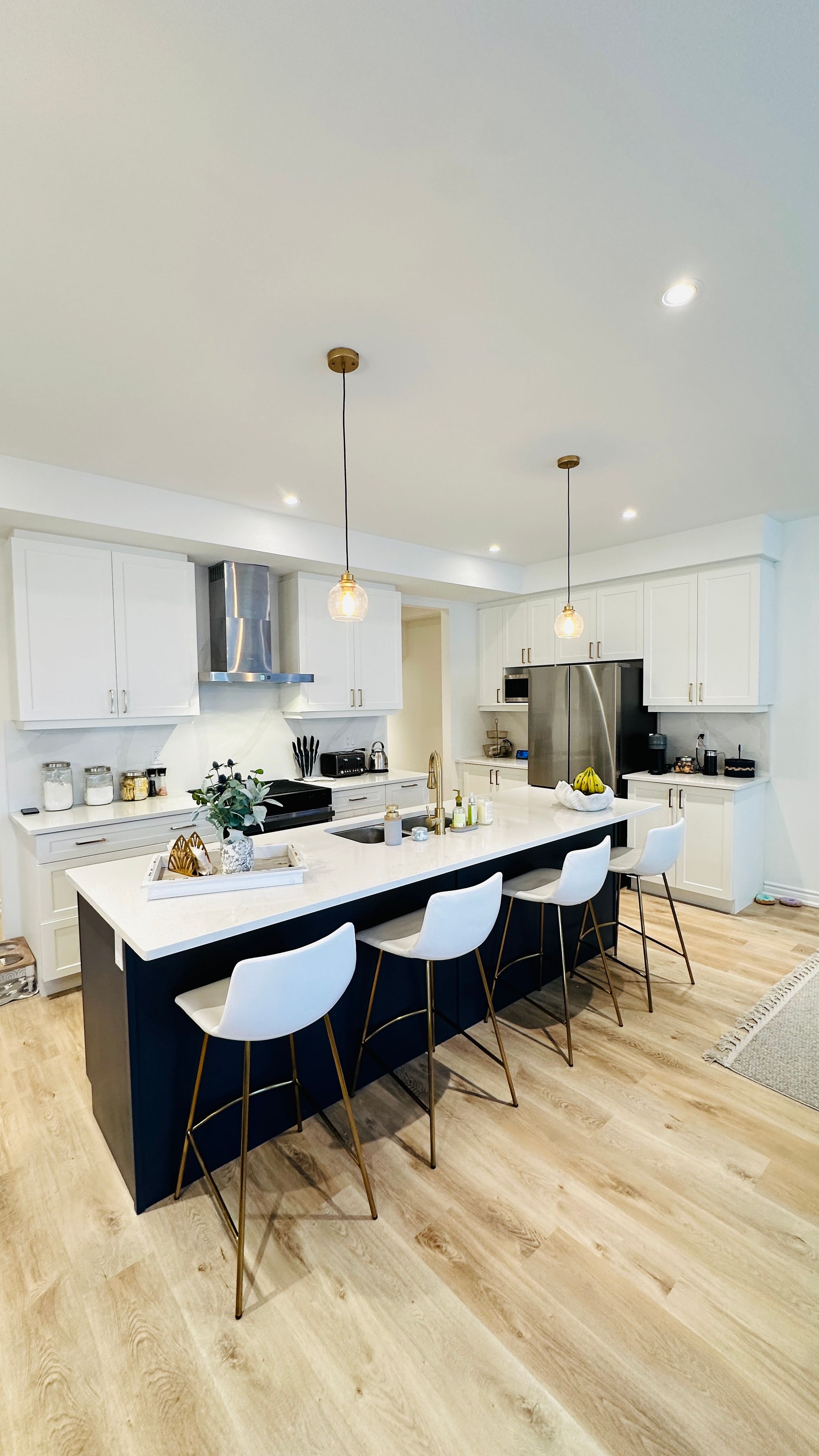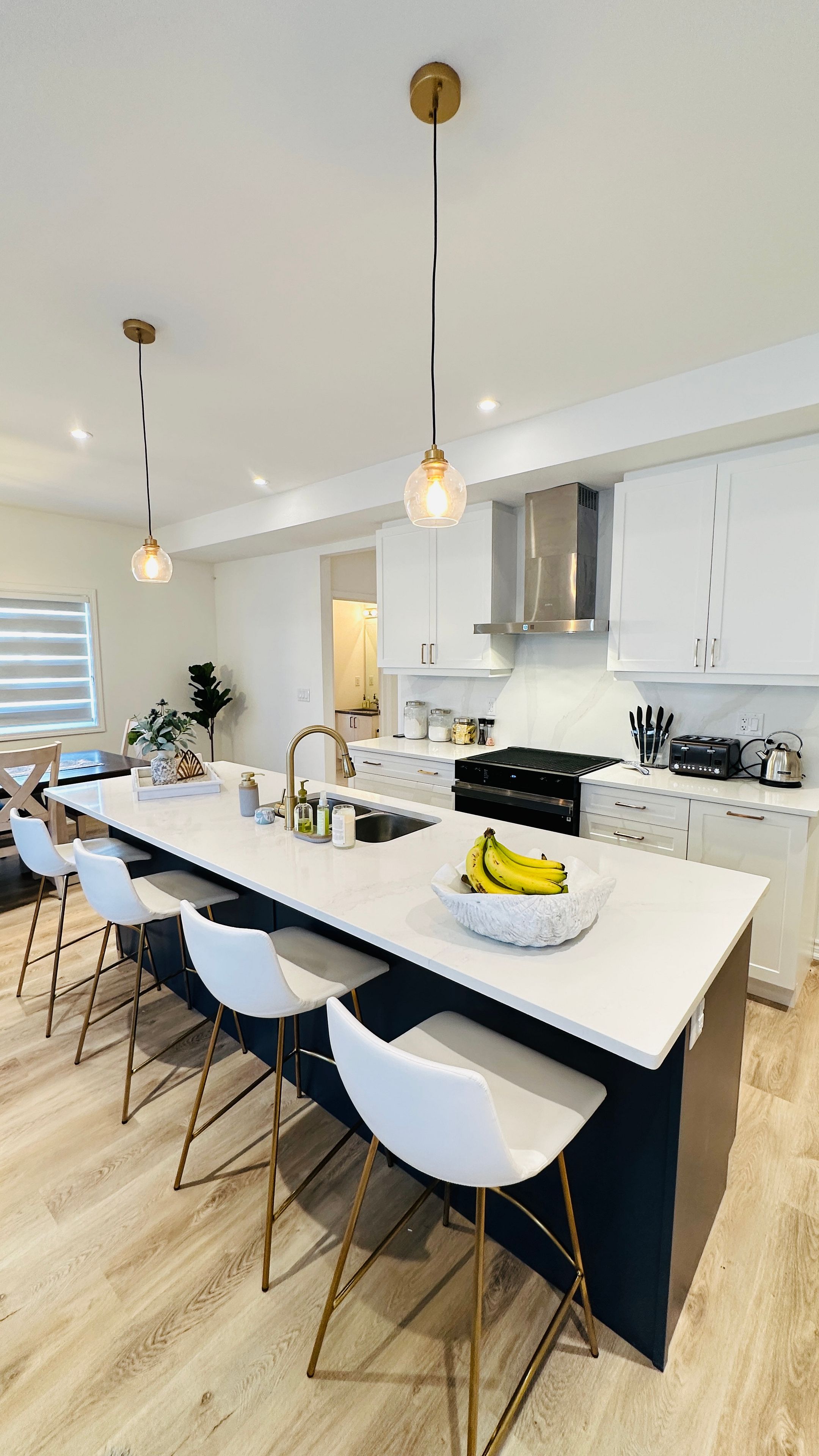 • Modern kitchen features quartz counters, quality appliances, and breakfast seating.
