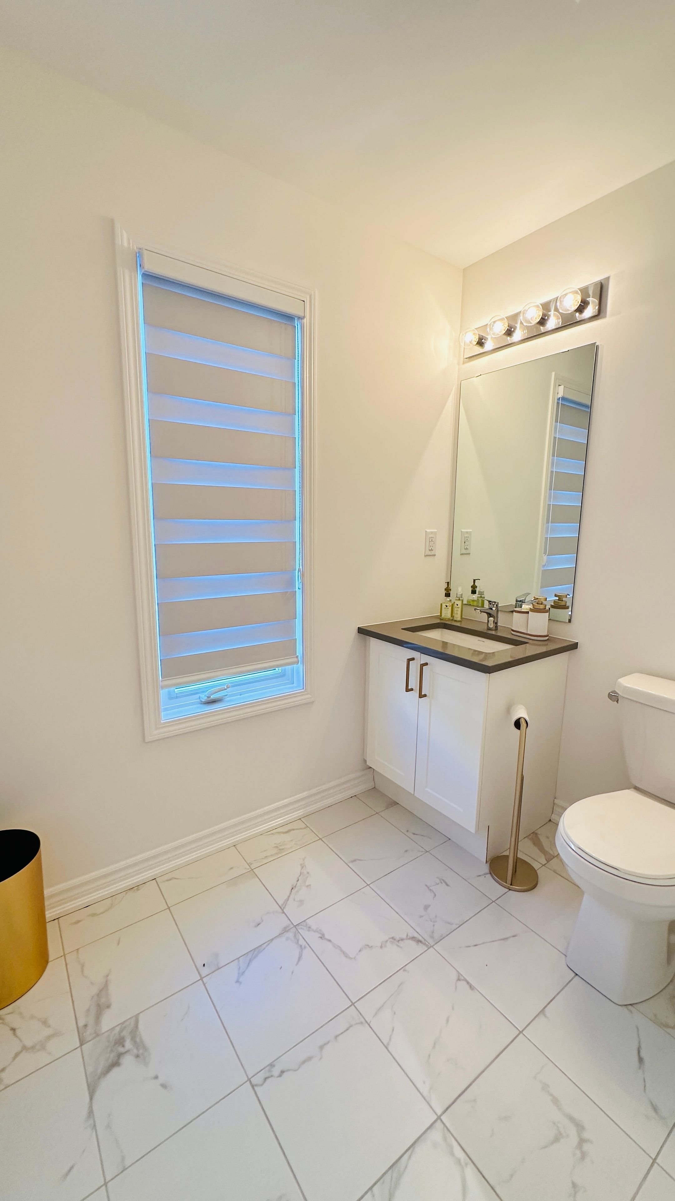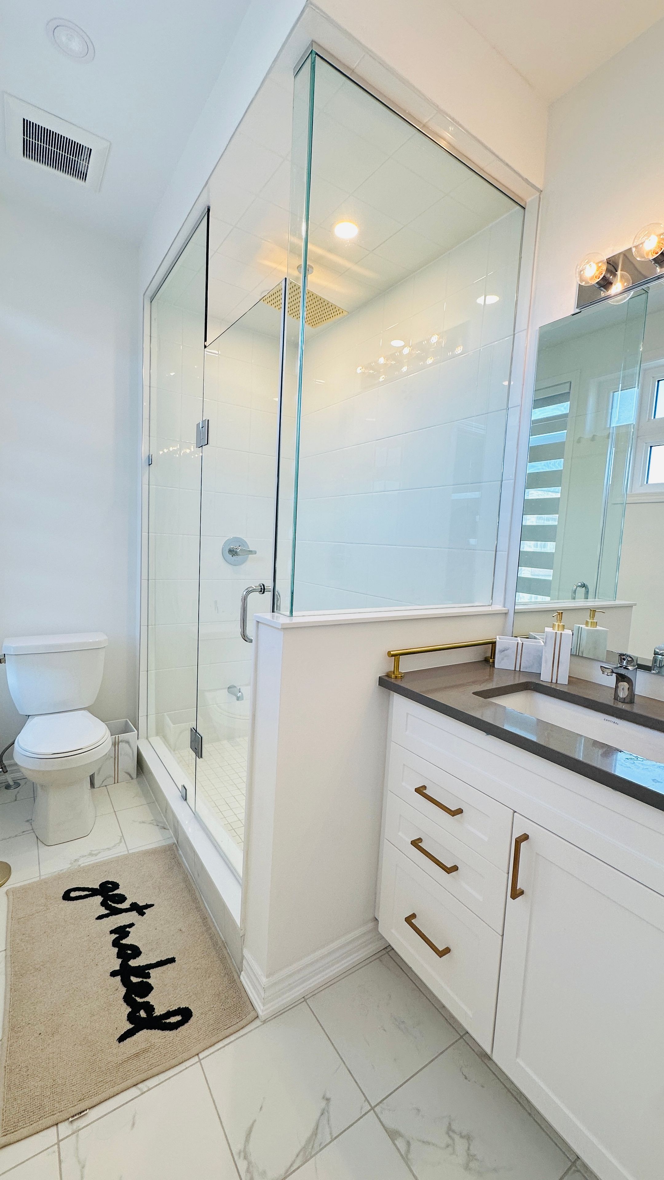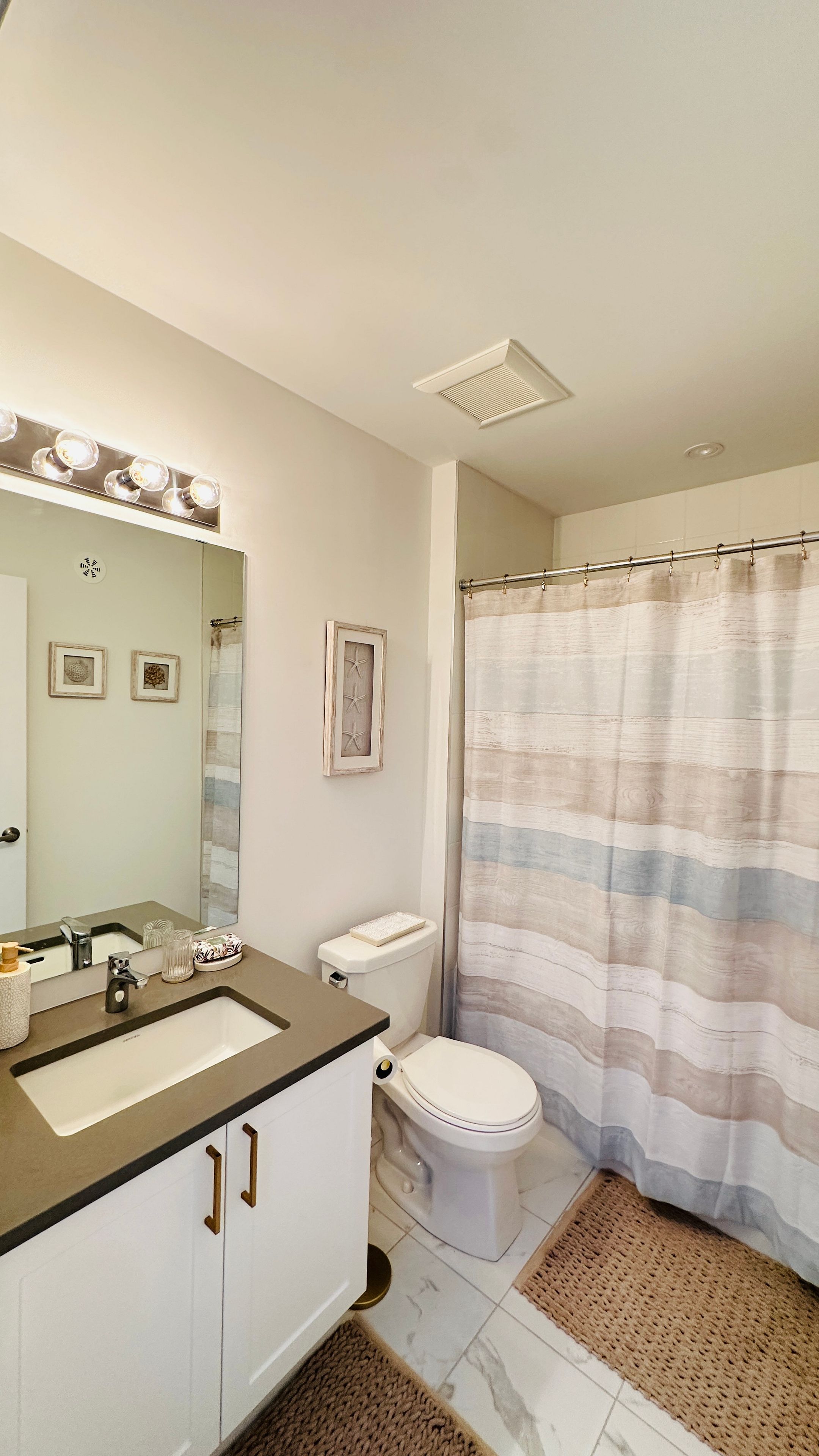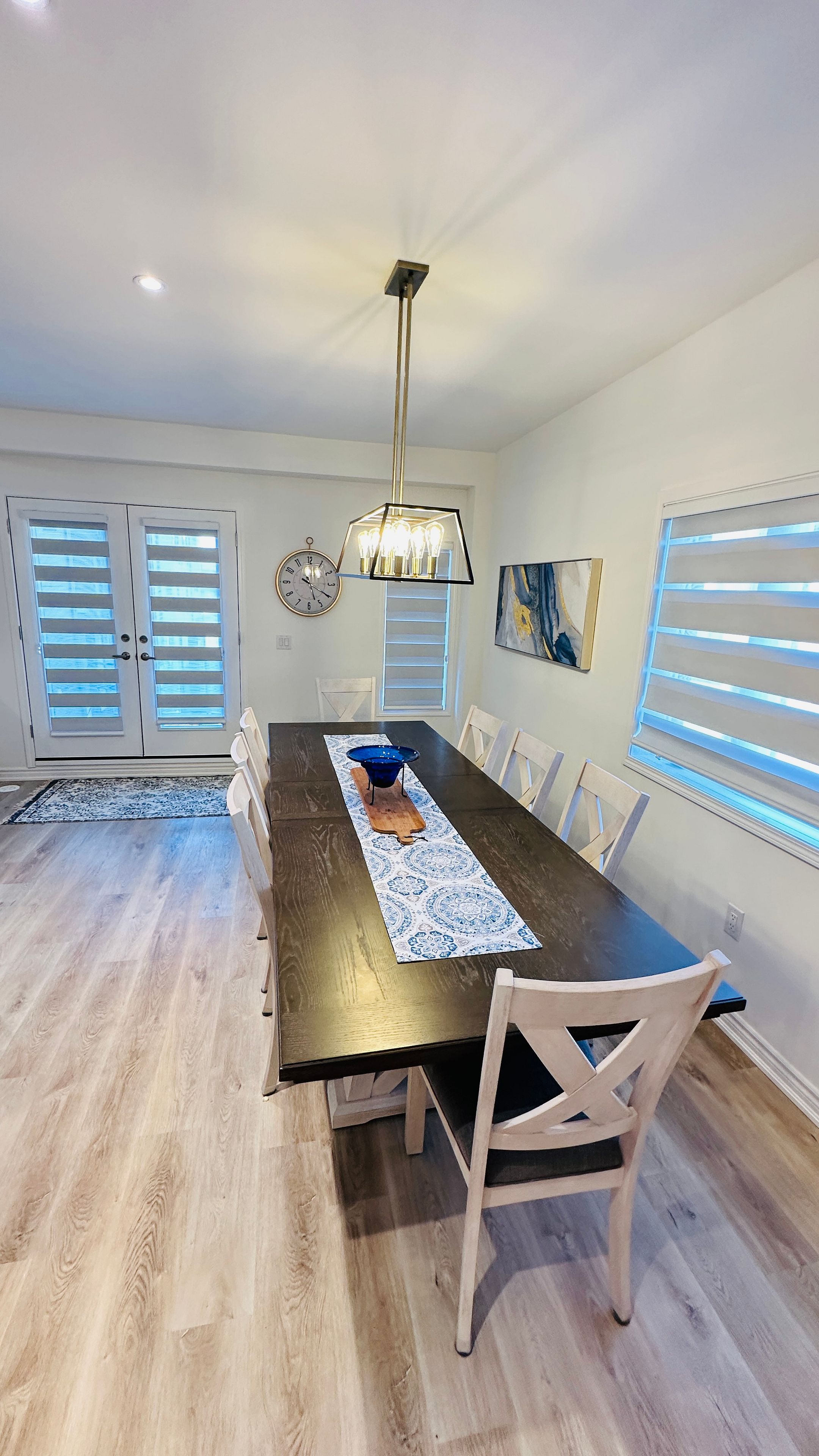 • Modern kitchen features quartz counters, quality appliances, and breakfast seating.