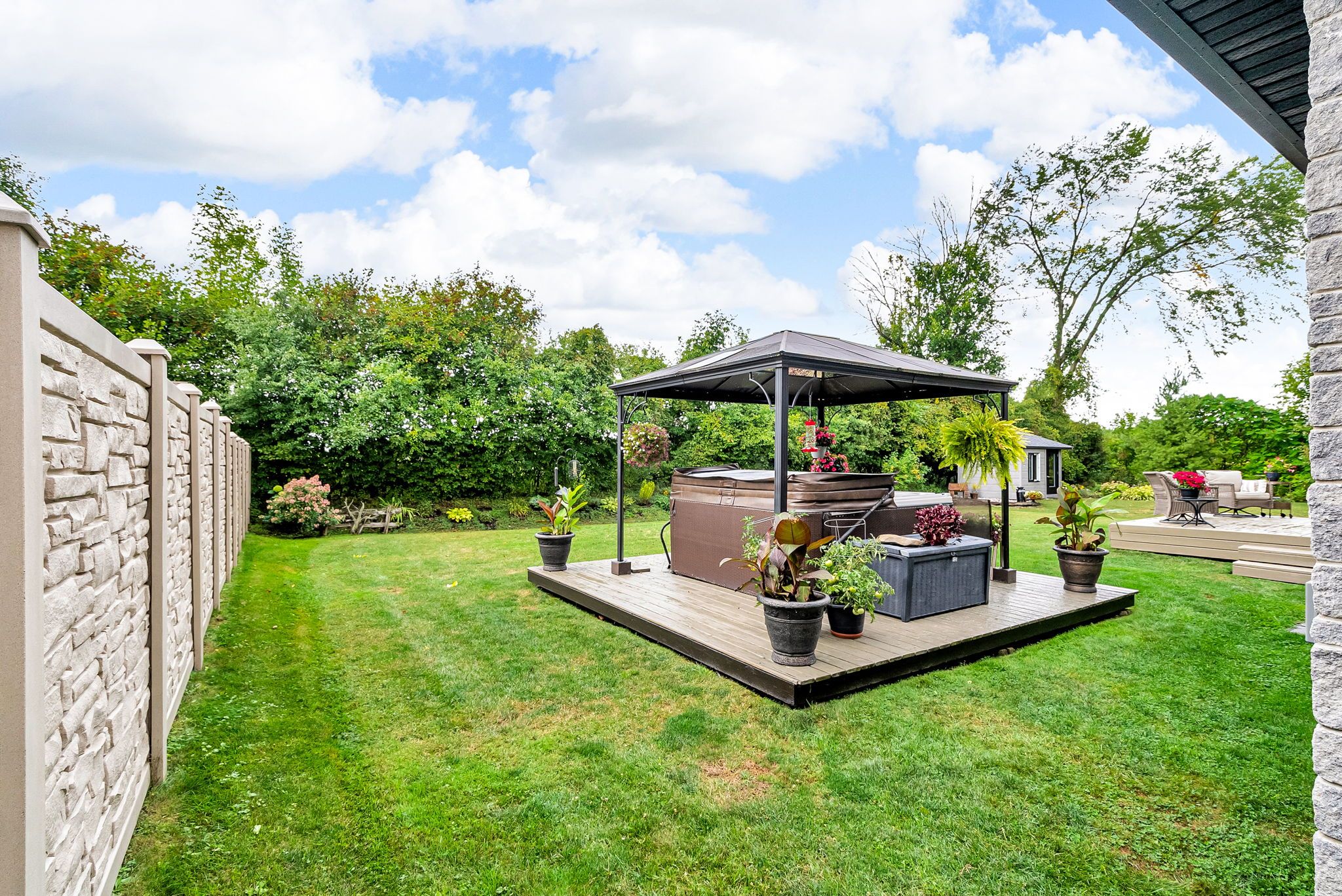 • Partially fenced yard with a hot tub and retractable awning for relaxation.