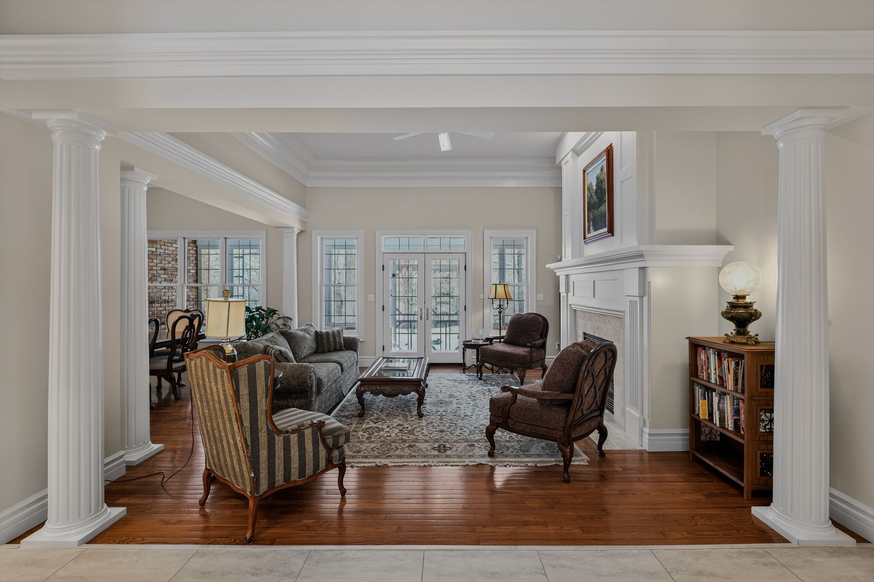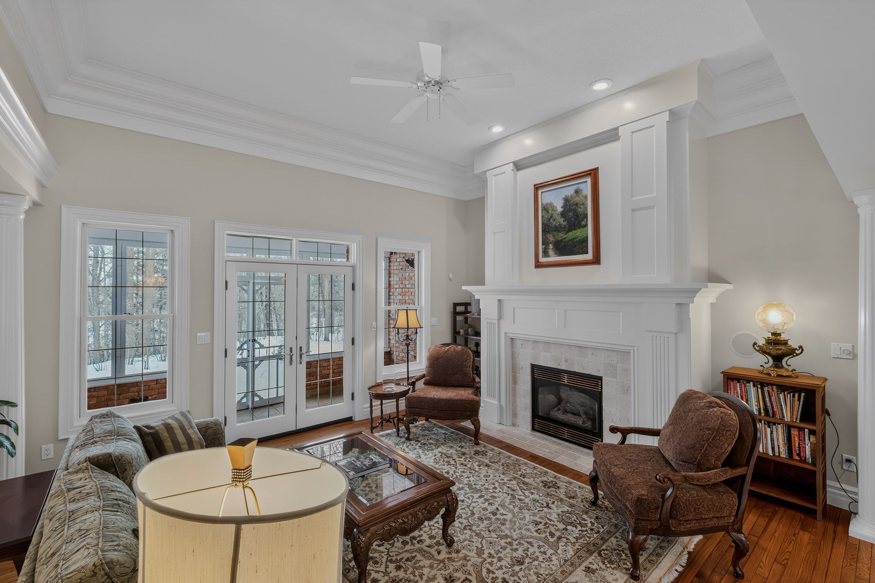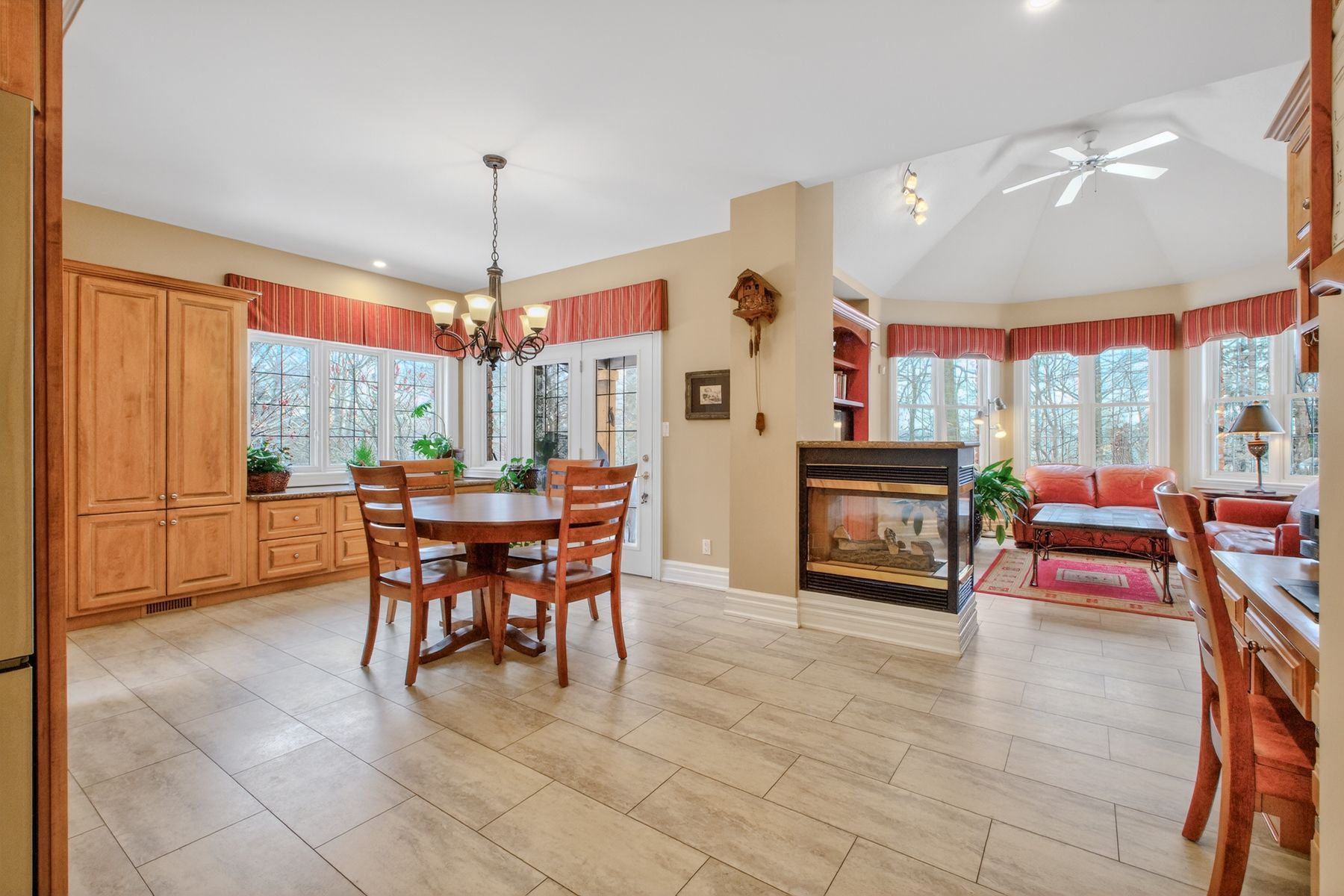 • Bright bungalow with high ceilings, large windows, and a double-sided fireplace.