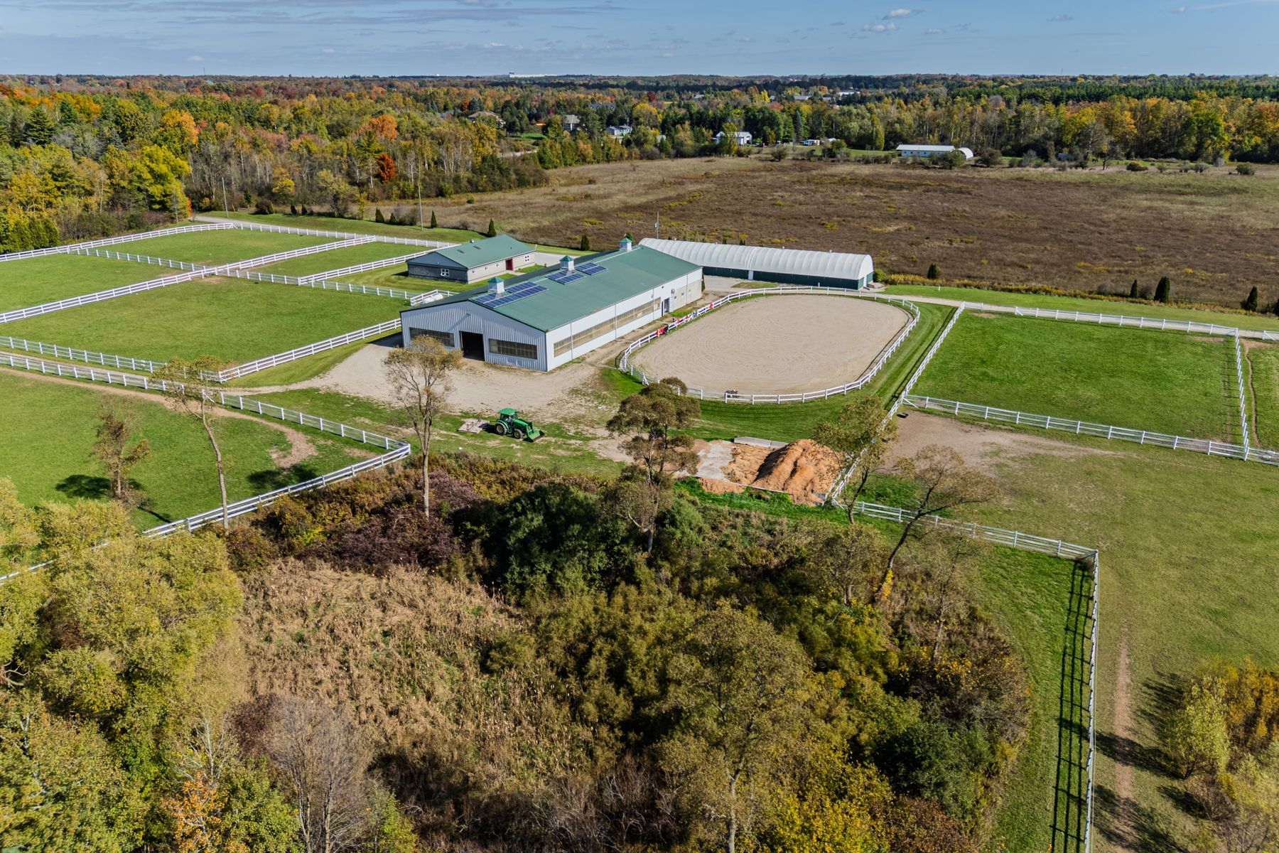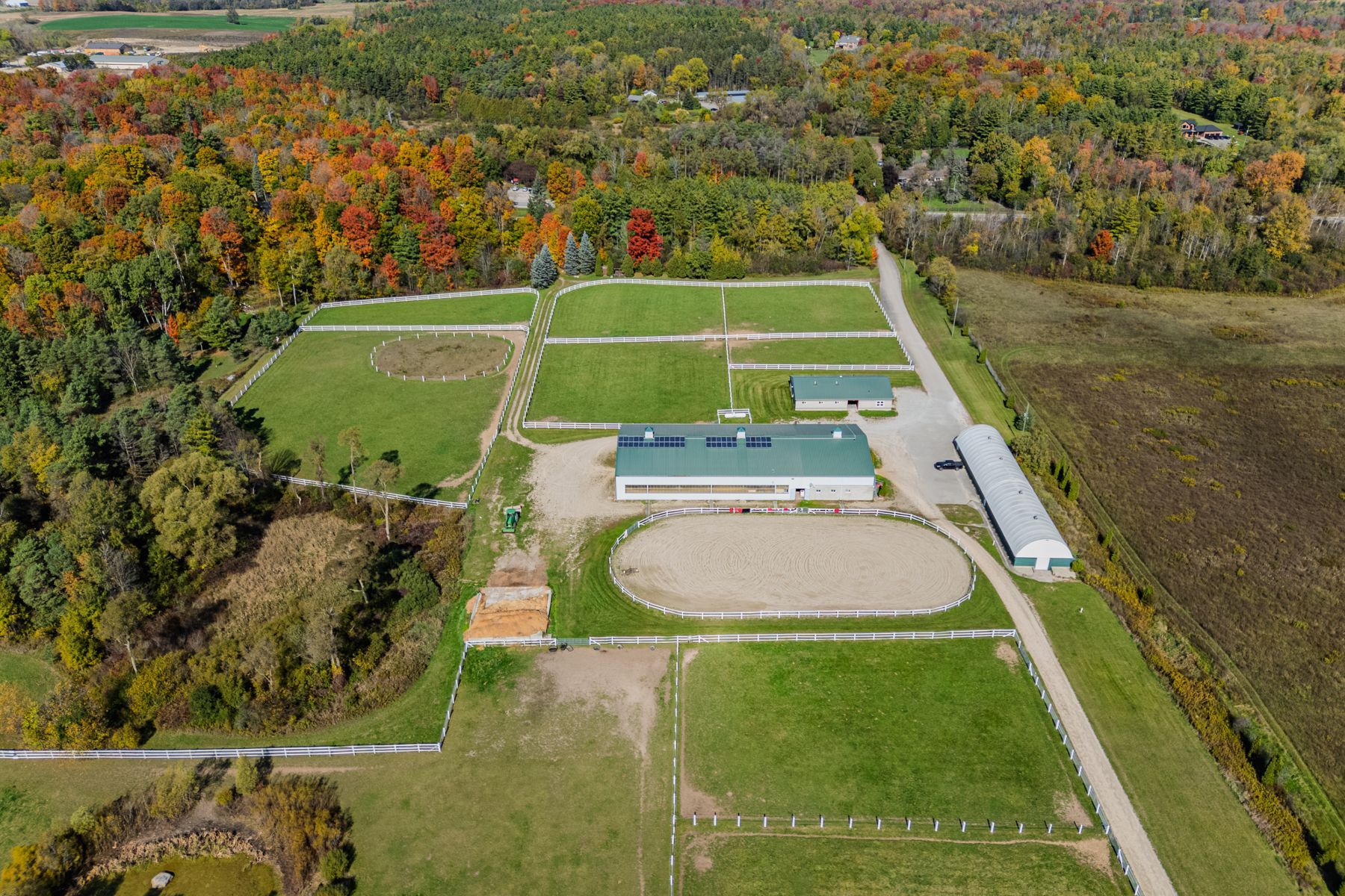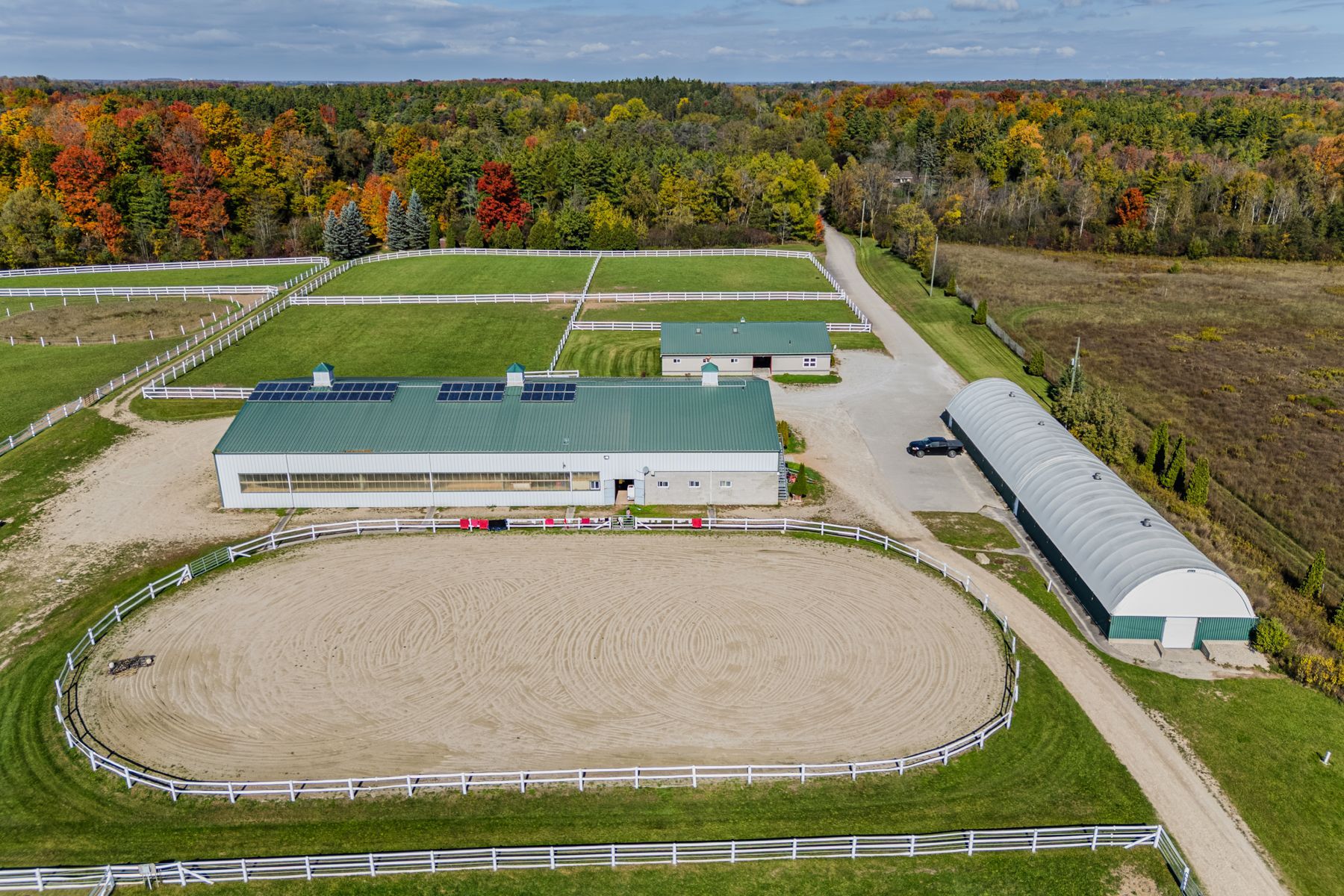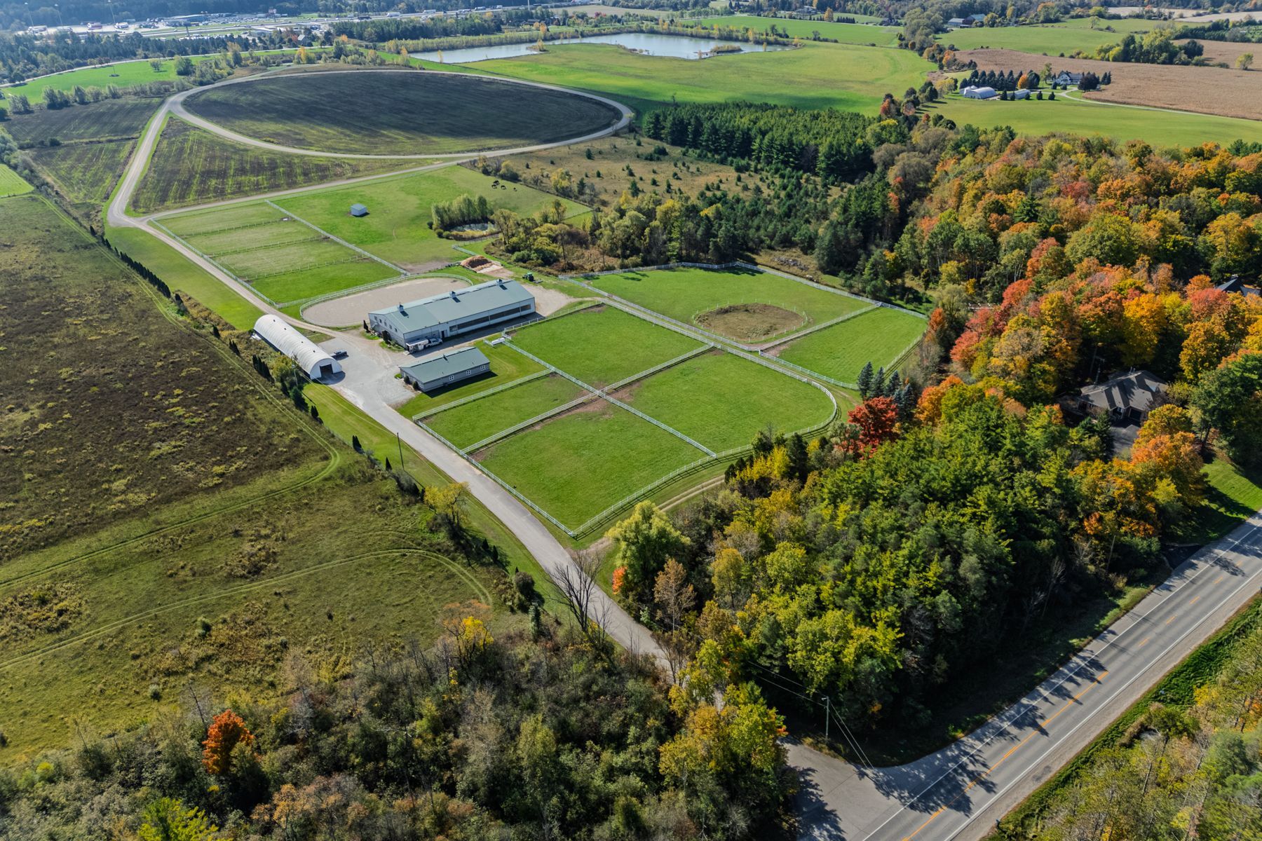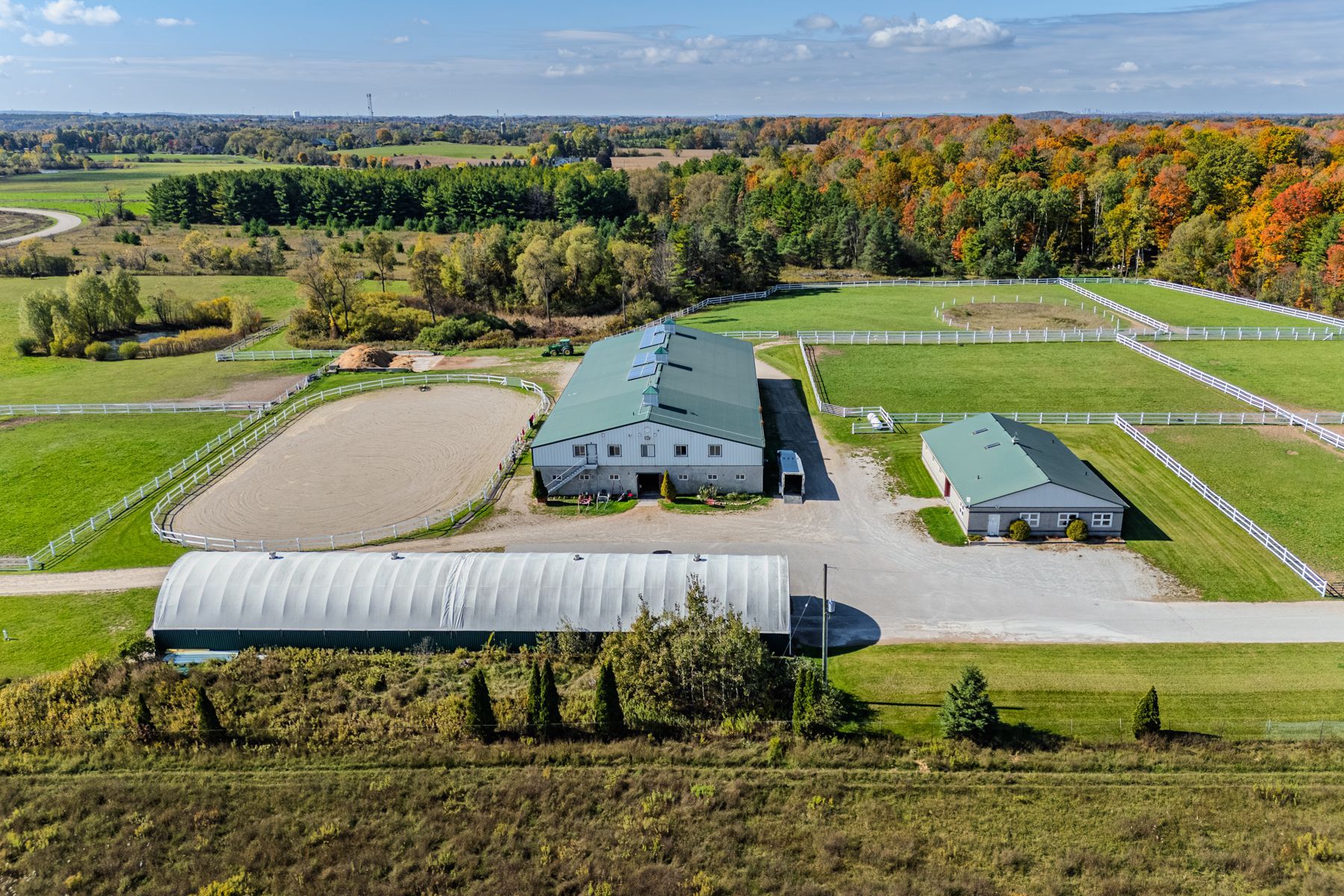 Set on over 70 acres, this well-established equestrian property offers a rare combination of space,functionality, and privacy-while still being ideally located just minutes to highway 401, with easy access to both guelph and cambridge for everyday amenities and commuting. The facility is thoughtfully laid out with 14+ stalls, indoor and outdoor arenas, fenced paddocks,and a half-mile training track with straightaway. The main barn includes an accessory apartment,laundry area, viewing room, and office space, designed to support both day-to-day operations and extended stays. An additional detached building offers multiple offices and three stalls, lending itself to a variety of uses. Whether for equestrian support, a home-based business, or flexible workspace. Acoverall provides added storage for equipment and materials. Two separate driveways provide a natural separation between the residence and the working areas of the property, allowing for both privacy and functionality. The custom-built bungalow is bright and well-proportioned, with high ceilings, large windows, and natural light throughout. The kitchen opens to the family room, anchored by a double-sided propane fireplace and finished with thoughtful details including wide trim and crown moulding,creating a space that feels both comfortable and well-appointed. The fully finished lower level extends the living space across the entire footprint of the home,offering in-law potential, walkout access to beautifully landscaped grounds, a theatre room,games area, and a second double-sided fireplace - this one wood-burning. The property itself is beautifully maintained, with mature landscaping, lush gardens, and a stream running through the centre, adding to the sense of privacy and calm. A property of this scale, versatility, and location is rarely offered.