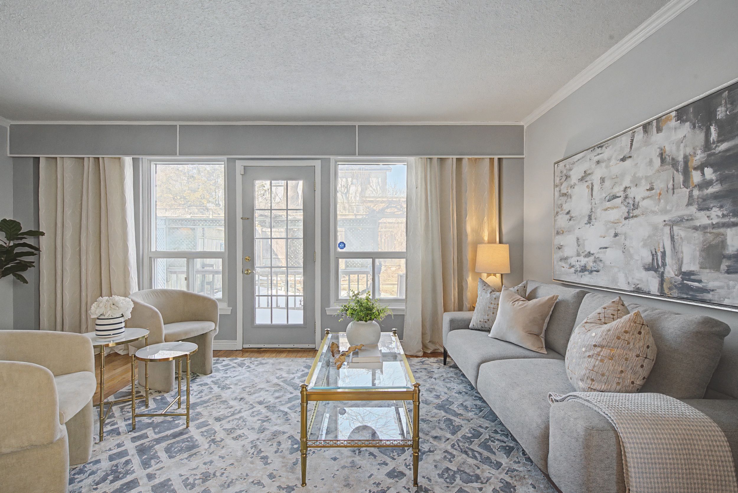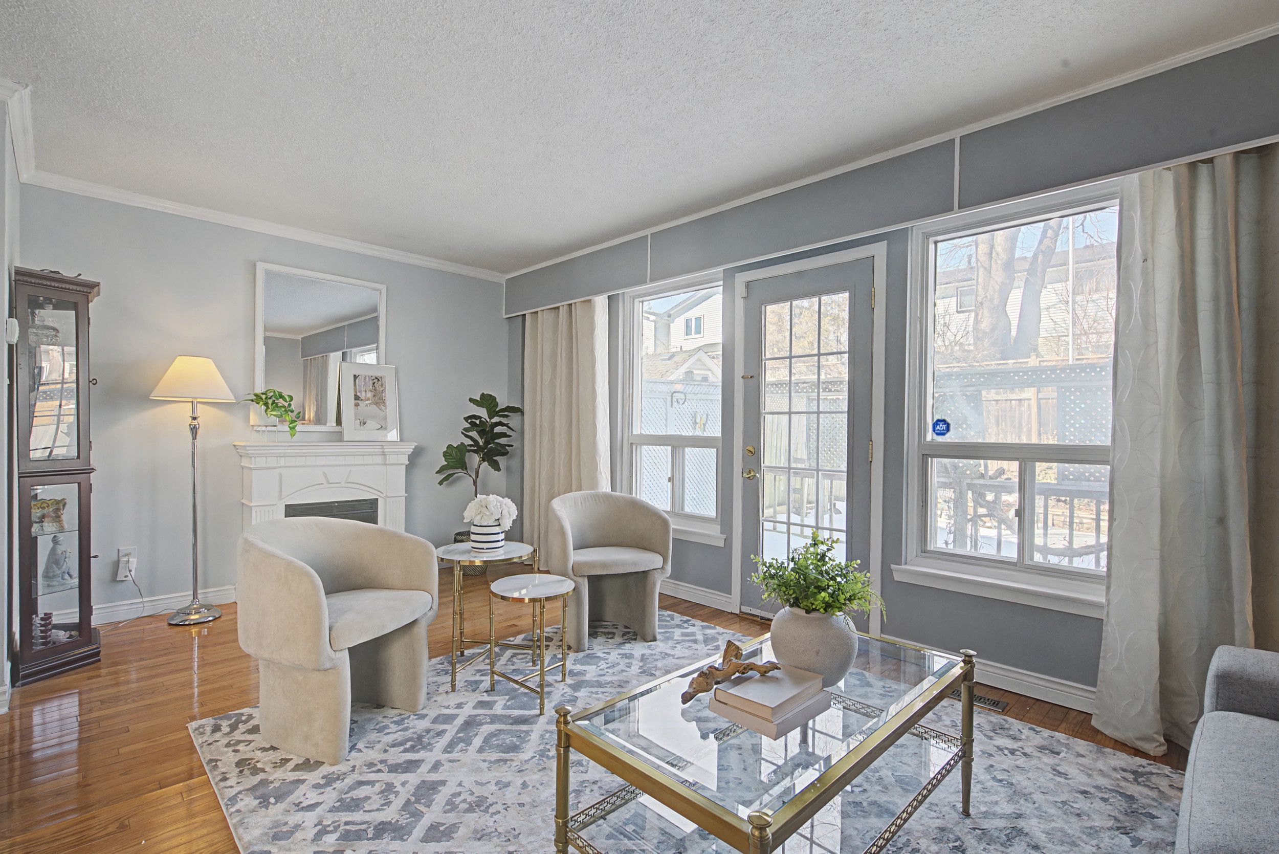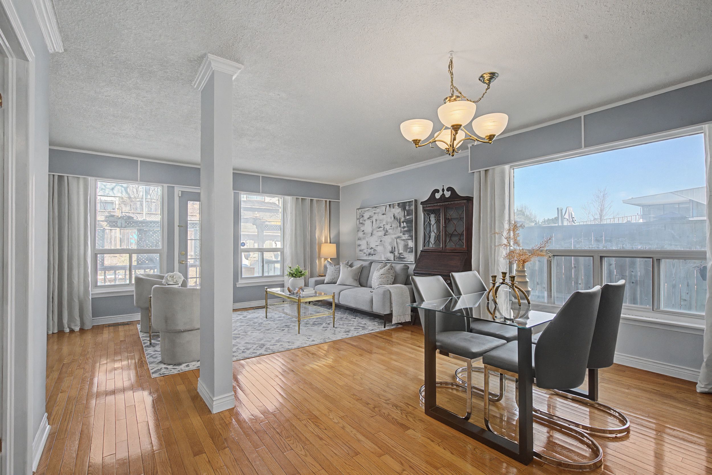 • Spacious open concept living area with rear windows and deck access.
