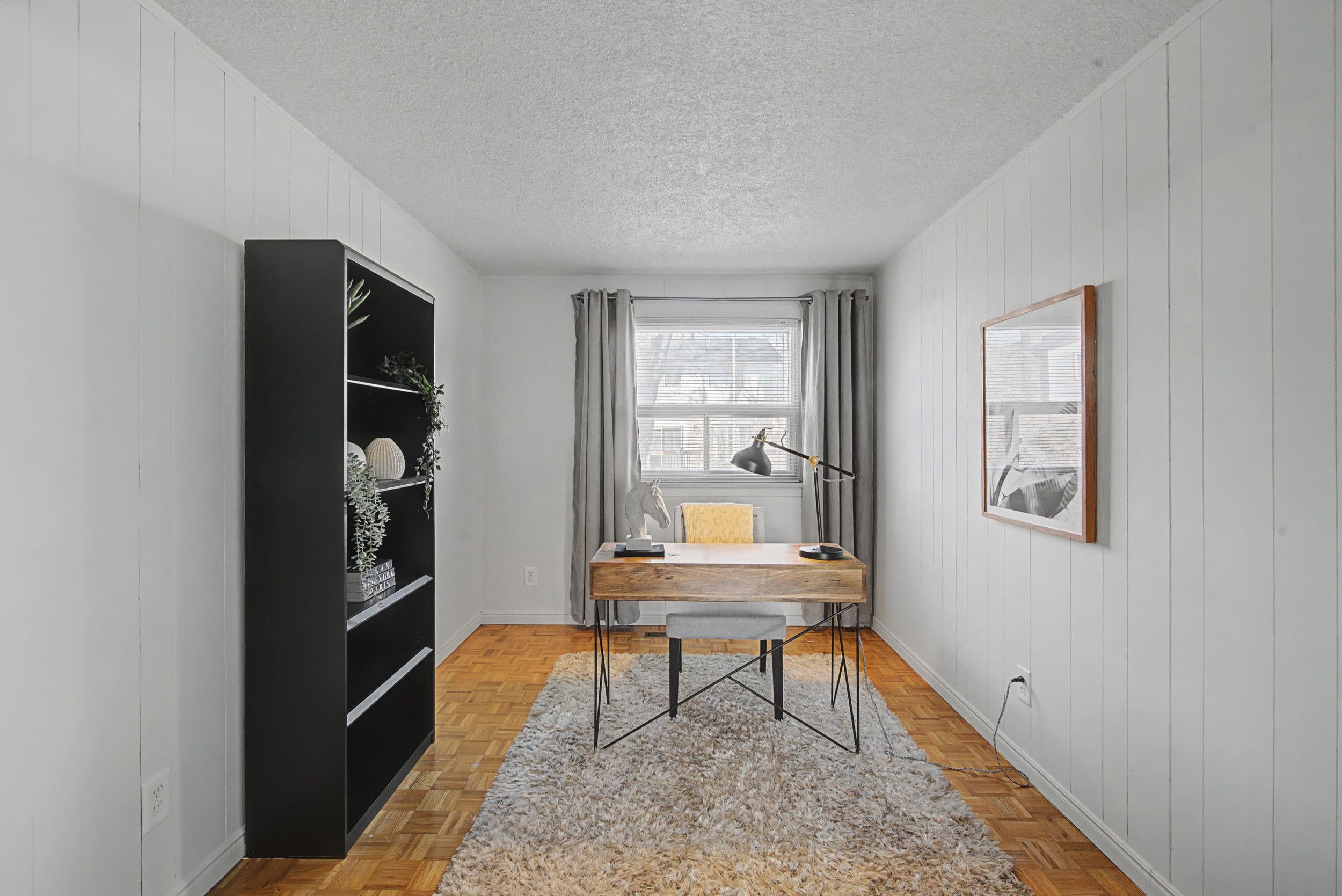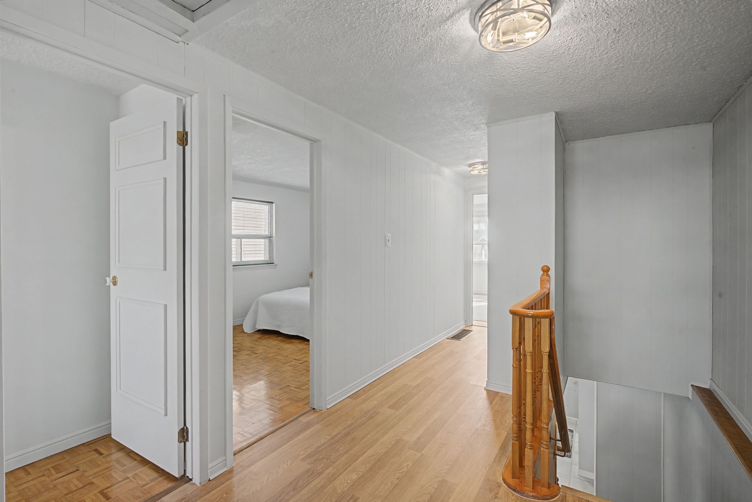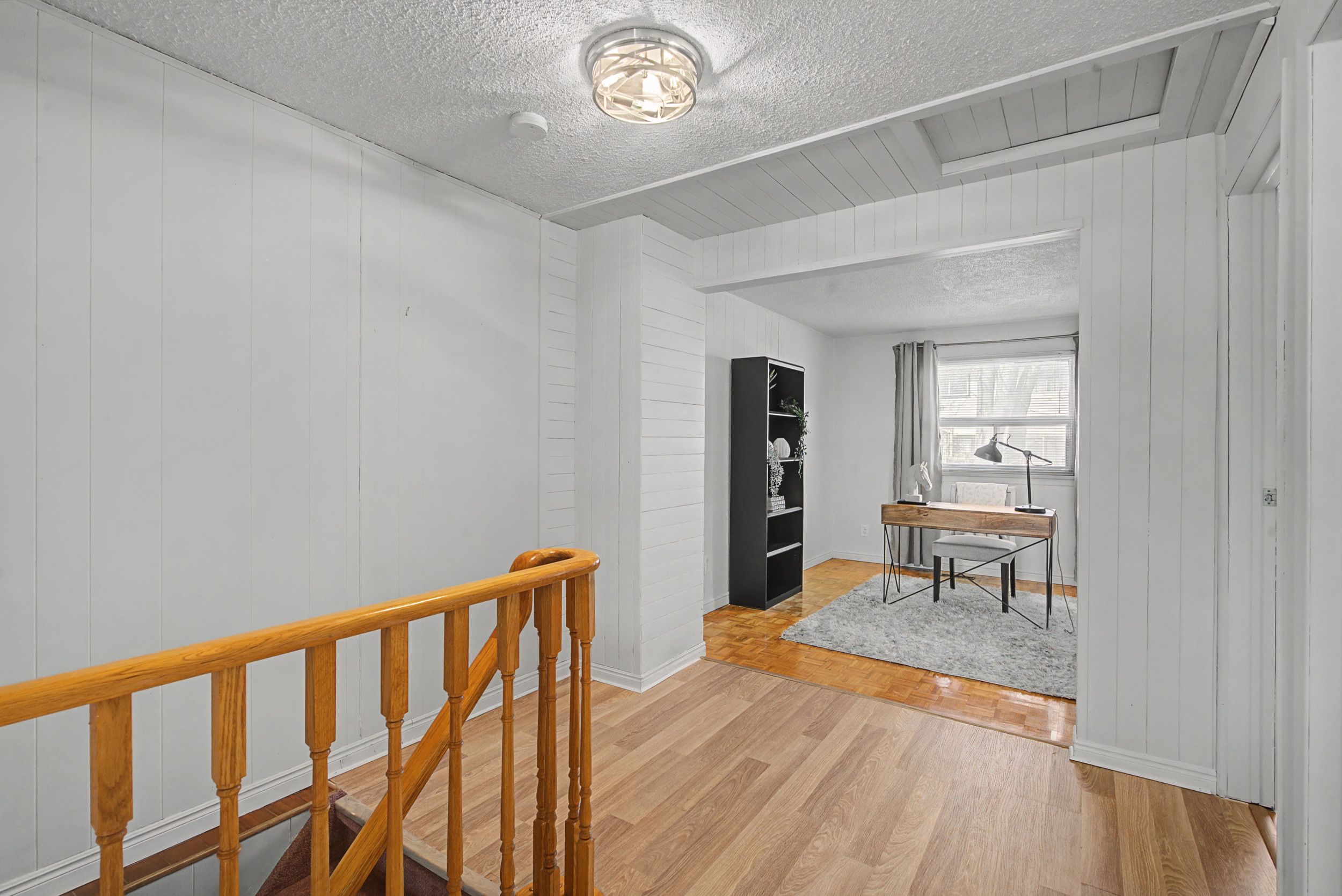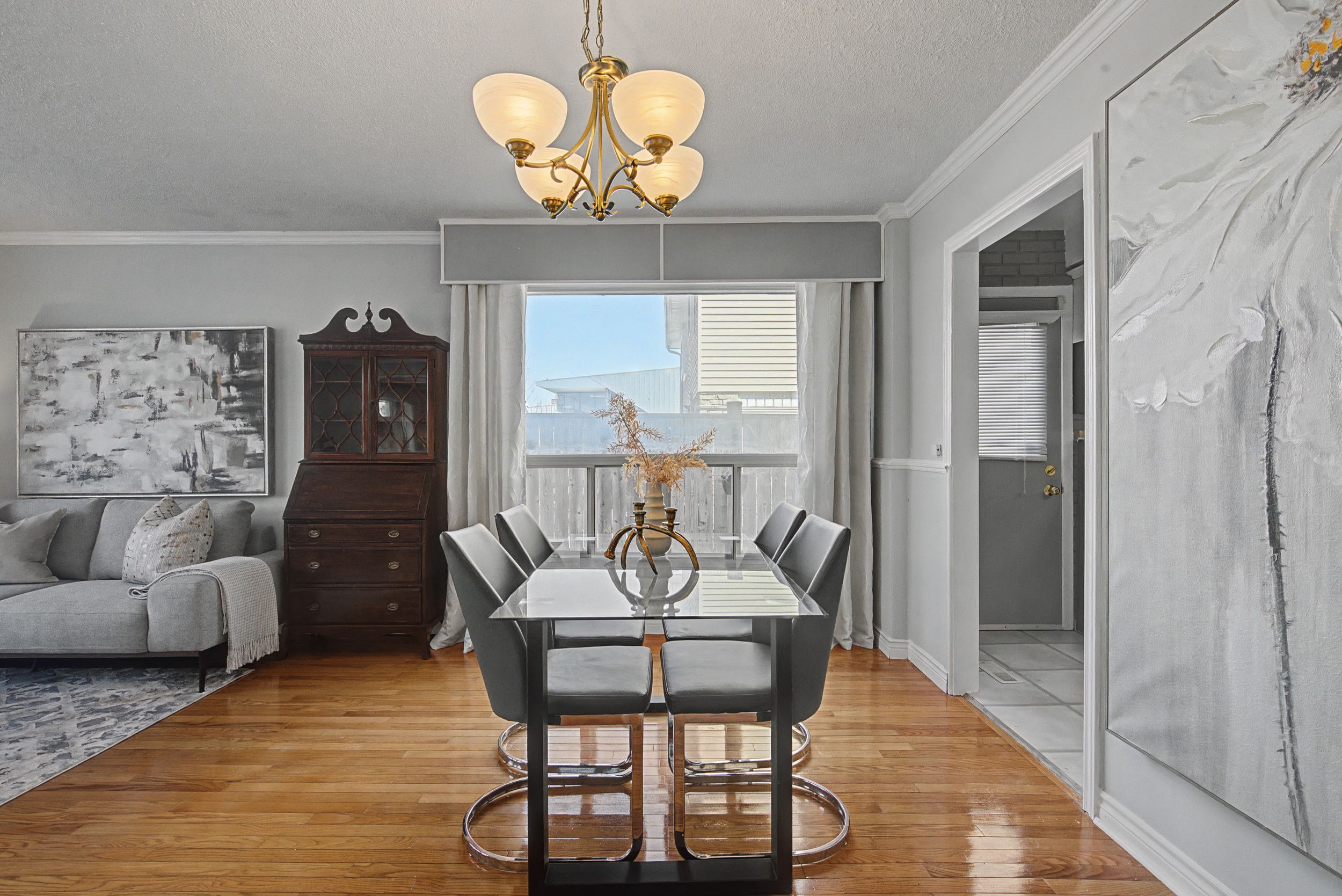 • Spacious open concept living area with rear windows and deck access.