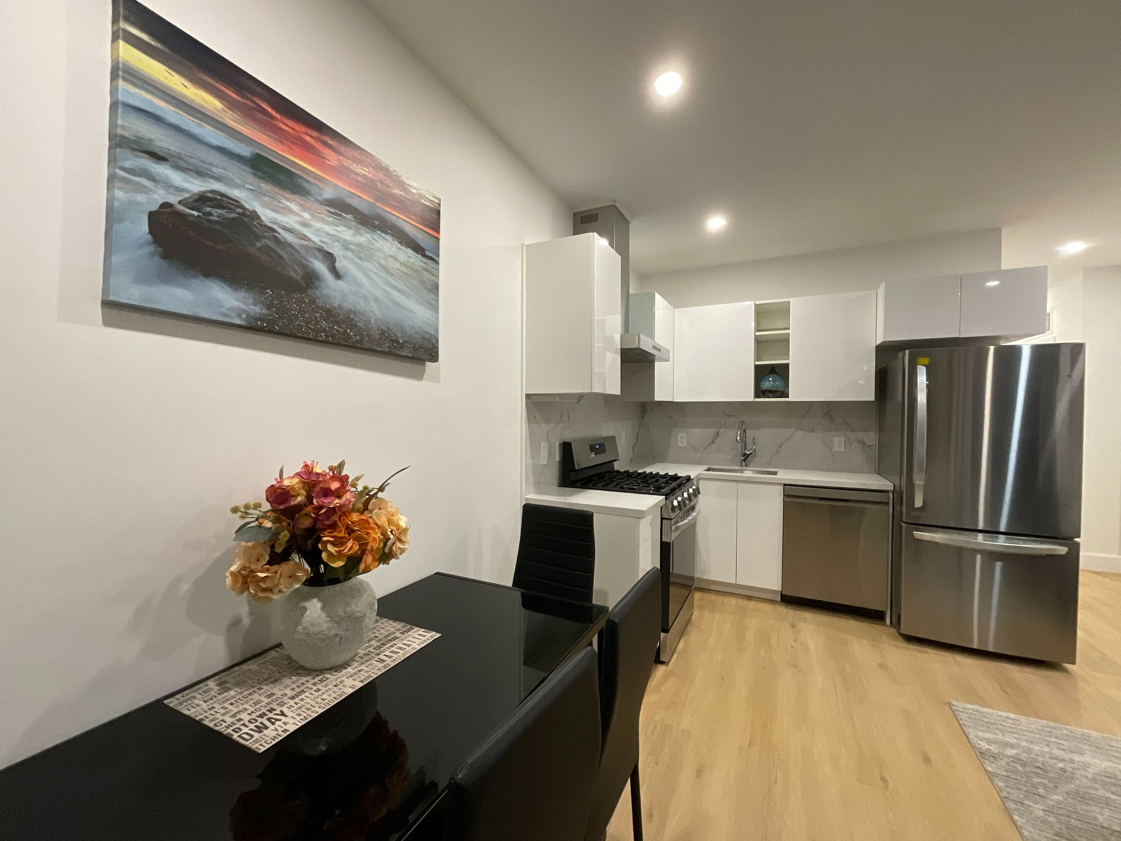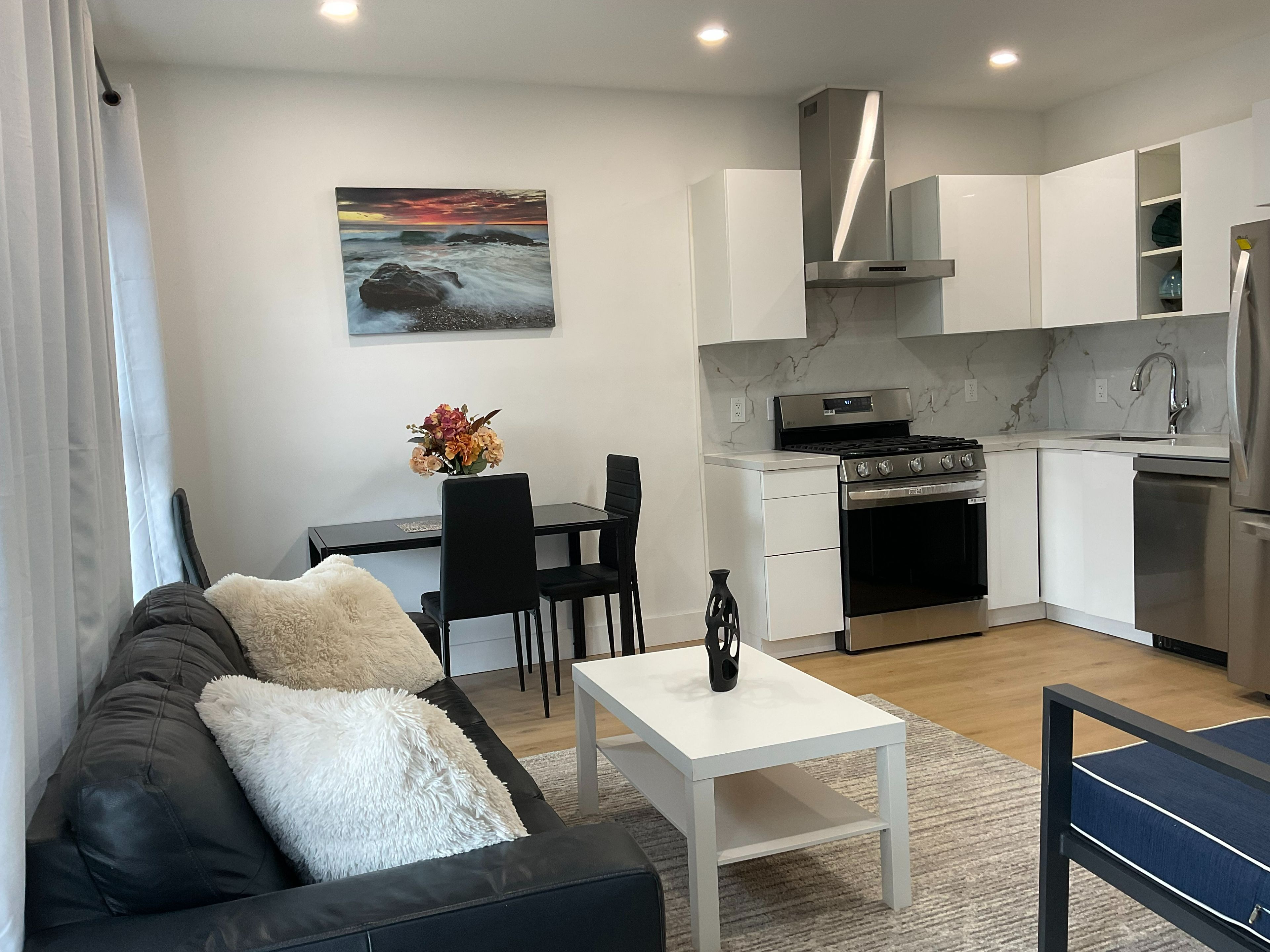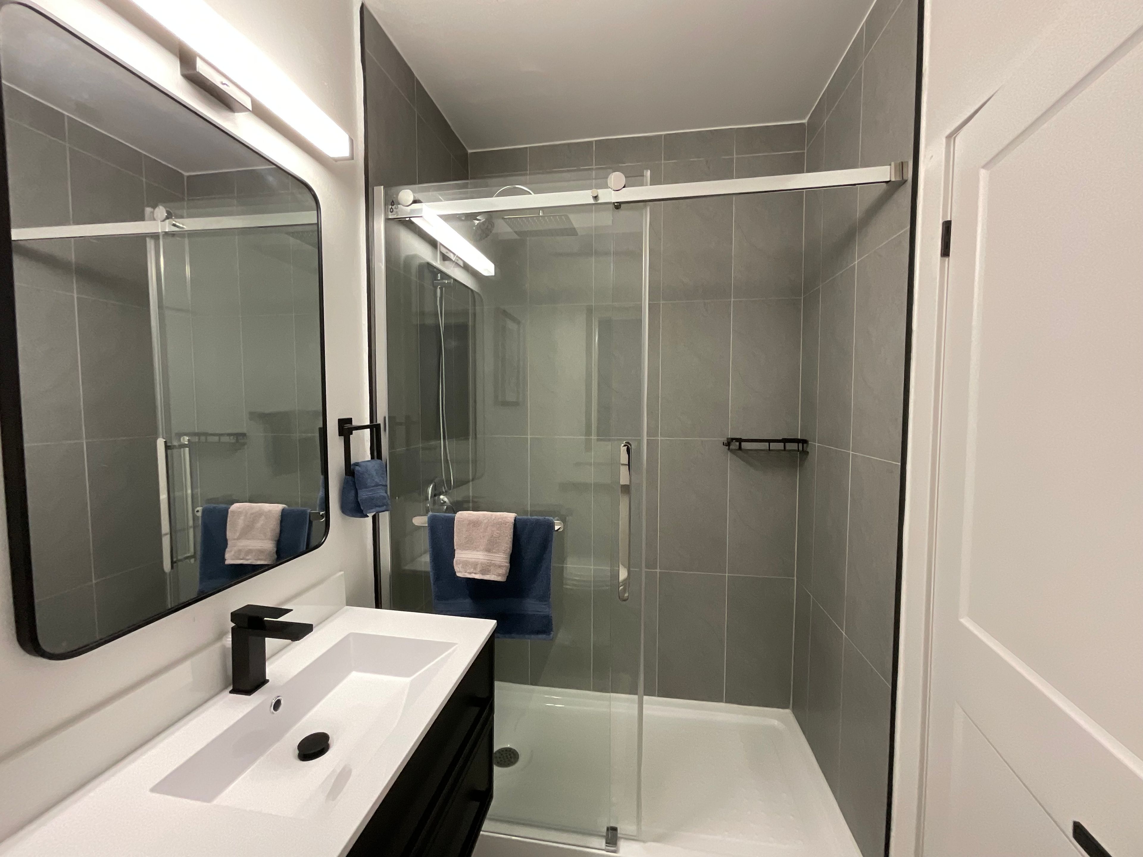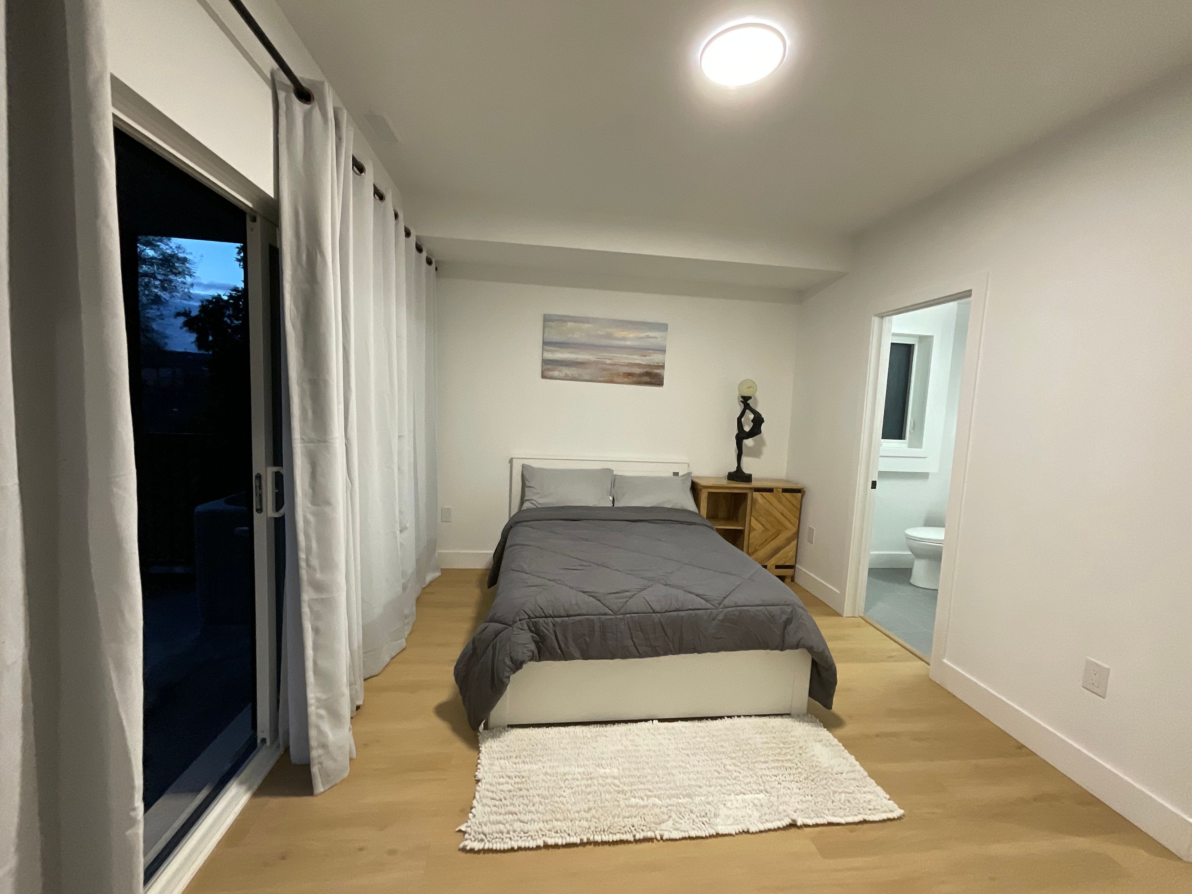 • Private entrance with modern amenities and high ceilings.