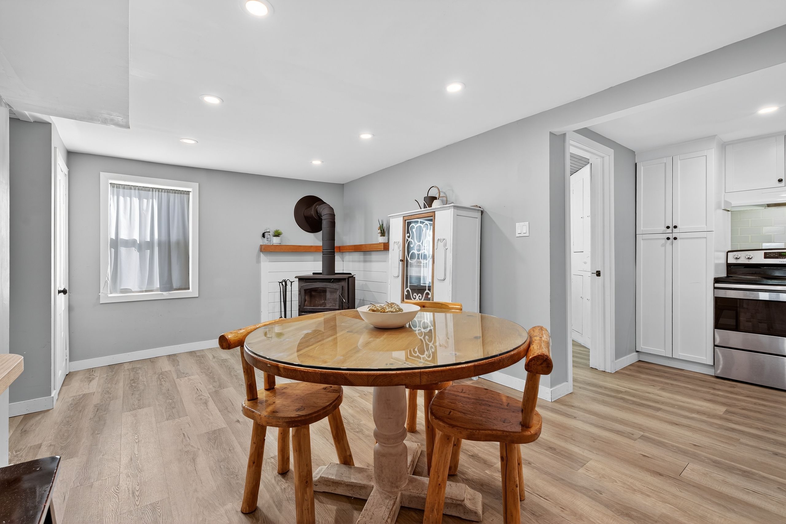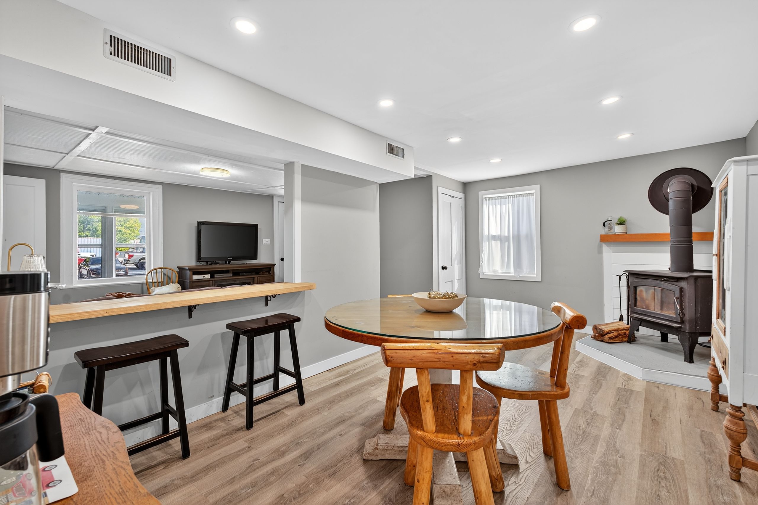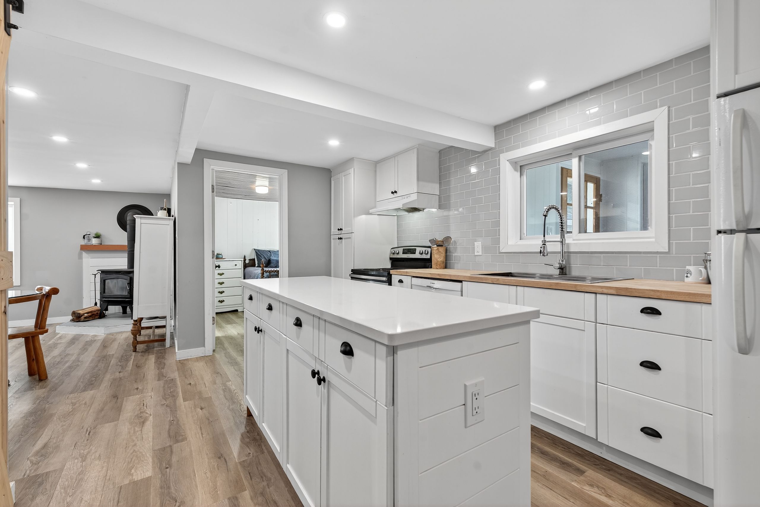 • Modern kitchen with quartz countertops and a WETT-certified wood stove.