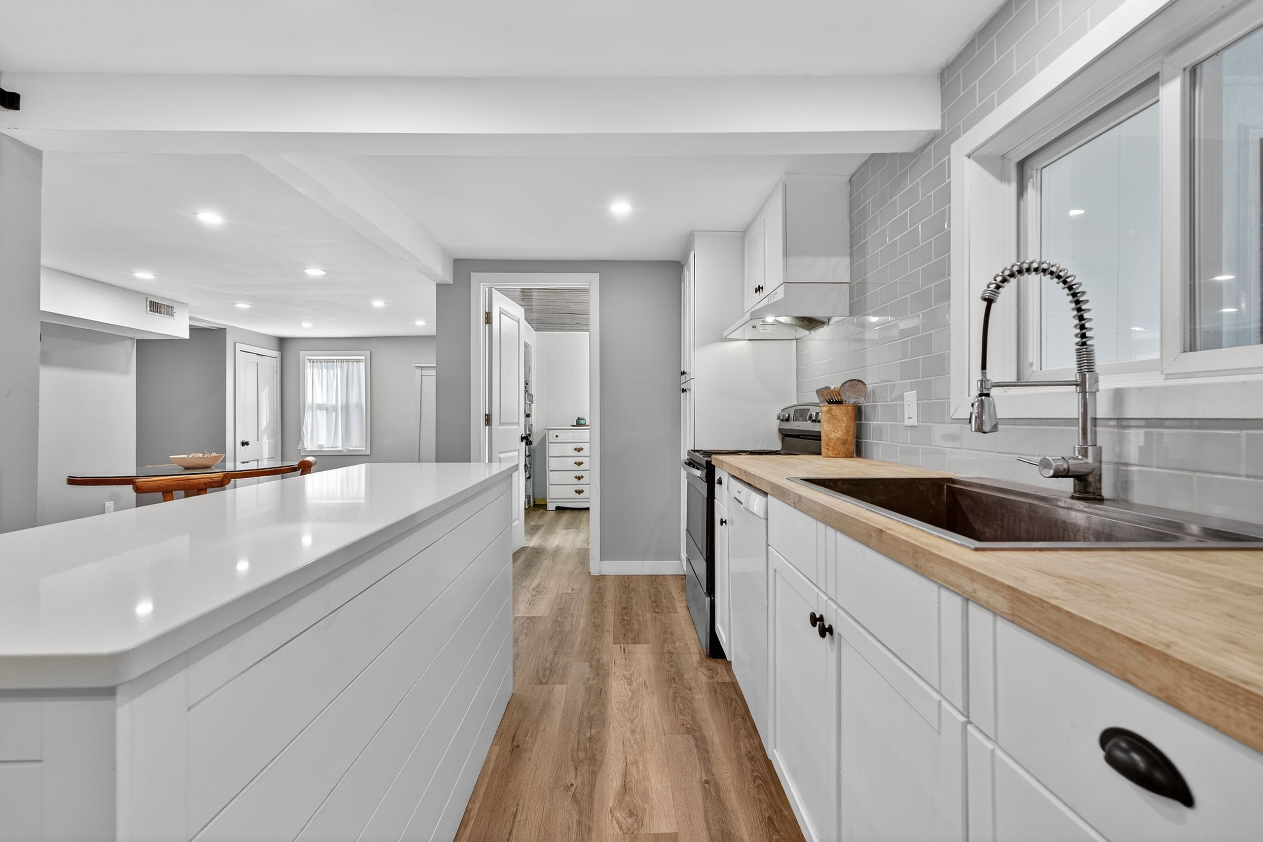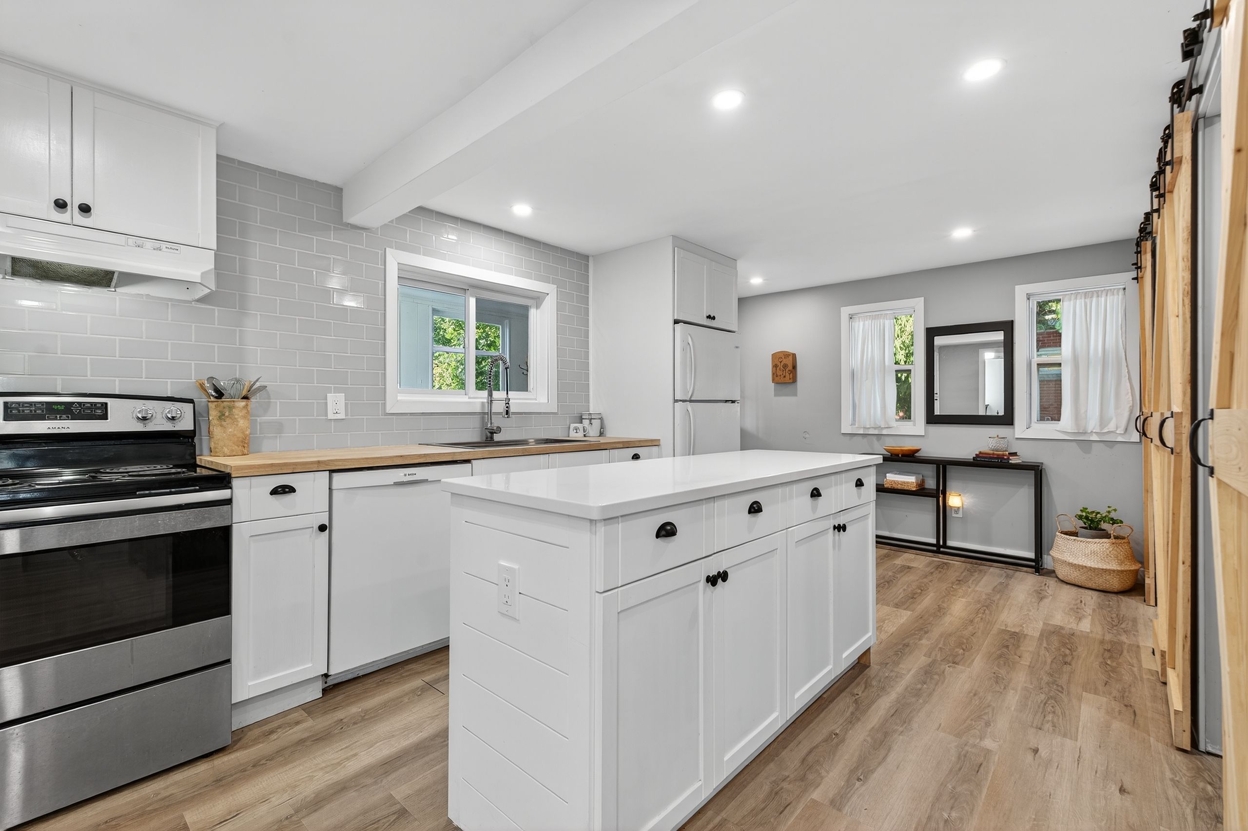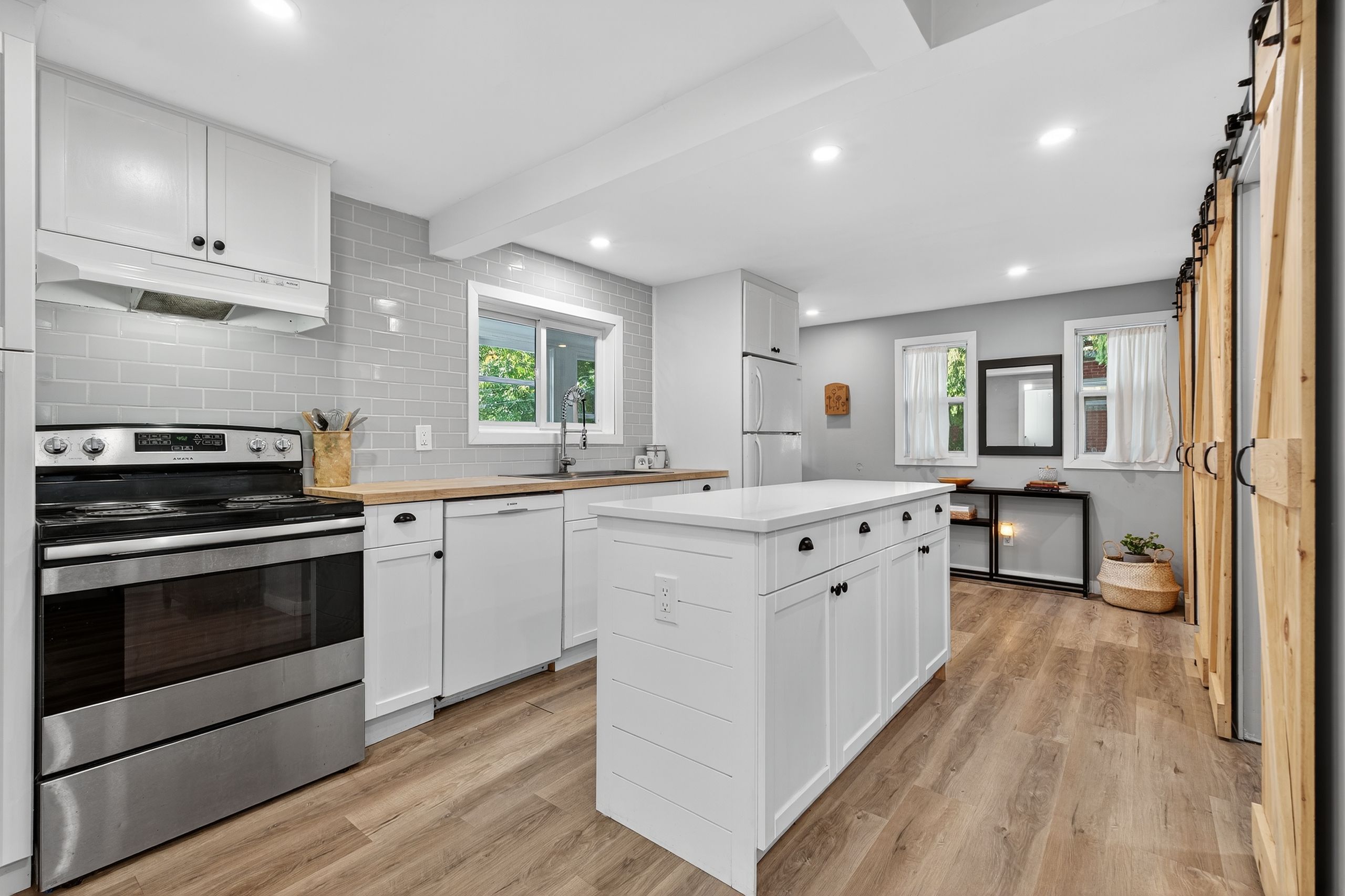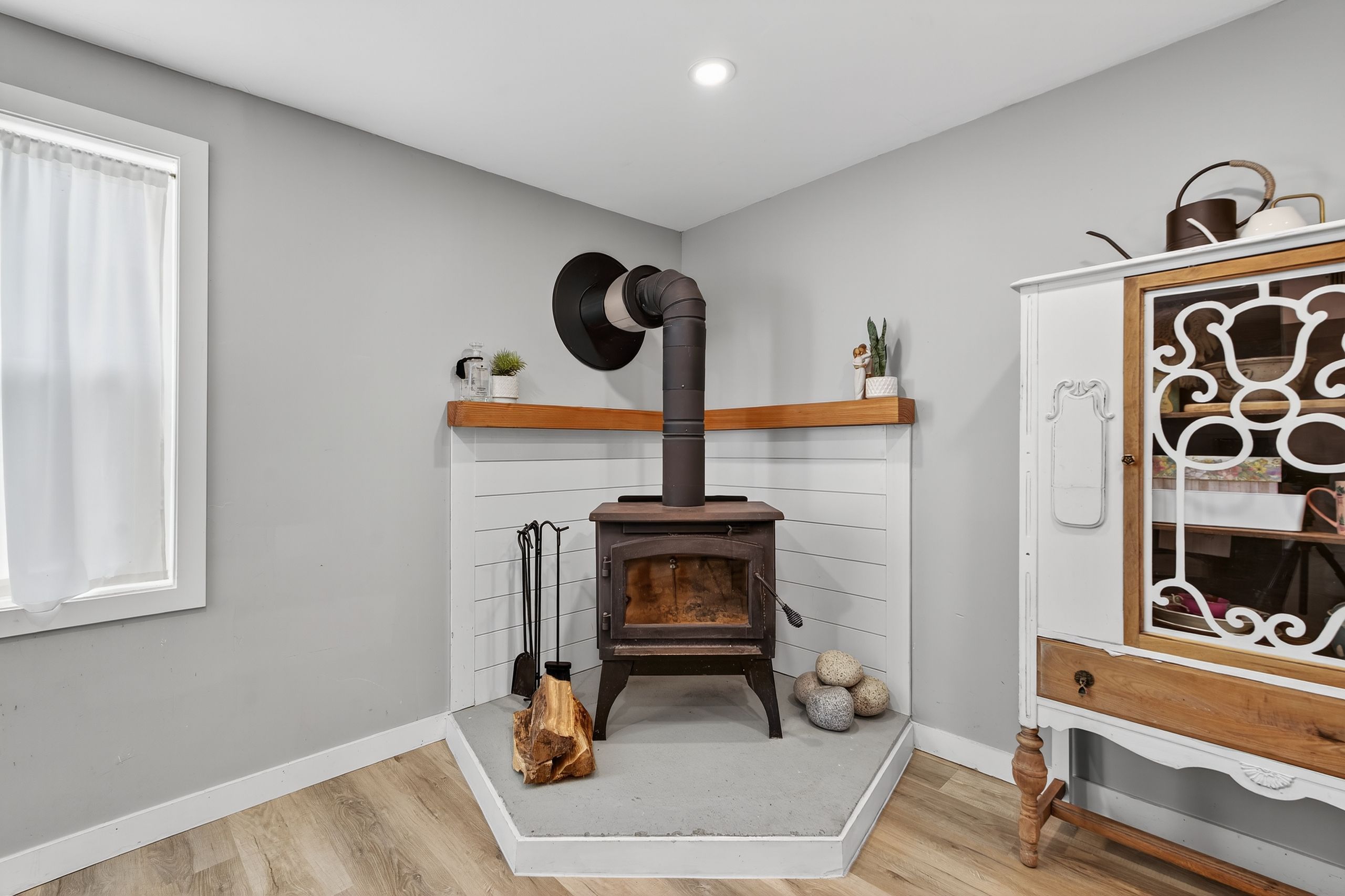 • Modern kitchen with quartz countertops and a WETT-certified wood stove.