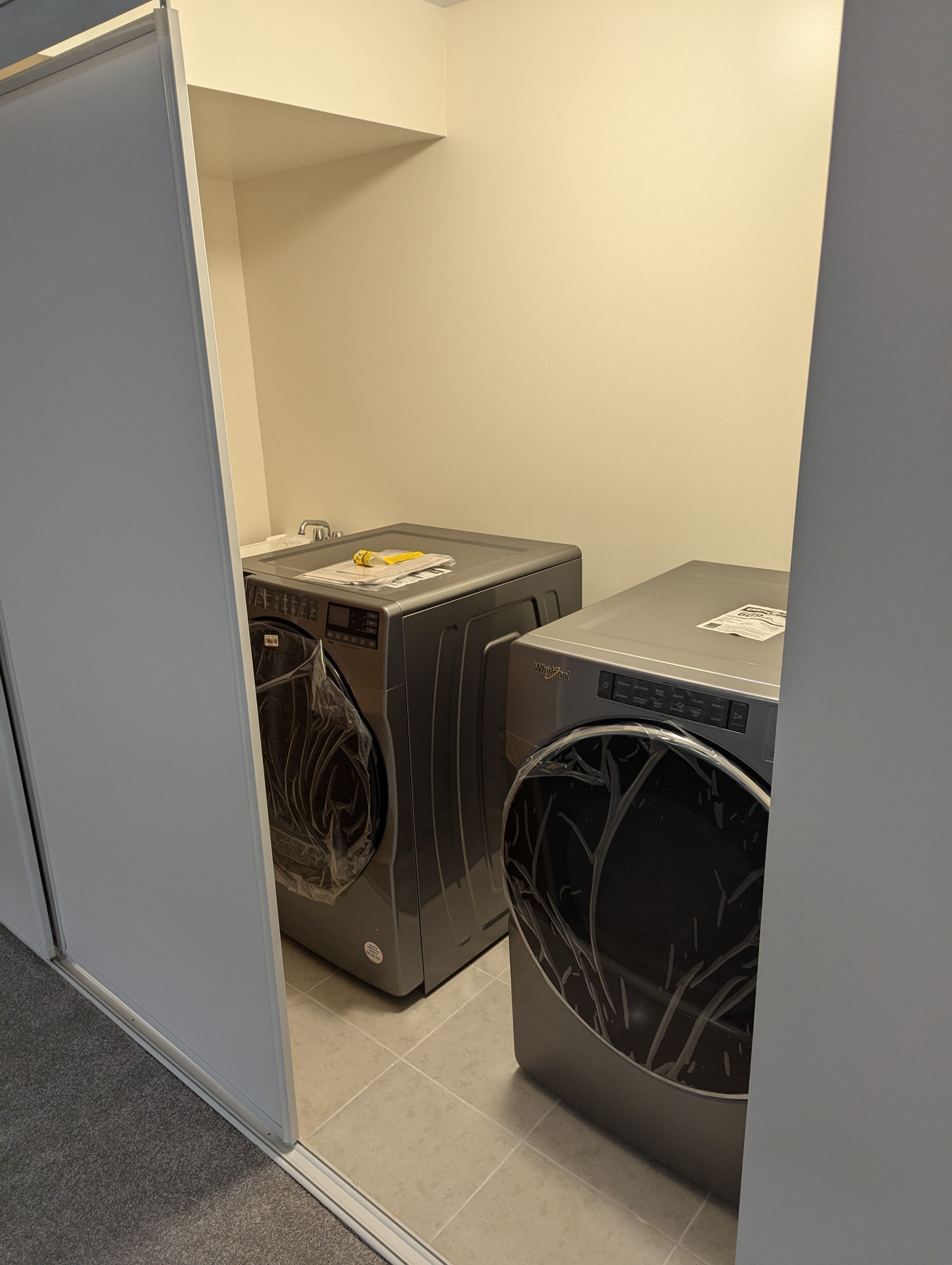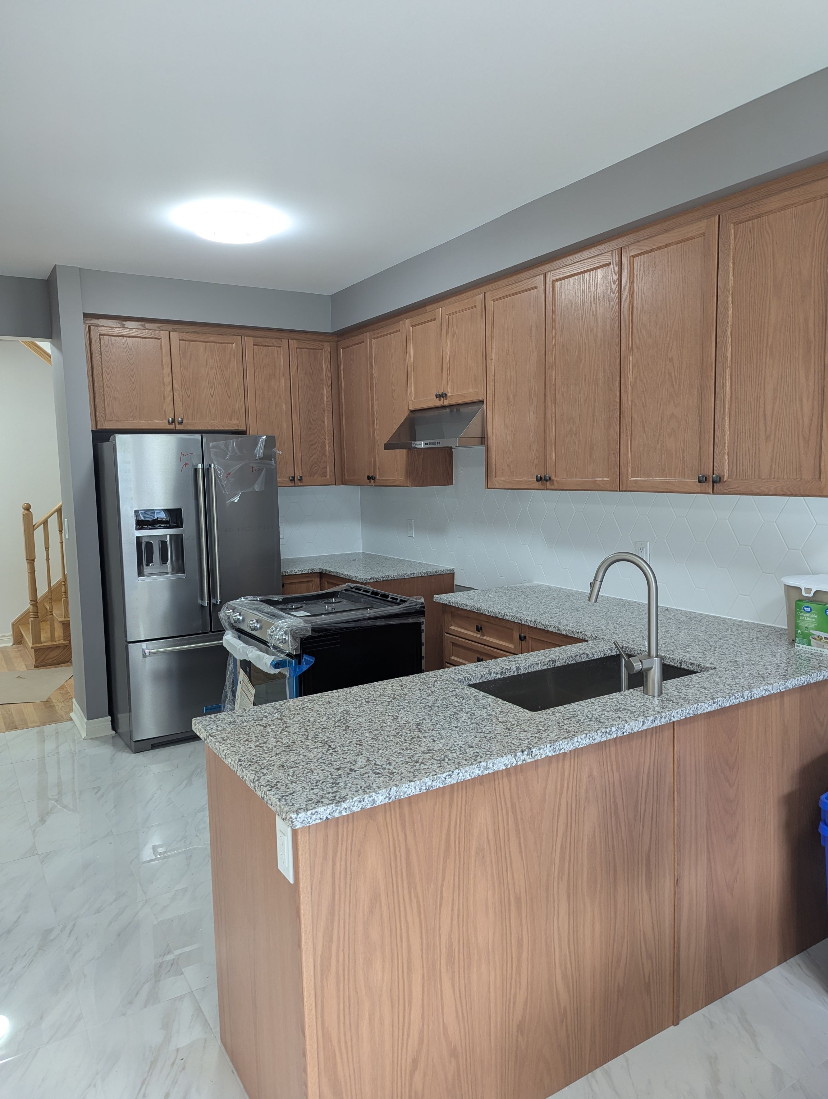 • Modern kitchen with stainless steel appliances and quartz countertops.
