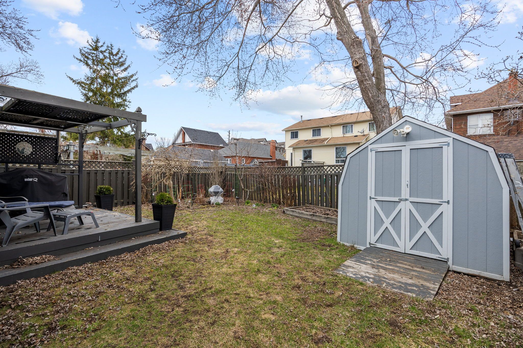 • Generous backyard features a deck, pergola, and mature landscaping.