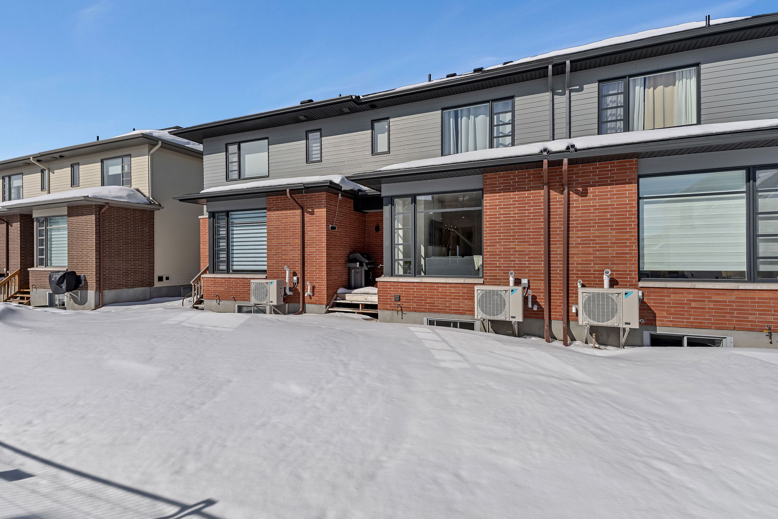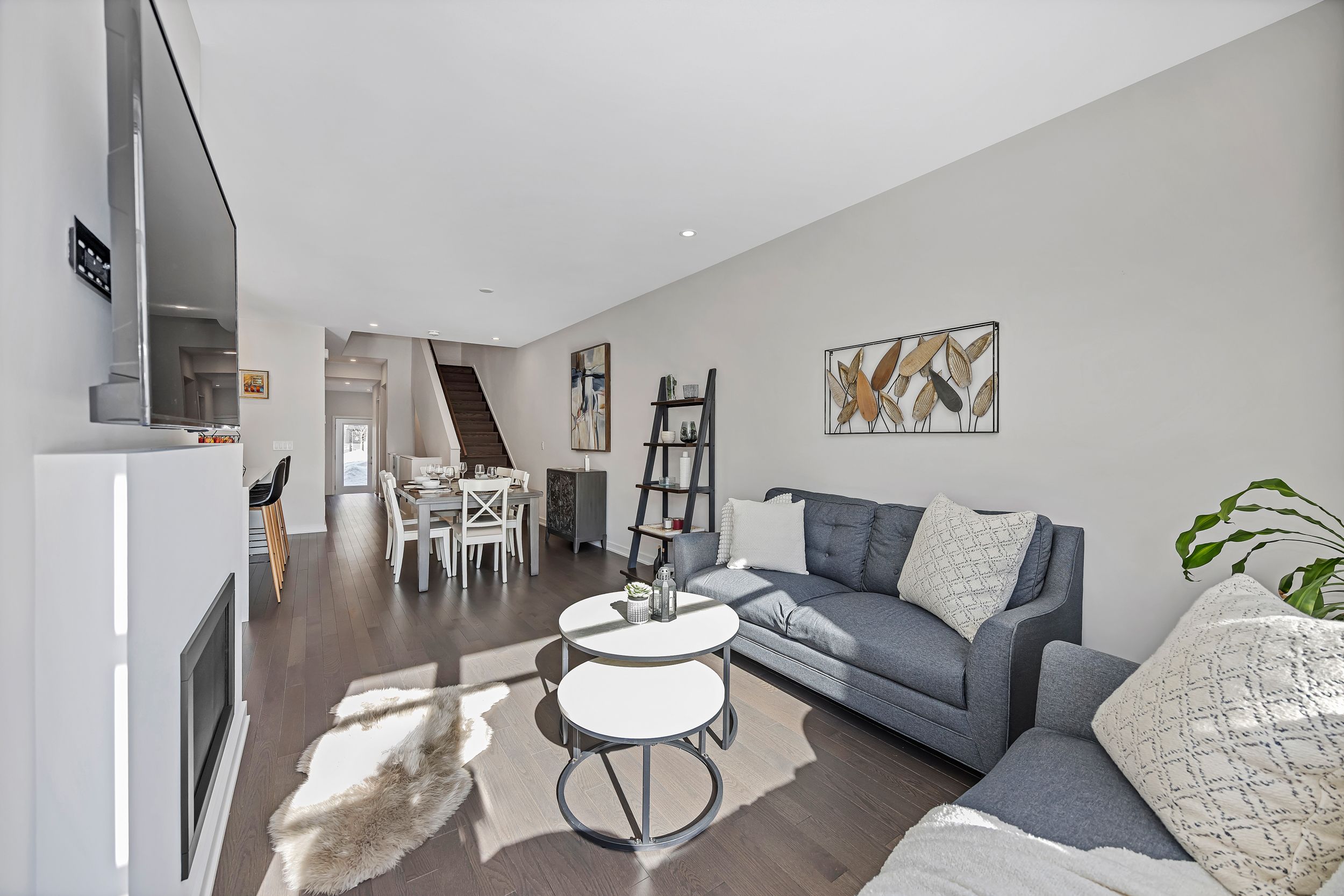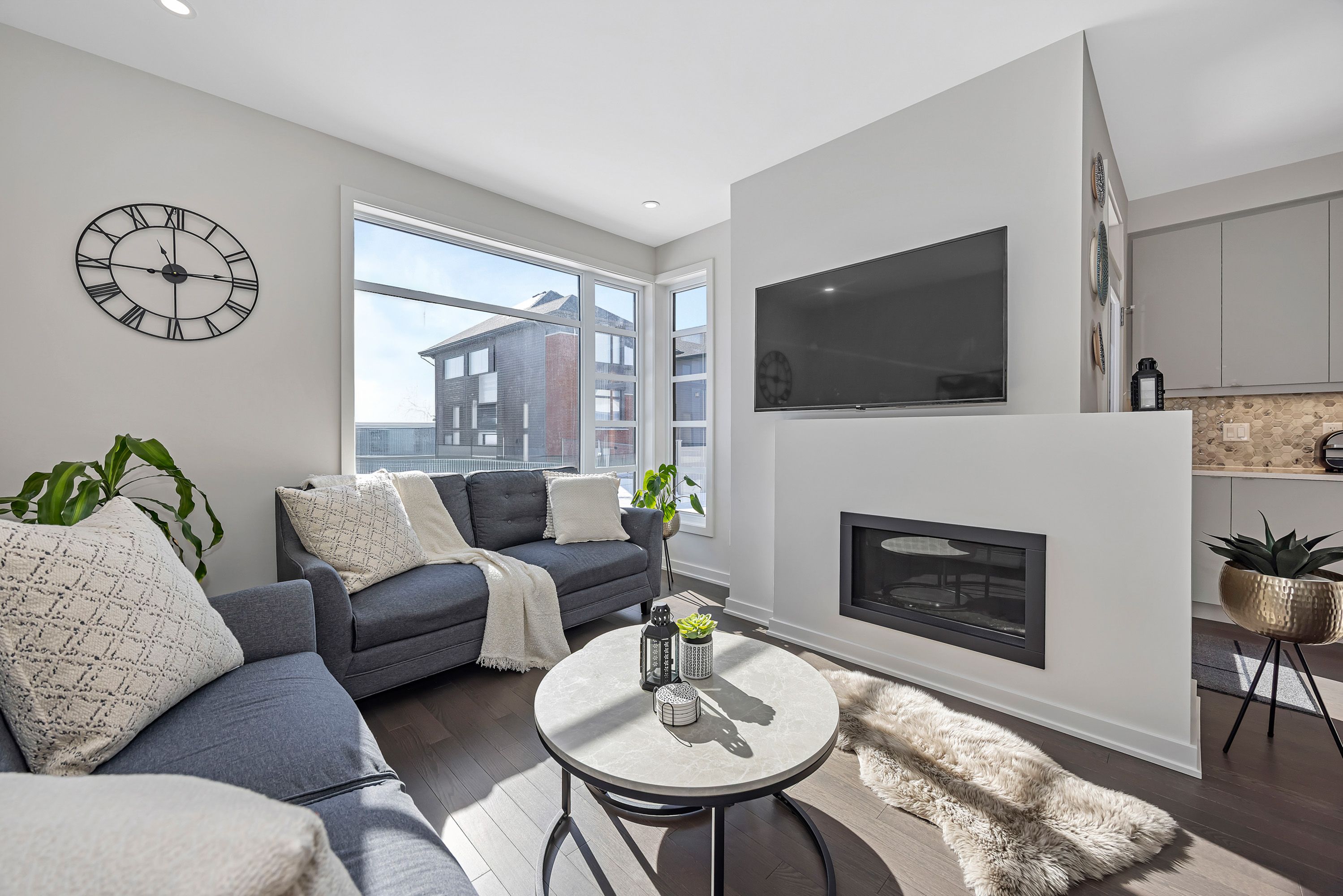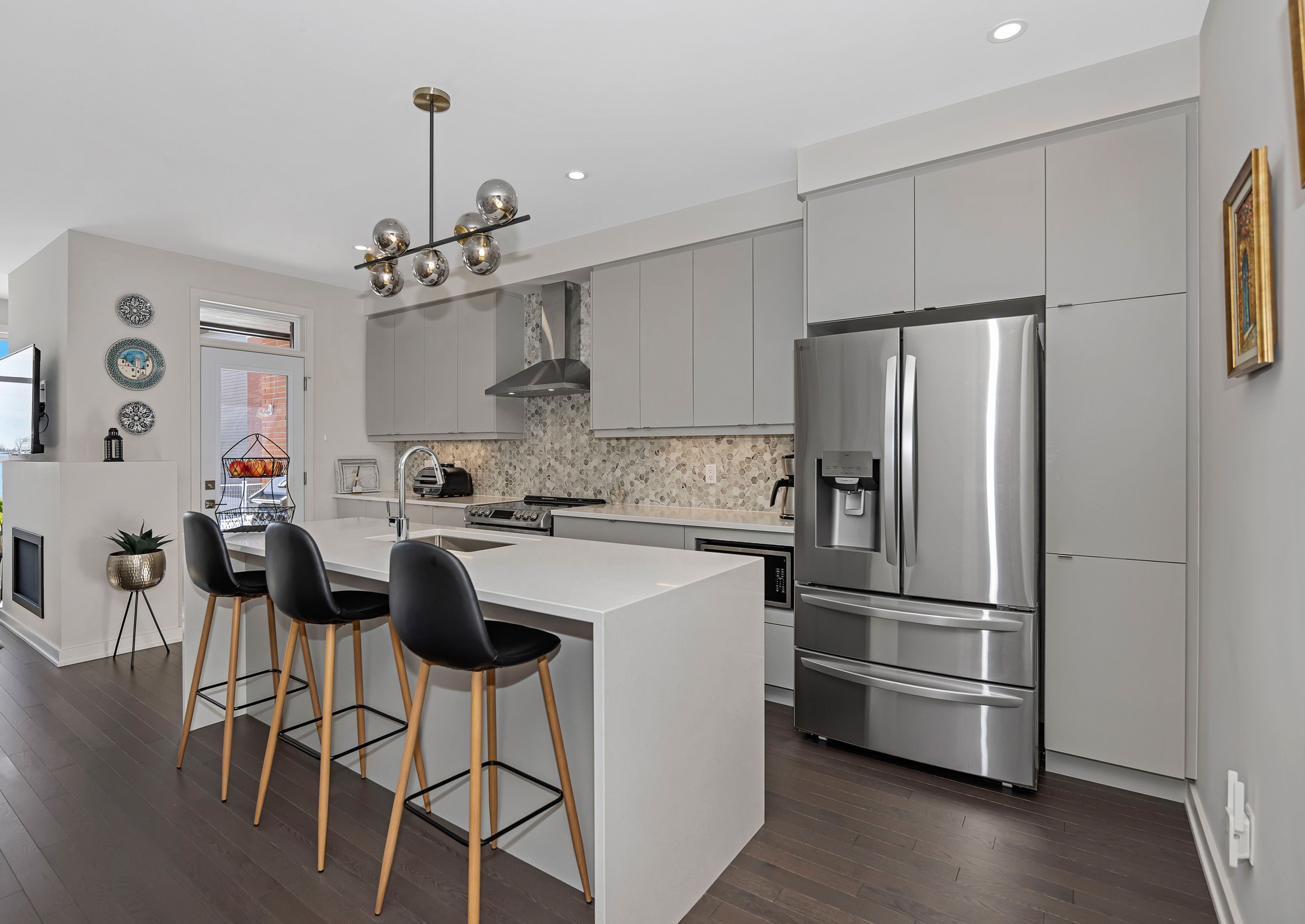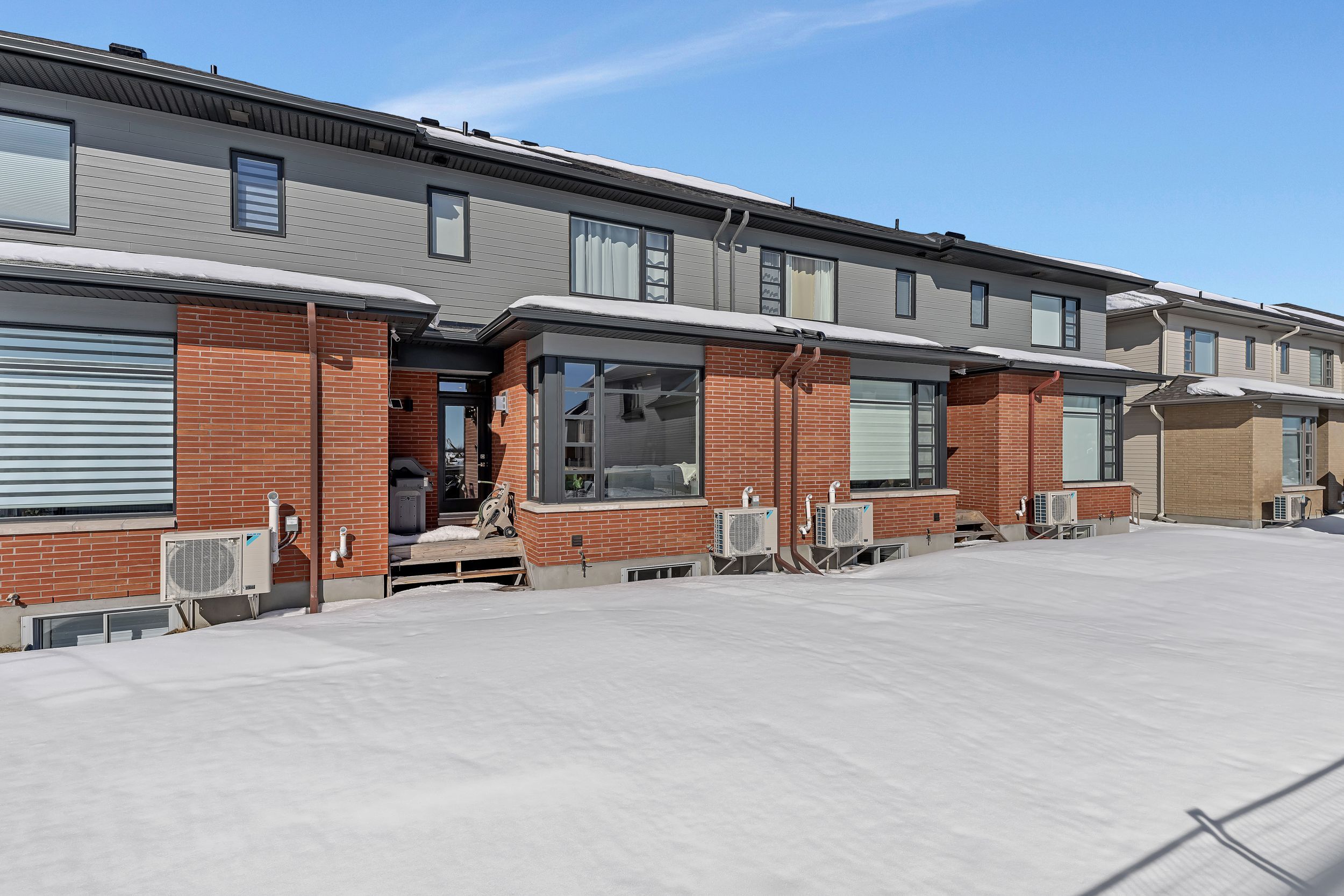Quality built by award-winning hn homes and sun-filled in riverside south, this superior weston executive townhome offers 2,112 sq ft of interior living space (as per builder) with an elegant, contemporary layout. A rare opportunity to own a near-new home in pristine condition, enhanced with premium upgrades & smart extras. The open-concept main level is awash in natural light, with oversized windows creating a bright, upscale ambiance throughout. Rich hardwood floors, 9'+ ceilings, steel & glass railings, & cozy gas fireplace add warmth and sophistication. The gourmet kitchen shines with ultra-resistant, eco-friendly pet (polyethylene terephthalate) cabinetry to the ceiling w/ soft-close doors/drawers, pantry, breakfast bar, stainless steel appliances, upgraded backsplash & oversized quartz counters with striking waterfall edge. Gas lines for the stove and bbq plus water line for the fridge are in place, pet cabinetry continues in both bathrooms and the laundry room for a cohesive, modern look. Up the extra-wide hardwood staircase to three generous bedrooms, two full baths, an upgraded laundry room, and a versatile loft-ideal for a home office, lounge, or reading retreat. The primary suite is a sanctuary with coffered ceiling, large walk-in closet, and spa-like ensuite with double vanity and glass corner shower. The finished lower level expands the living space with a large family room, egress window, abundant storage, and rough-in for a future 3-piece bath. Enjoy southern rear exposure and a completed sodded yard. Outside, solid brick and luxury hardy board siding adds lasting curb appeal, while the insulated garage keeps seasons comfortable. Additional highlights include whisper-quiet central a/c, eavestroughs with gutter guards, wi-fi thermostat, large mudroom, pre-rough in for ev charger, pre-wire for upstairs wi-fi extender and future solar panels, plus electrical/cable for wall-mounted tvs on all floors. Move-in ready . 24 hours irrevocable on all offers.
