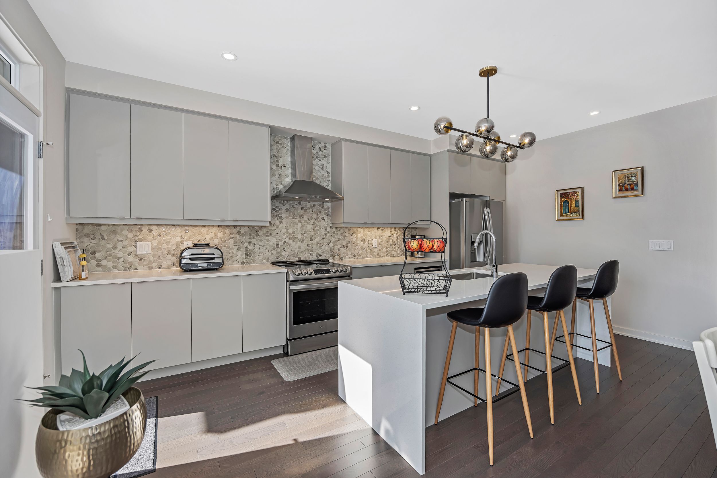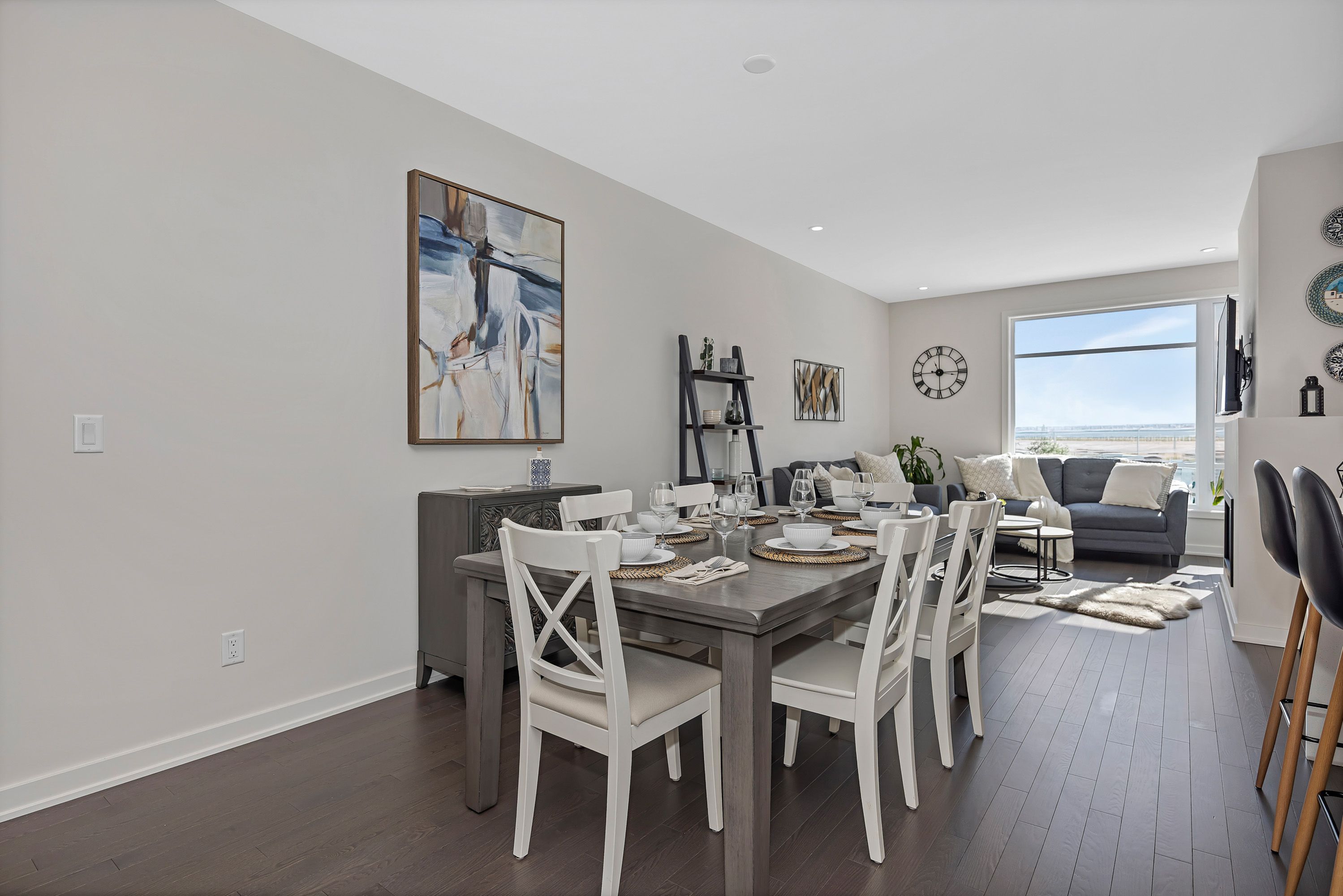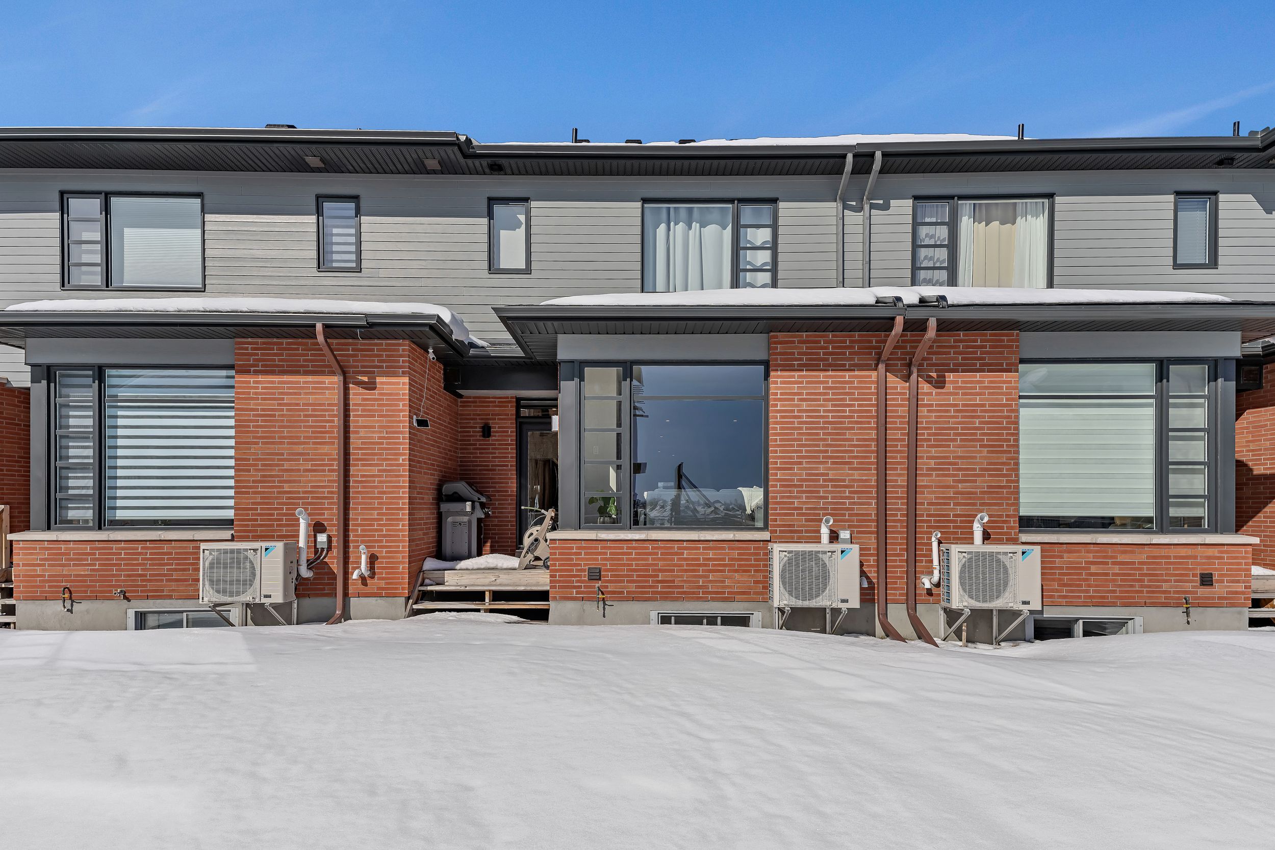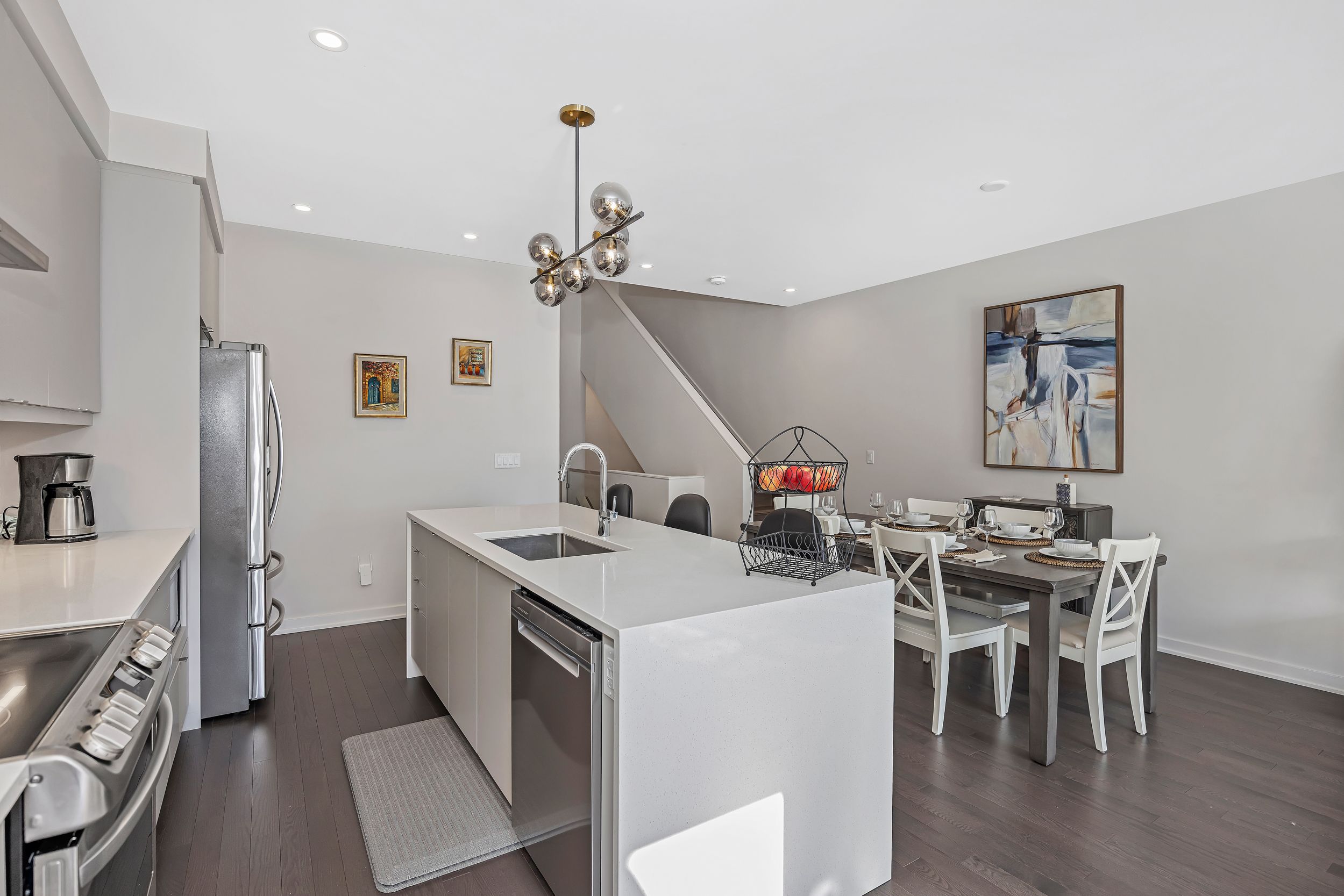 Quality built by award-winning hn homes and sun-filled in riverside south, this superior weston executive townhome offers 2,112 sq ft of interior living space (as per builder) with an elegant, contemporary layout. A rare opportunity to own a near-new home in pristine condition, enhanced with premium upgrades & smart extras. The open-concept main level is awash in natural light, with oversized windows creating a bright, upscale ambiance throughout. Rich hardwood floors, 9'+ ceilings, steel & glass railings, & cozy gas fireplace add warmth and sophistication. The gourmet kitchen shines with ultra-resistant, eco-friendly pet (polyethylene terephthalate) cabinetry to the ceiling w/ soft-close doors/drawers, pantry, breakfast bar, stainless steel appliances, upgraded backsplash & oversized quartz counters with striking waterfall edge. Gas lines for the stove and bbq plus water line for the fridge are in place, pet cabinetry continues in both bathrooms and the laundry room for a cohesive, modern look. Up the extra-wide hardwood staircase to three generous bedrooms, two full baths, an upgraded laundry room, and a versatile loft-ideal for a home office, lounge, or reading retreat. The primary suite is a sanctuary with coffered ceiling, large walk-in closet, and spa-like ensuite with double vanity and glass corner shower. The finished lower level expands the living space with a large family room, egress window, abundant storage, and rough-in for a future 3-piece bath. Enjoy southern rear exposure and a completed sodded yard. Outside, solid brick and luxury hardy board siding adds lasting curb appeal, while the insulated garage keeps seasons comfortable. Additional highlights include whisper-quiet central a/c, eavestroughs with gutter guards, wi-fi thermostat, large mudroom, pre-rough in for ev charger, pre-wire for upstairs wi-fi extender and future solar panels, plus electrical/cable for wall-mounted tvs on all floors. Move-in ready . 24 hours irrevocable on all offers.