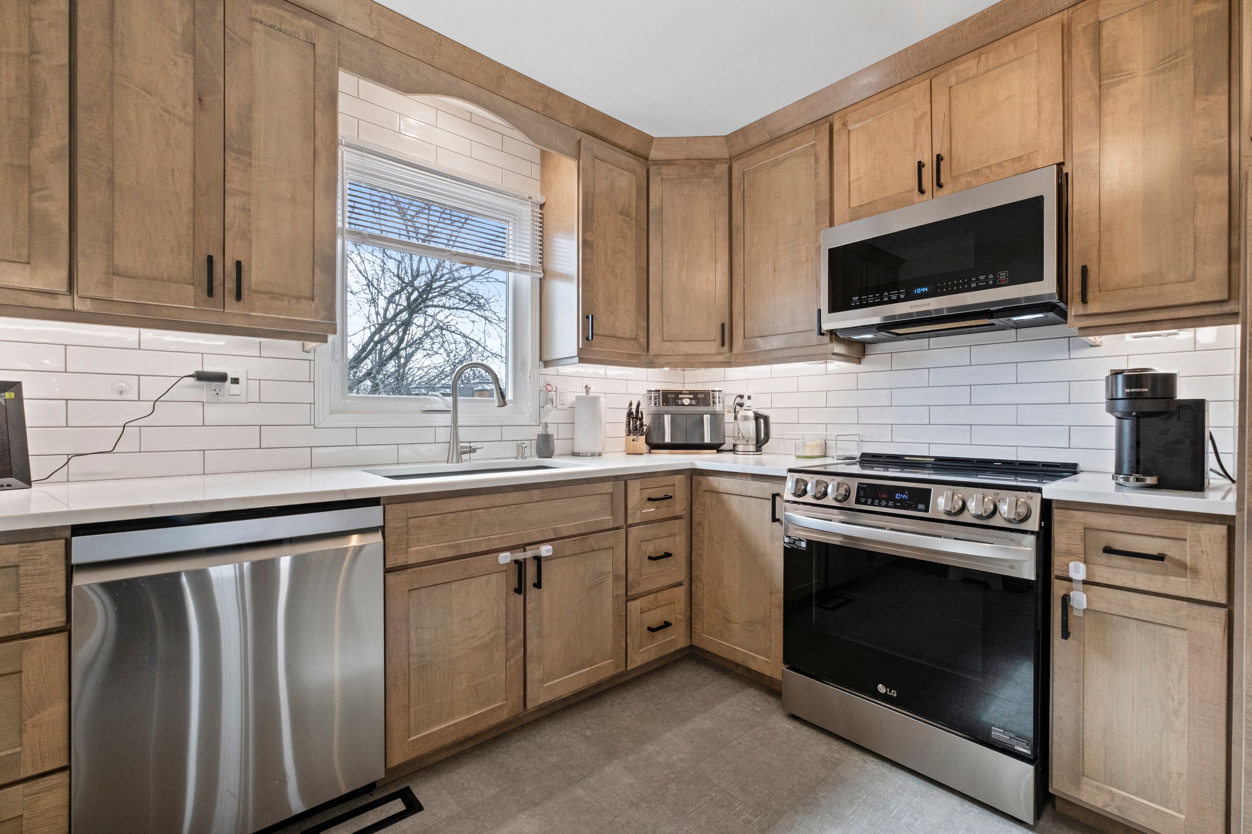 • Mennonite-crafted kitchen with quartz countertops and new appliances.