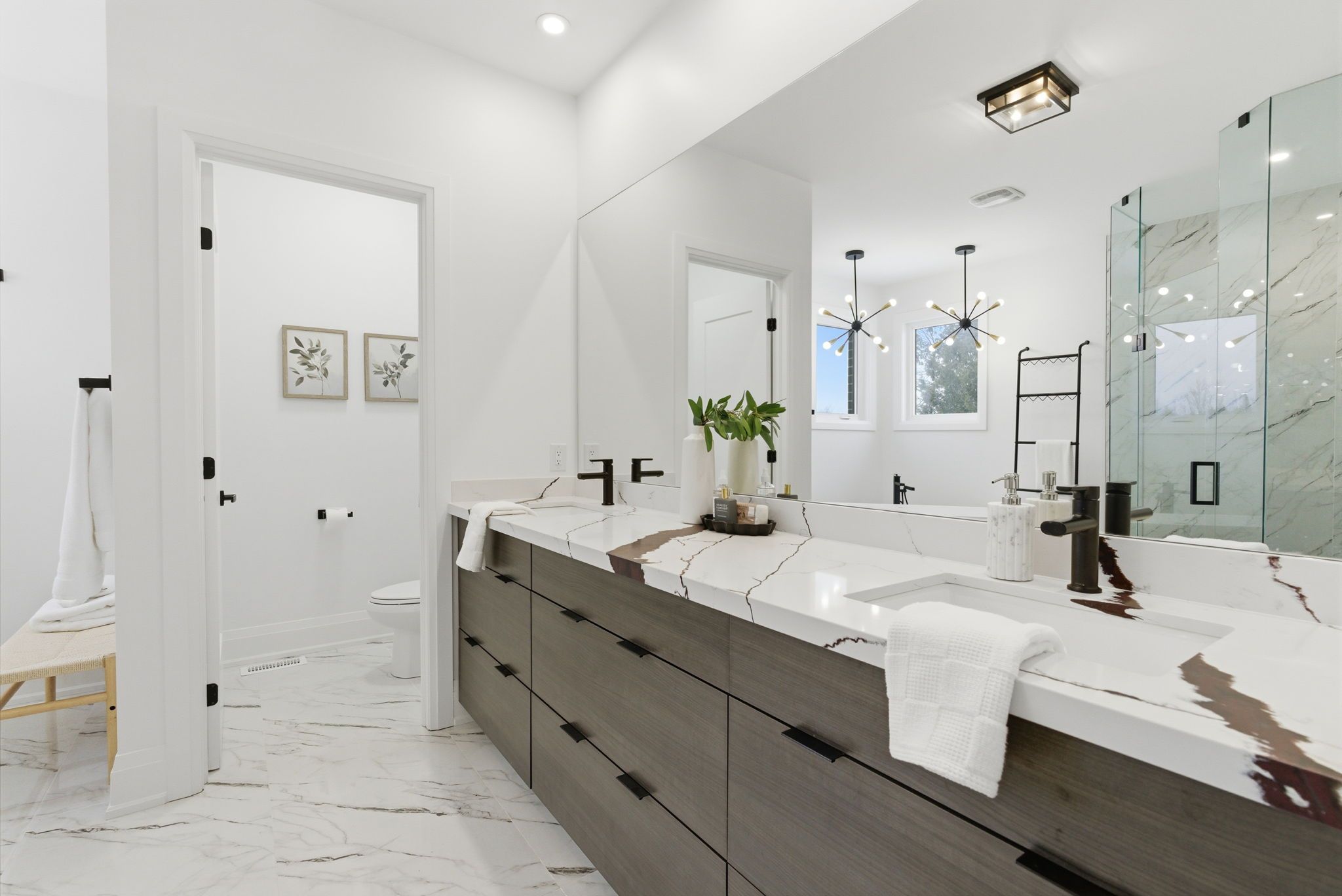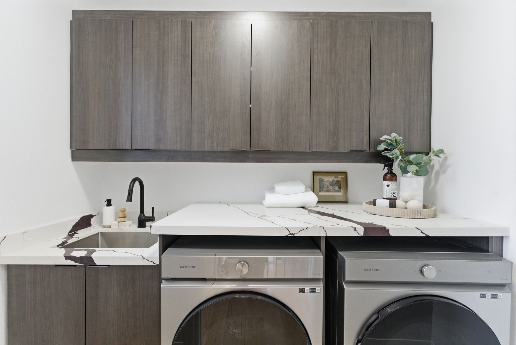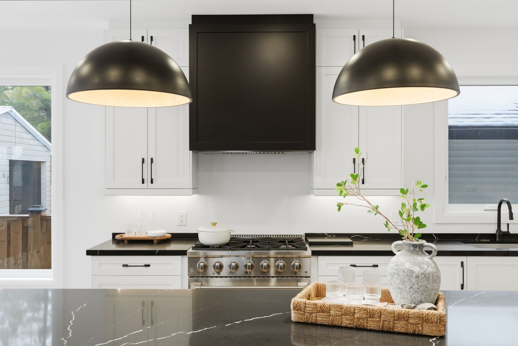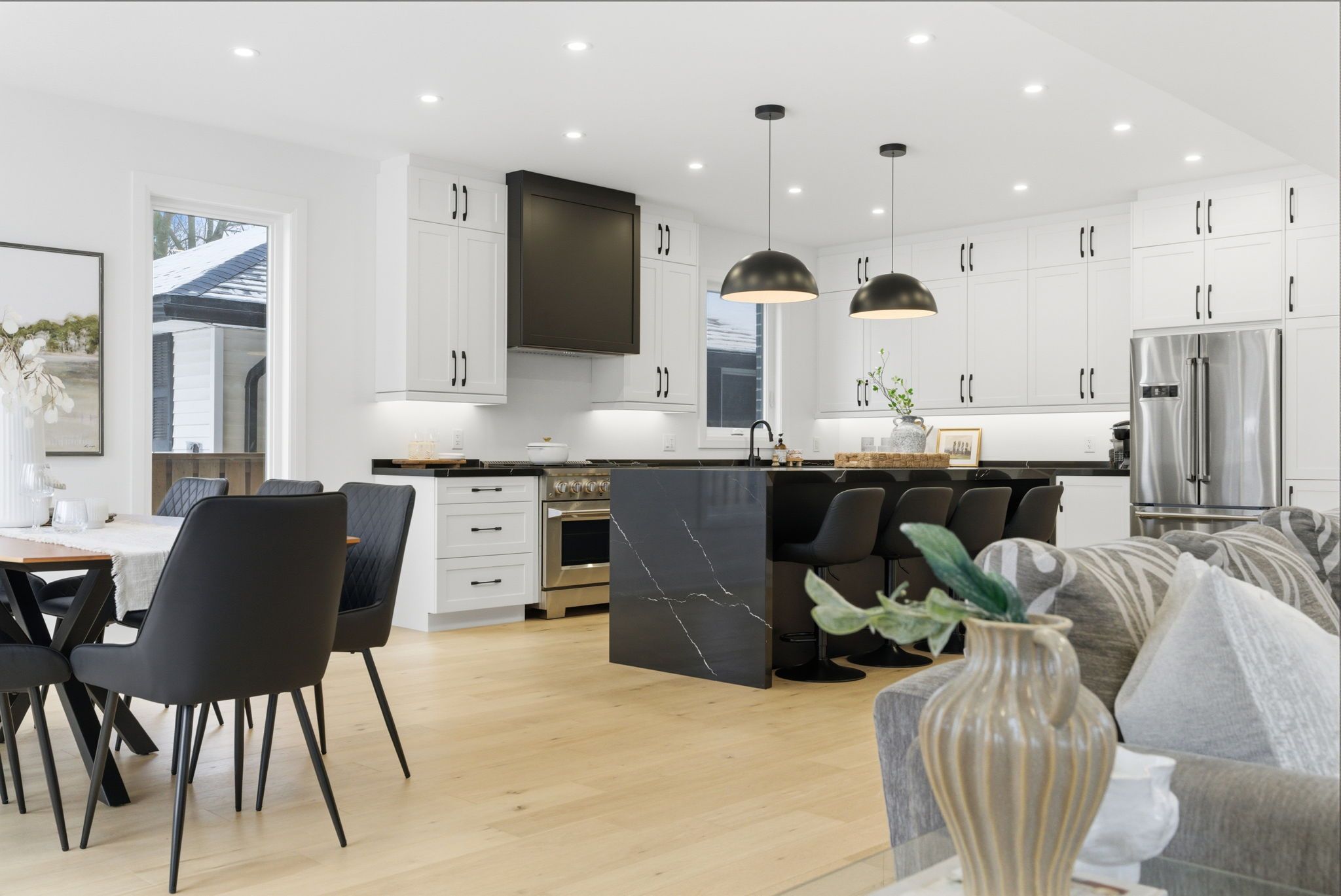 • Chef's kitchen featuring quartz waterfall island and stainless steel appliances.