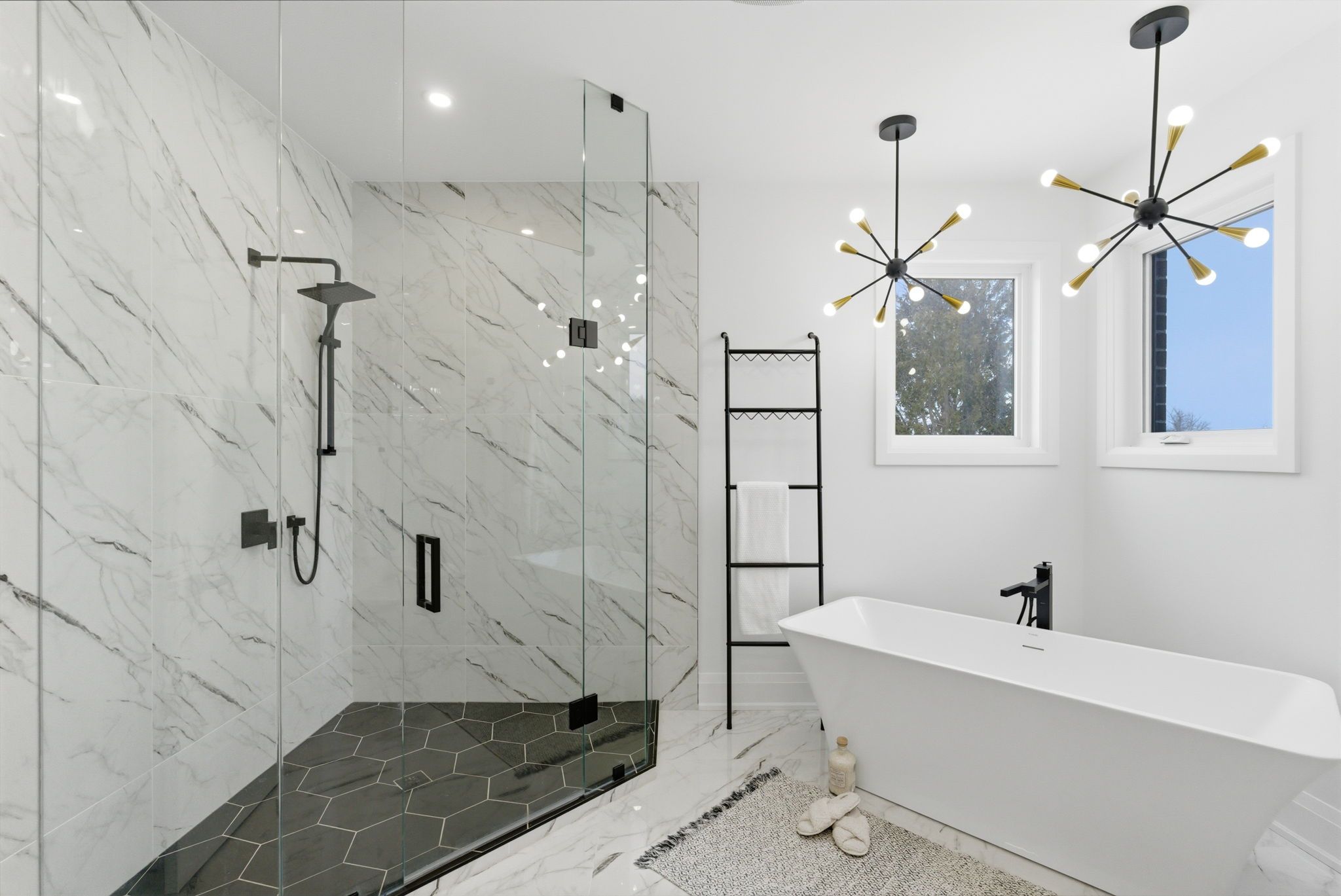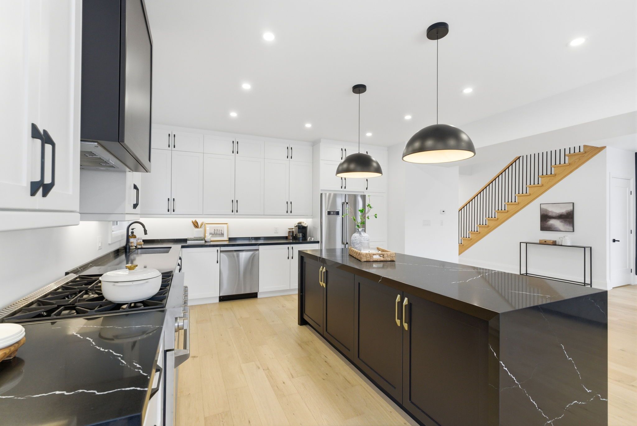 • Chef's kitchen features a quartz waterfall island and stainless steel appliances.