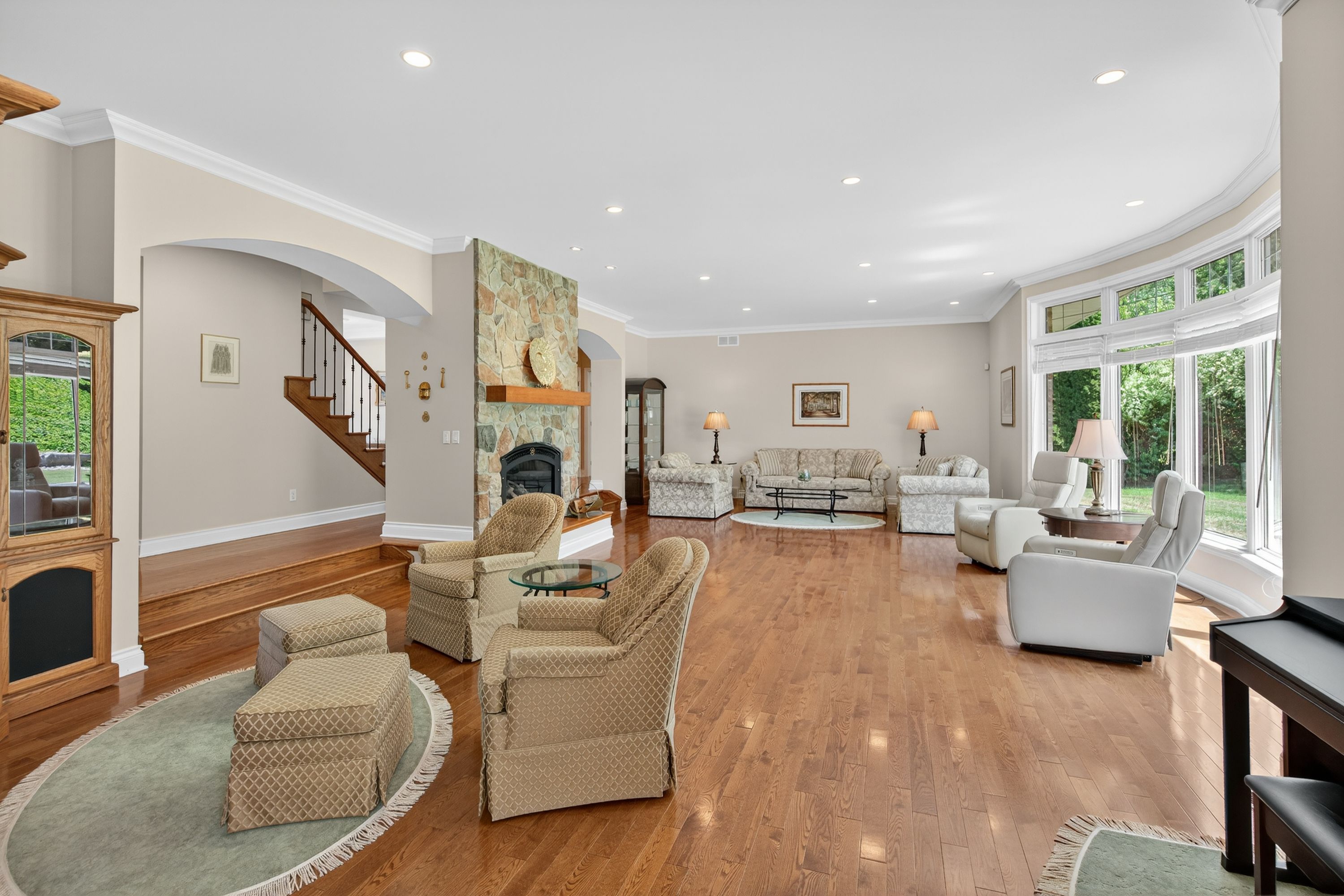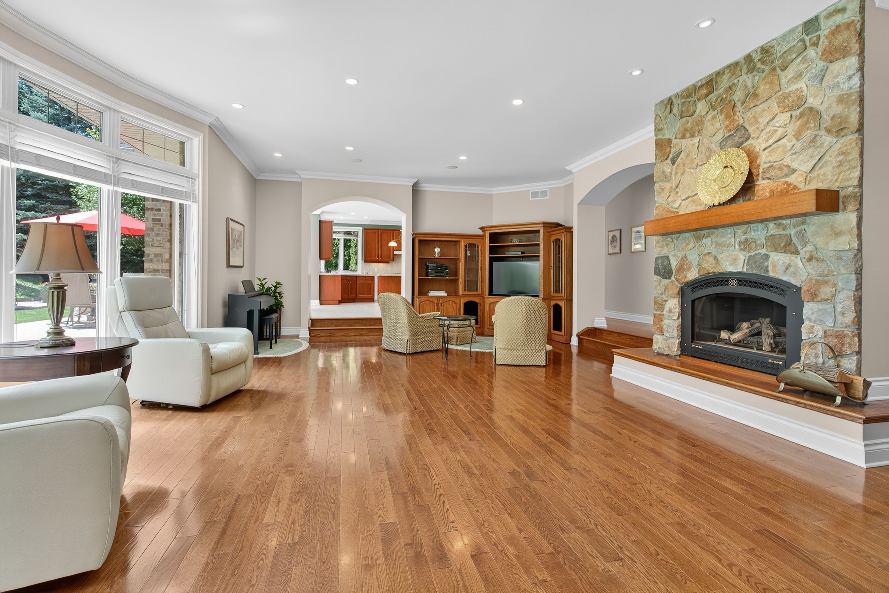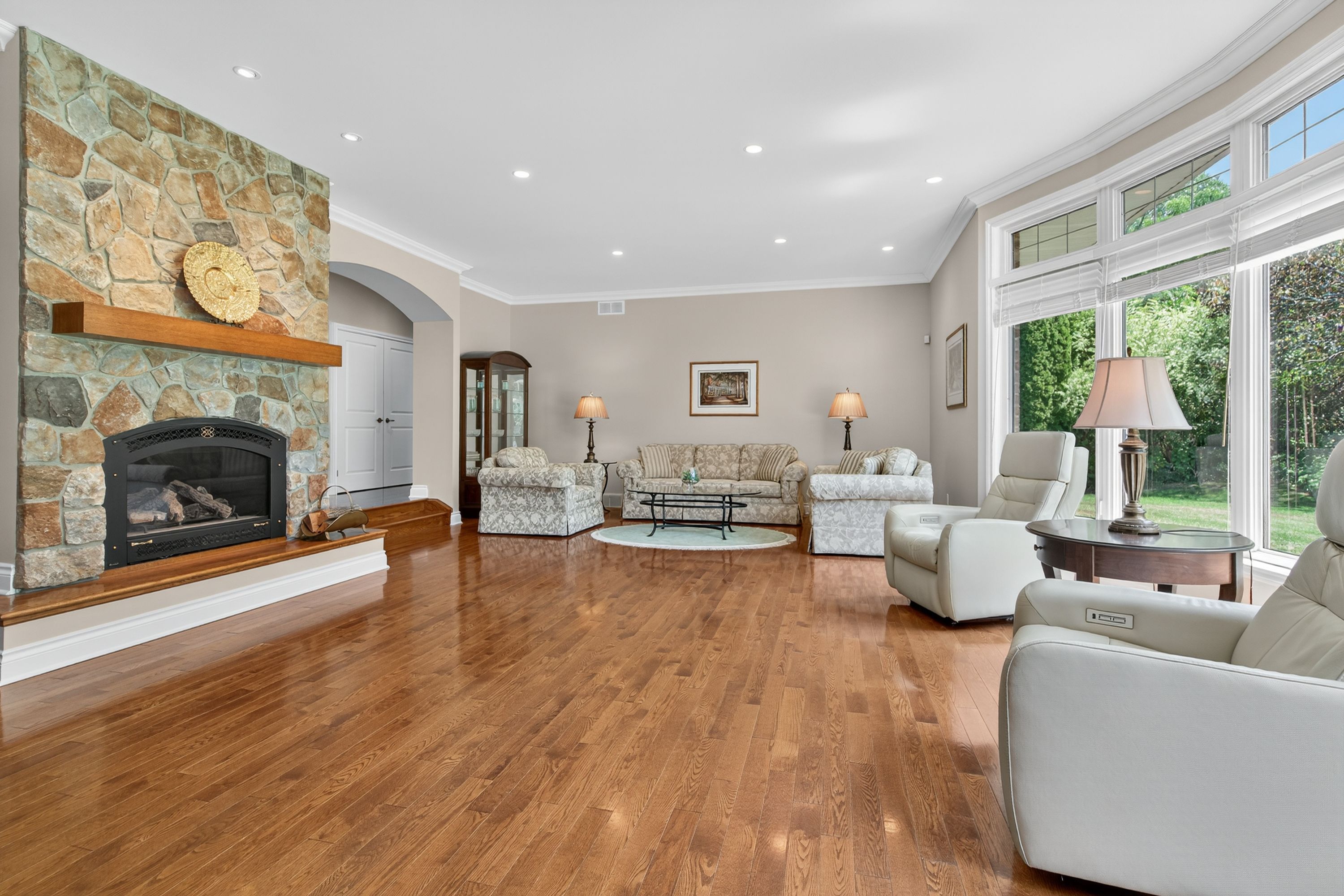 • Elegant interior featuring hardwood floors and a cozy stone fireplace.