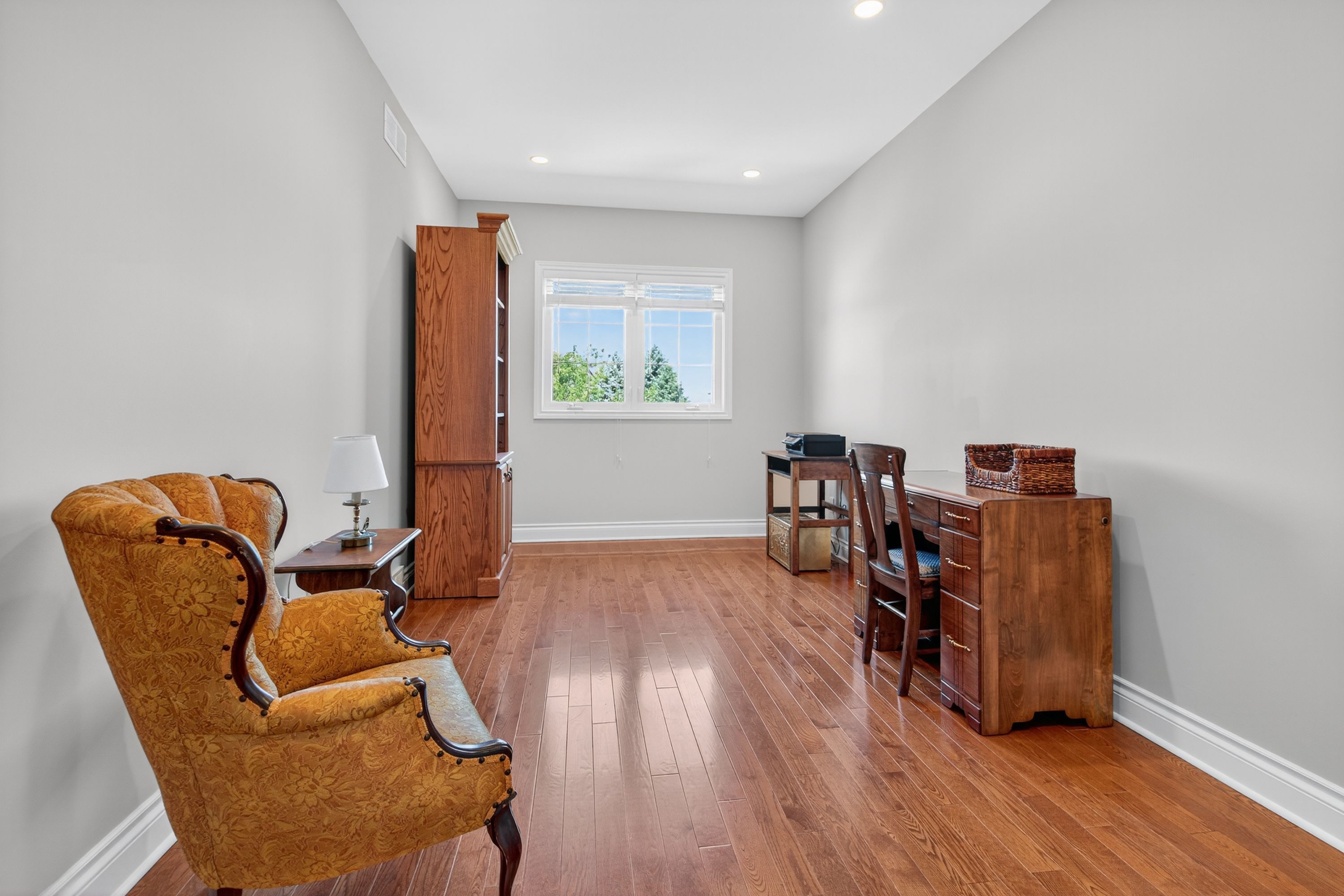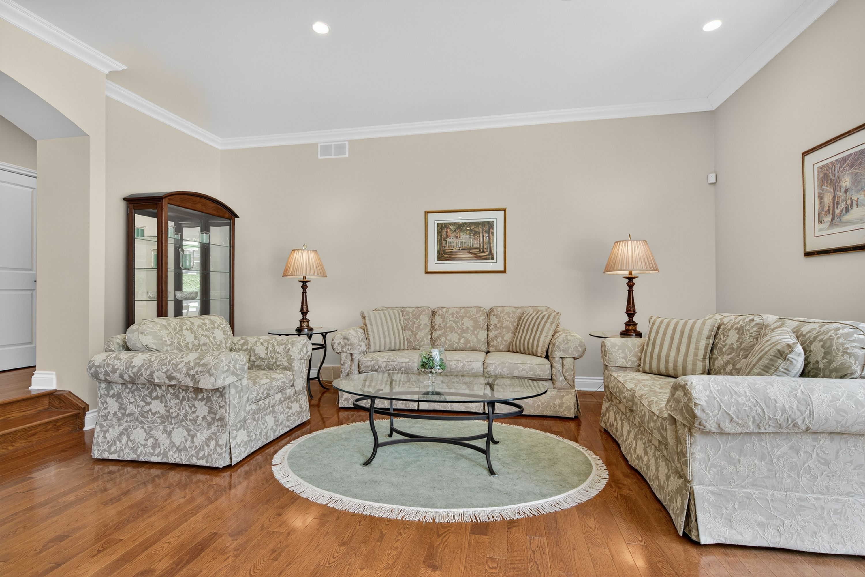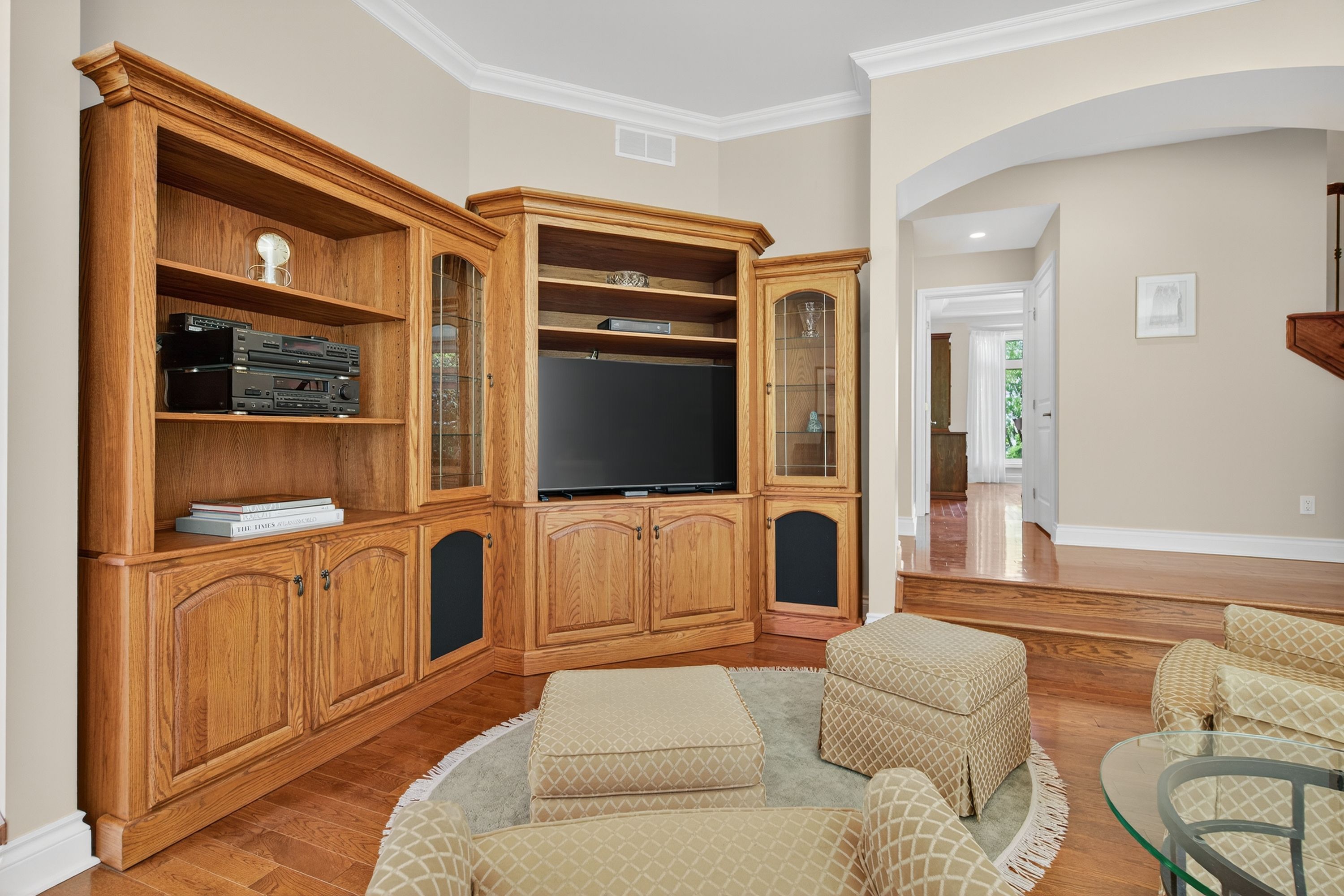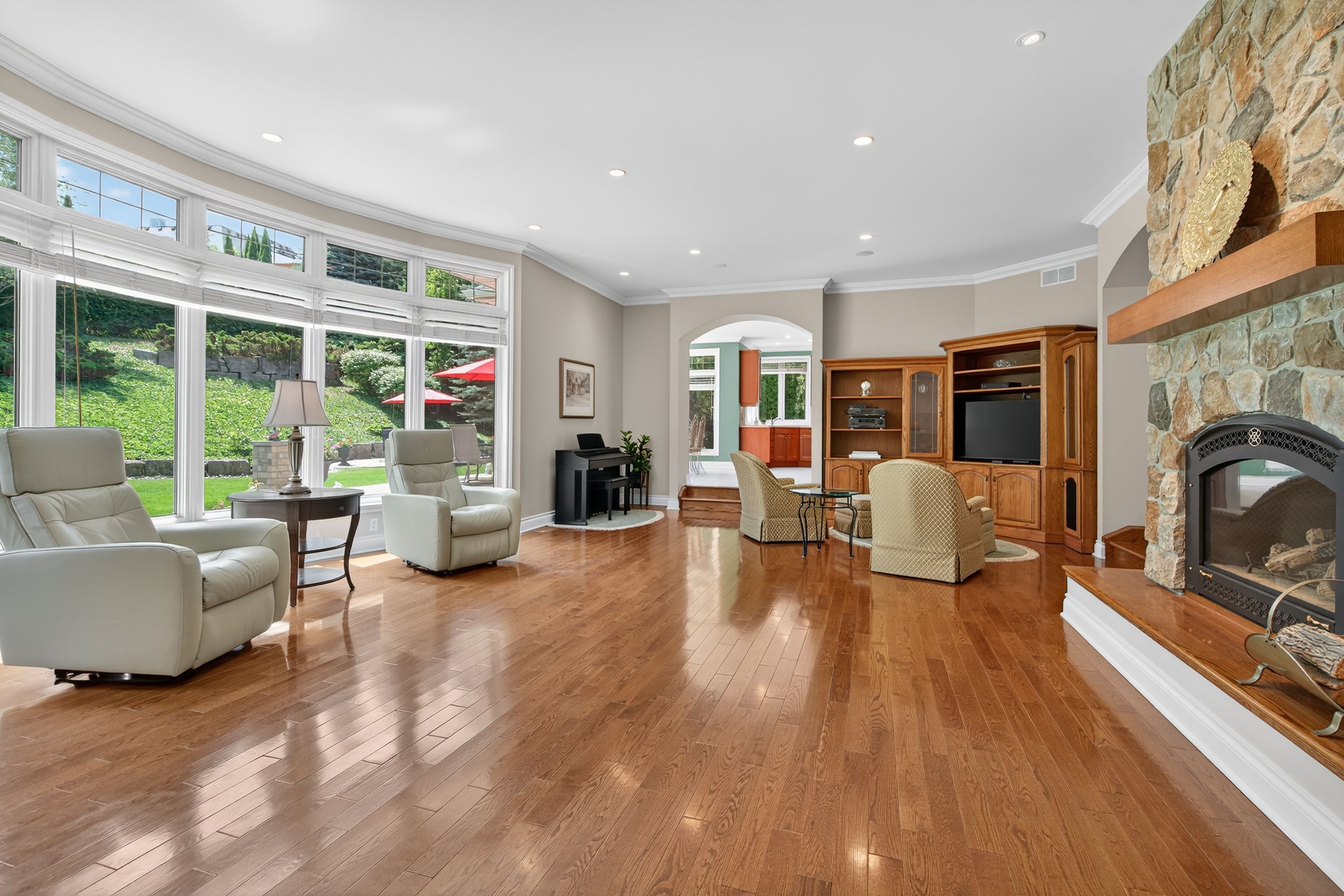 • Elegant interior featuring hardwood floors and a cozy stone fireplace.