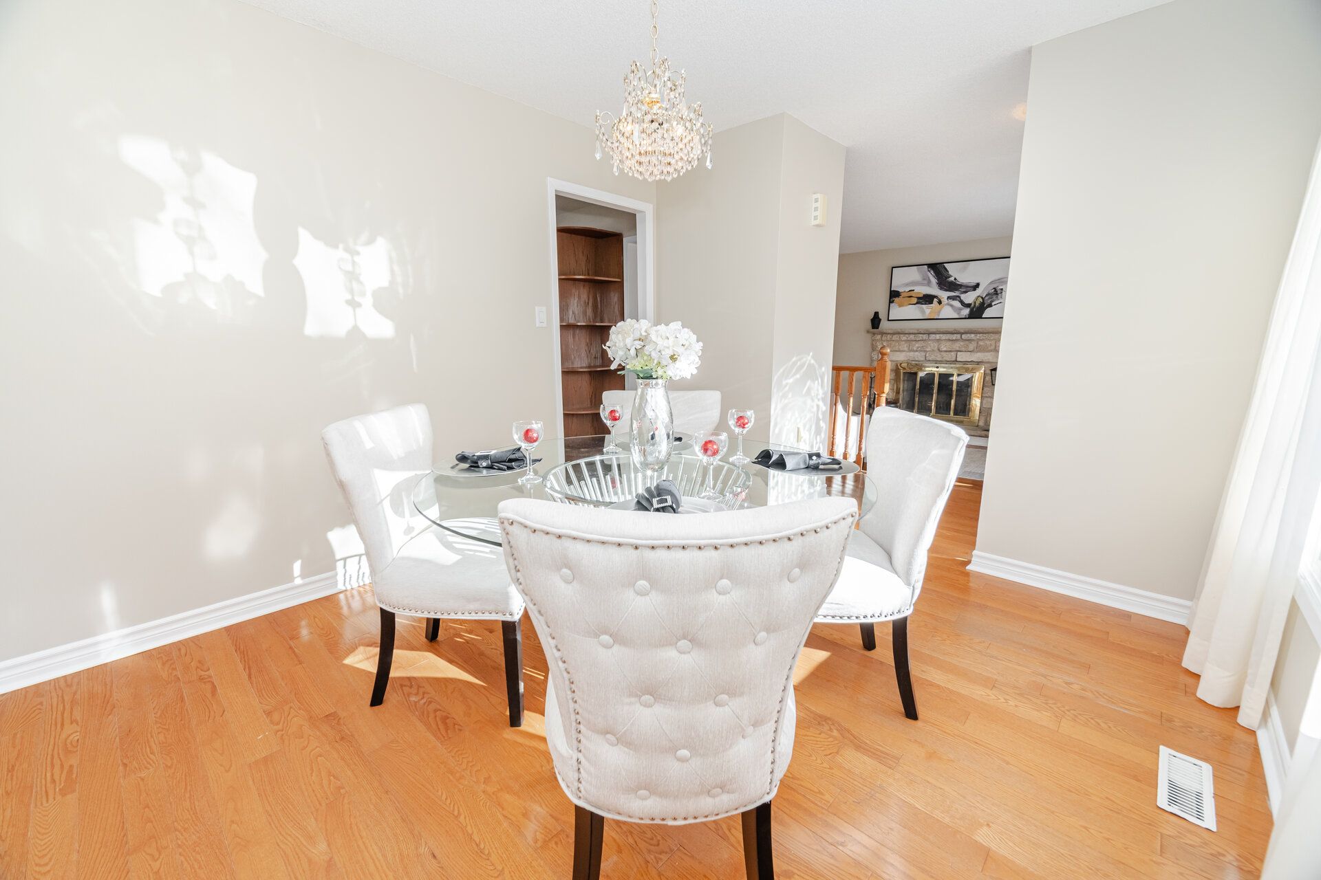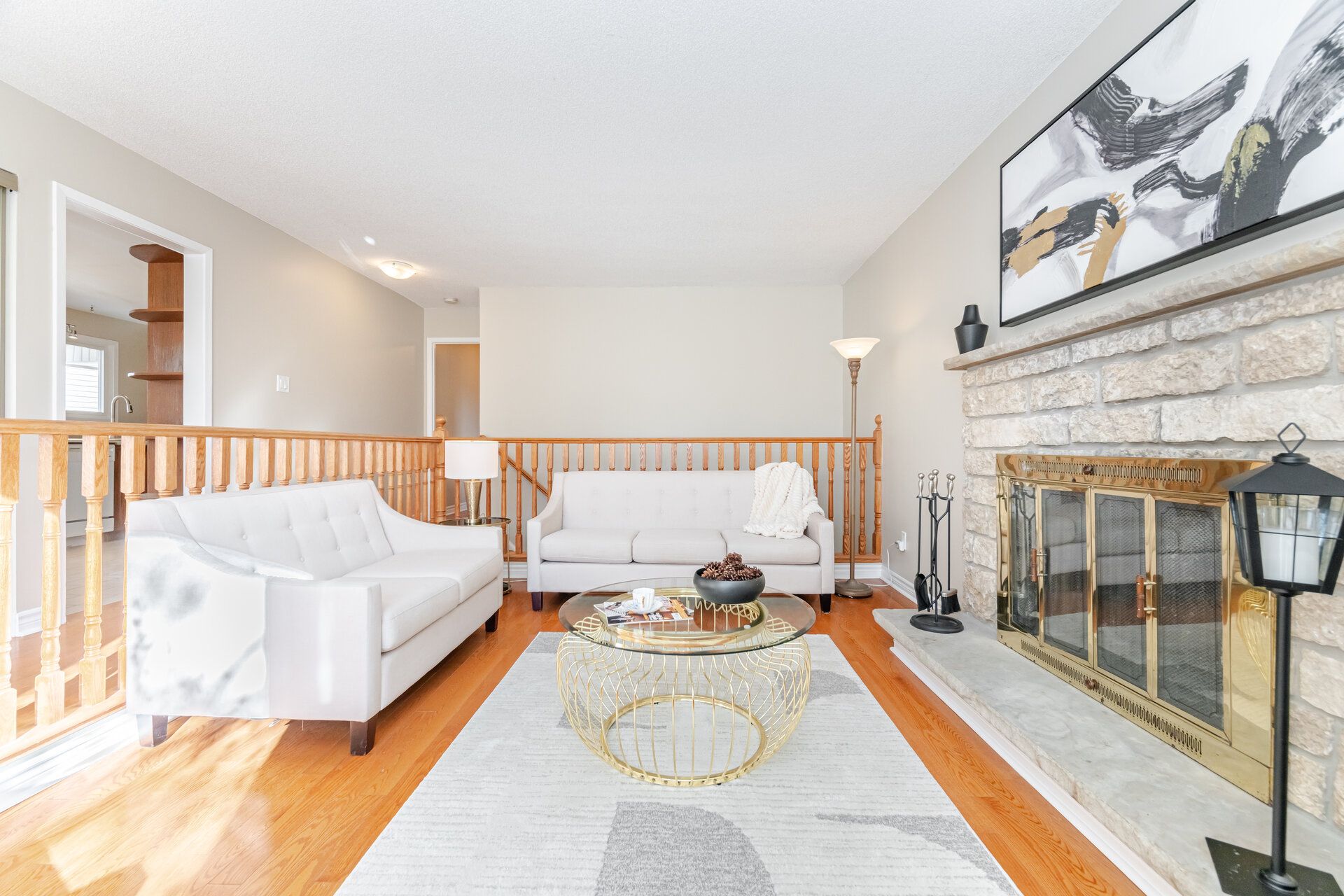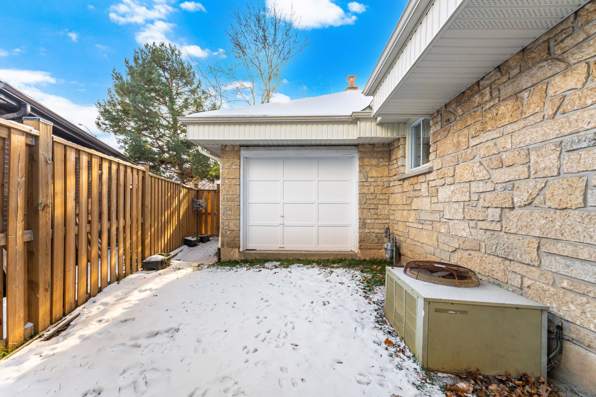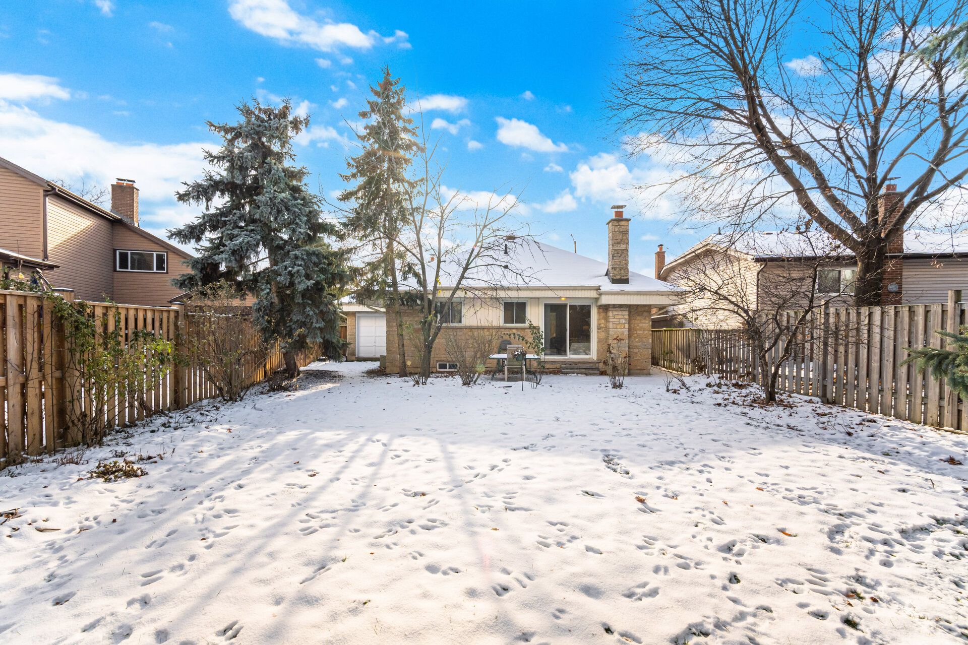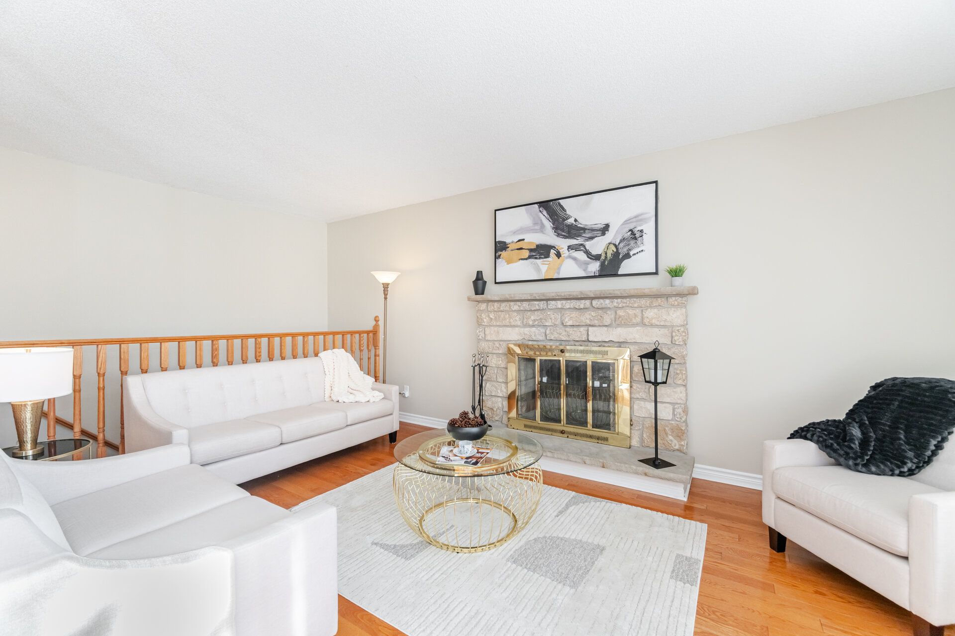 This meadowvale bungalow offers seamless single-level living with convenient access to shopping, public transit, and major transportation routes, presenting an excellent opportunity for buyers prioritizing location, style, and comfort with excellent walk scores. The residence features a distinguished stone brick exterior and extensive interlocking pathways, leading from the driveway along both sides of the property and rear patio area. The front entry with stone steps opens to a spacious foyer, where high-quality solid hardwood flooring extends throughout the main hallway, dining area, living room, and all bedrooms. The sunken living room is accentuated by a large window and a classic brick fireplace, creating an inviting ambiance. A separate formal dining room provides an ideal setting for family gatherings. The generously sized eat-in kitchen is equipped with ample cabinetry and counter space for efficient meal preparation and includes a sliding door walkout to facilitate outdoor grilling. All three bedrooms feature hardwood flooring, with the primary bedroom offering two large closets and direct access via a sliding walkout to the private, landscaped rear patio. The oversized attached garage adds further utility with a second roll-up door at the rear, allowing direct entry to the backyard. The finished lower level includes a spacious 38' open-concept recreational room with a wall-to-wall fireplace, a 3-piece bathroom, dedicated laundry area, a versatile utility or workshop measuring approximately 17'x16', and a walk-in closet suitable for seasonal storage. Recent enhancements to the property comprise comprehensive updates to the interlocking driveway, walkway, and rear patio, as well as improvements to the roof, eaves, soffit, fascia, windows (including two sliding walkouts), installation of a steel insulated garage door, and a central vacuum system. Both fireplaces have not been recently used.