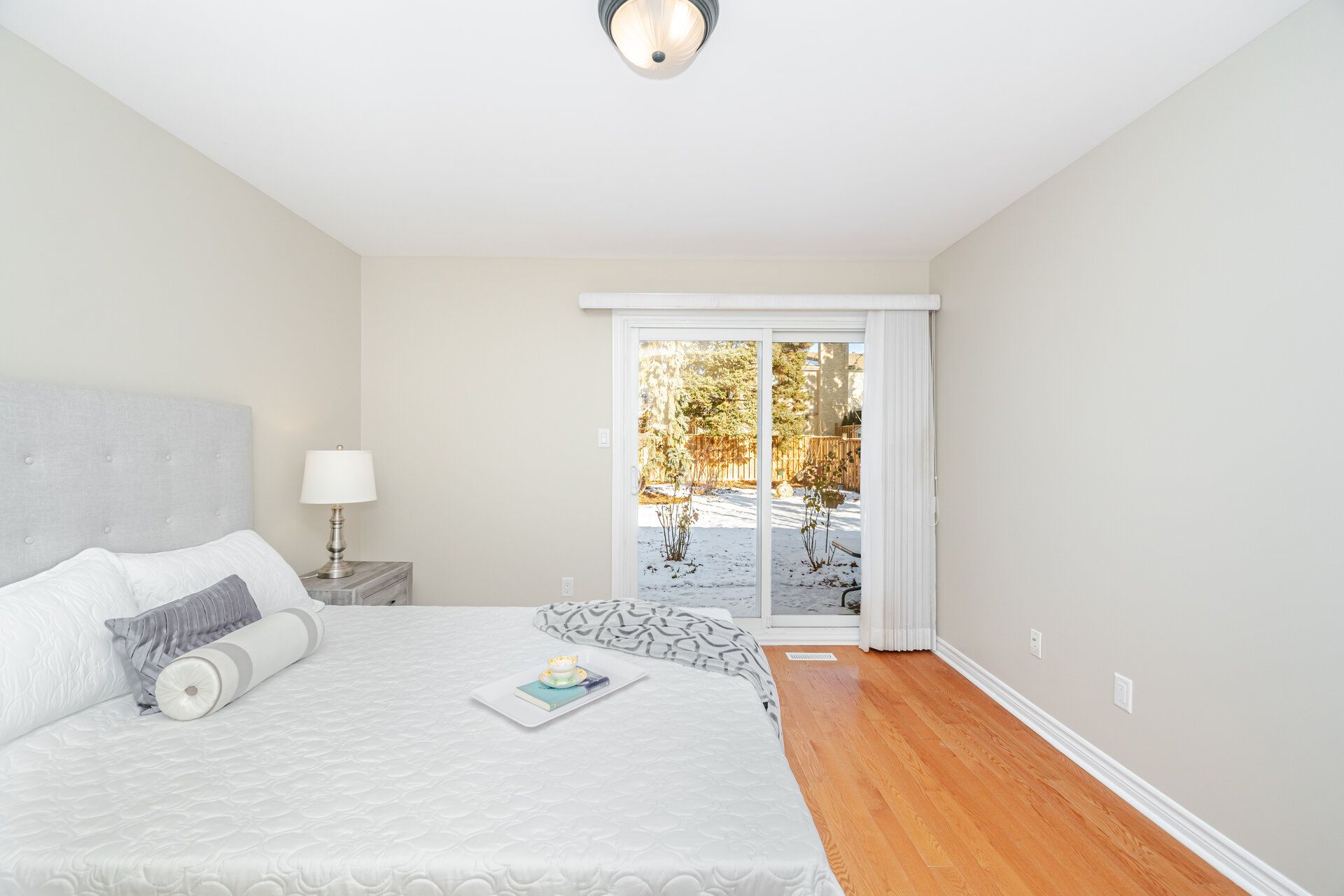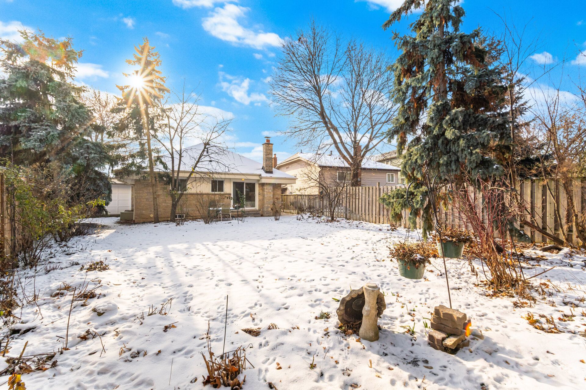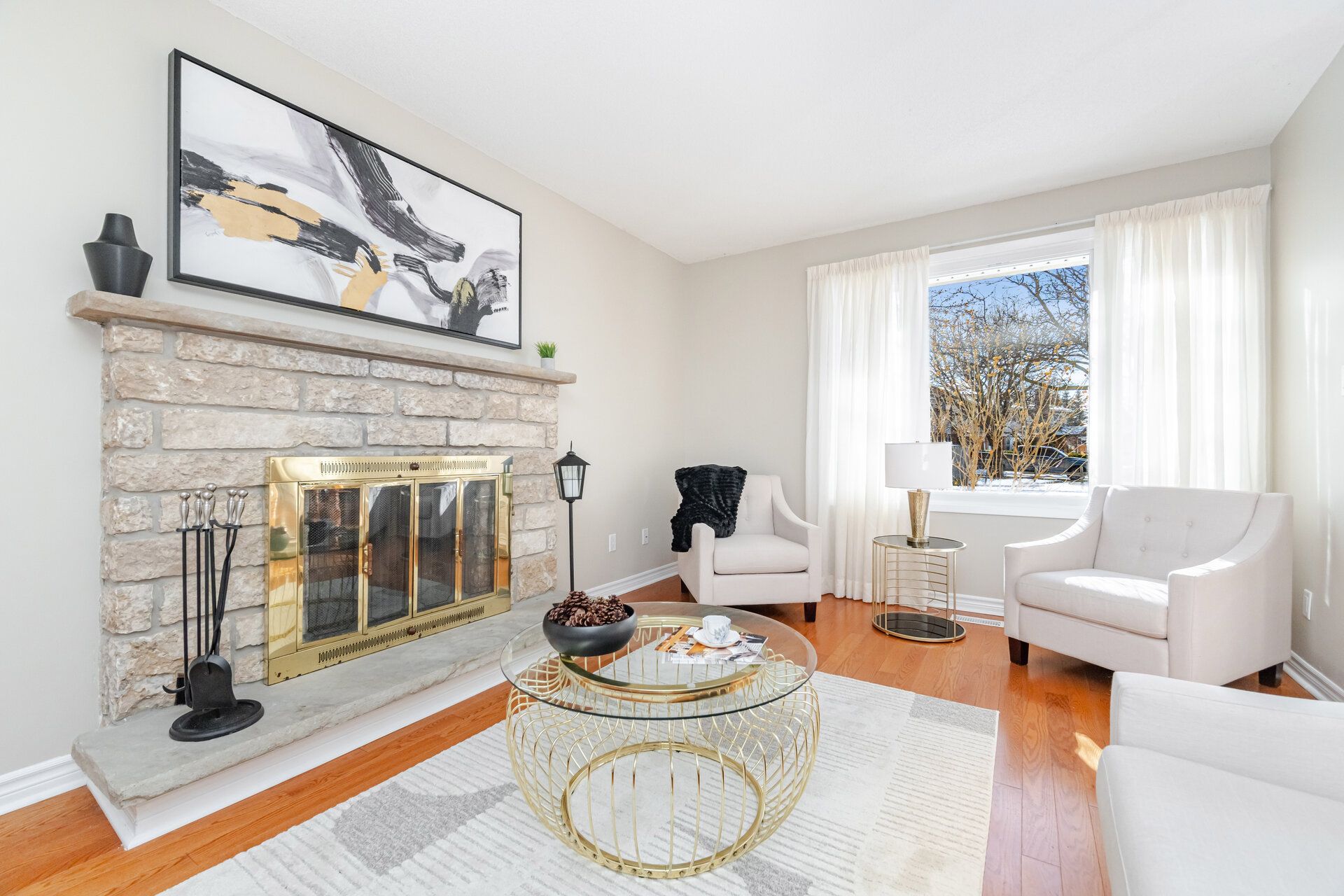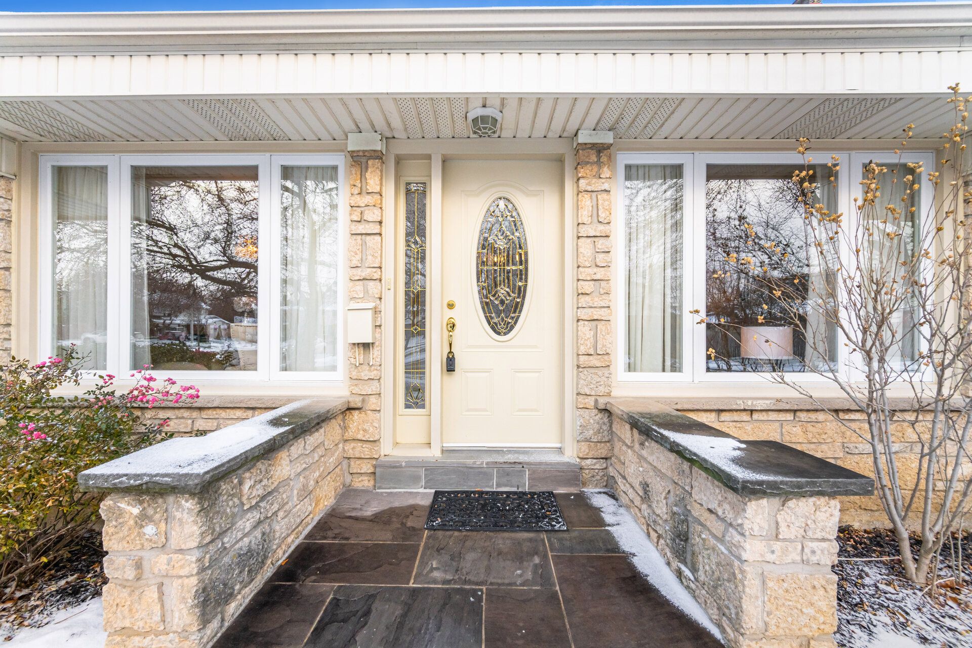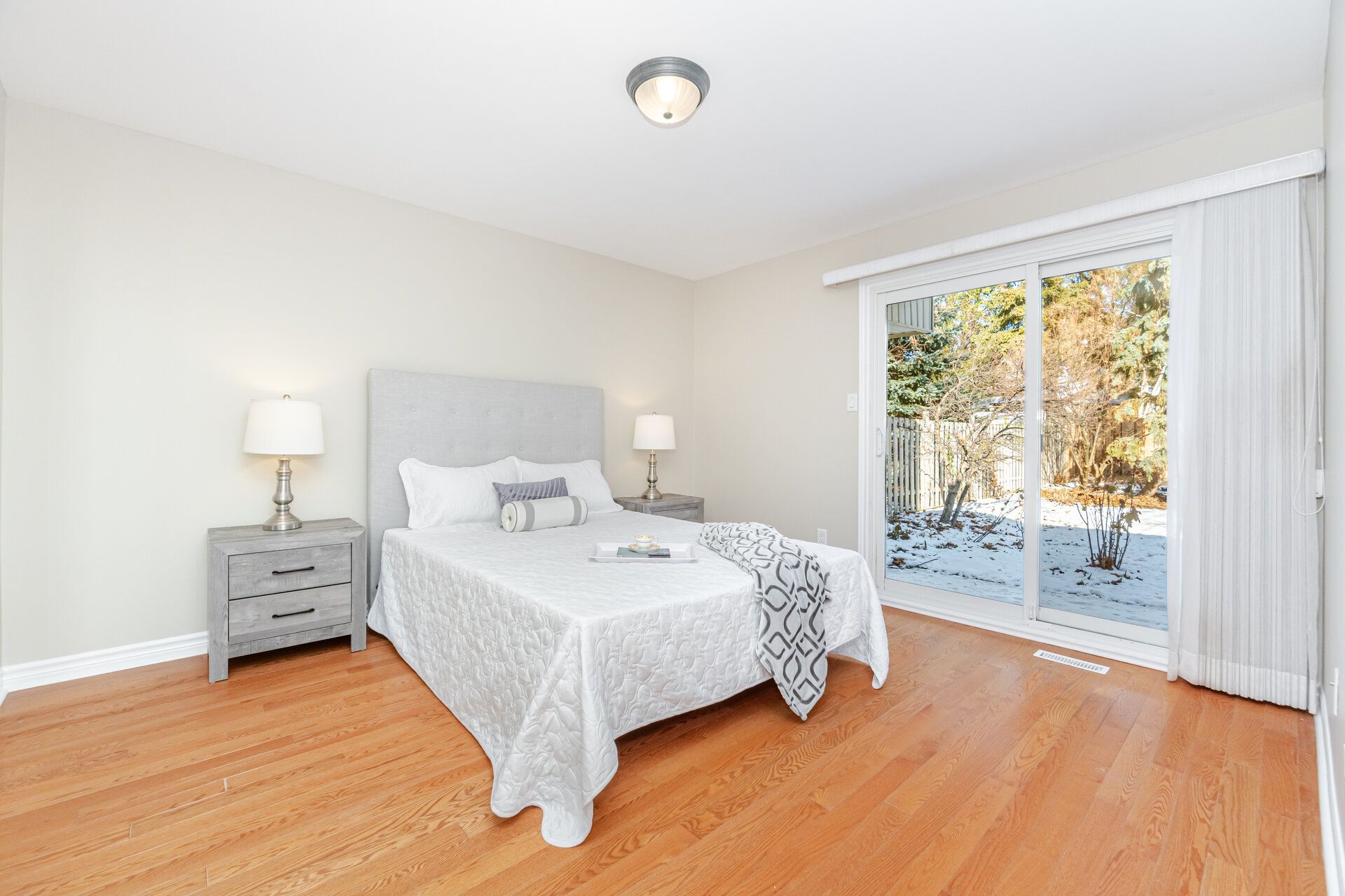 This meadowvale bungalow offers seamless single-level living with convenient access to shopping, public transit, and major transportation routes, presenting an excellent opportunity for buyers prioritizing location, style, and comfort with excellent walk scores. The residence features a distinguished stone brick exterior and extensive interlocking pathways, leading from the driveway along both sides of the property and rear patio area. The front entry with stone steps opens to a spacious foyer, where high-quality solid hardwood flooring extends throughout the main hallway, dining area, living room, and all bedrooms. The sunken living room is accentuated by a large window and a classic brick fireplace, creating an inviting ambiance. A separate formal dining room provides an ideal setting for family gatherings. The generously sized eat-in kitchen is equipped with ample cabinetry and counter space for efficient meal preparation and includes a sliding door walkout to facilitate outdoor grilling. All three bedrooms feature hardwood flooring, with the primary bedroom offering two large closets and direct access via a sliding walkout to the private, landscaped rear patio. The oversized attached garage adds further utility with a second roll-up door at the rear, allowing direct entry to the backyard. The finished lower level includes a spacious 38' open-concept recreational room with a wall-to-wall fireplace, a 3-piece bathroom, dedicated laundry area, a versatile utility or workshop measuring approximately 17'x16', and a walk-in closet suitable for seasonal storage. Recent enhancements to the property comprise comprehensive updates to the interlocking driveway, walkway, and rear patio, as well as improvements to the roof, eaves, soffit, fascia, windows (including two sliding walkouts), installation of a steel insulated garage door, and a central vacuum system. Both fireplaces have not been recently used.