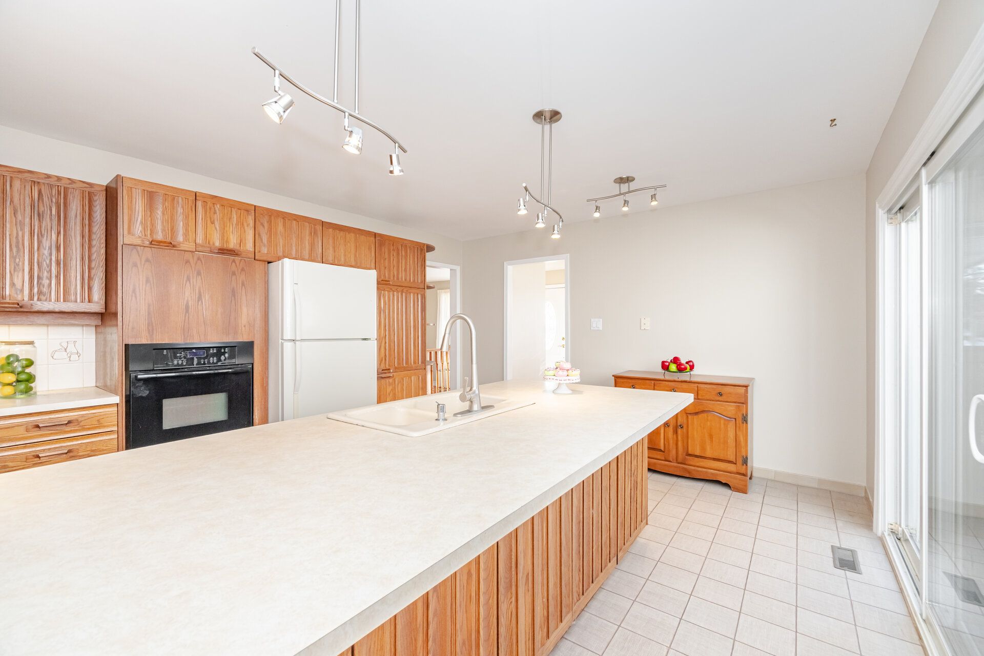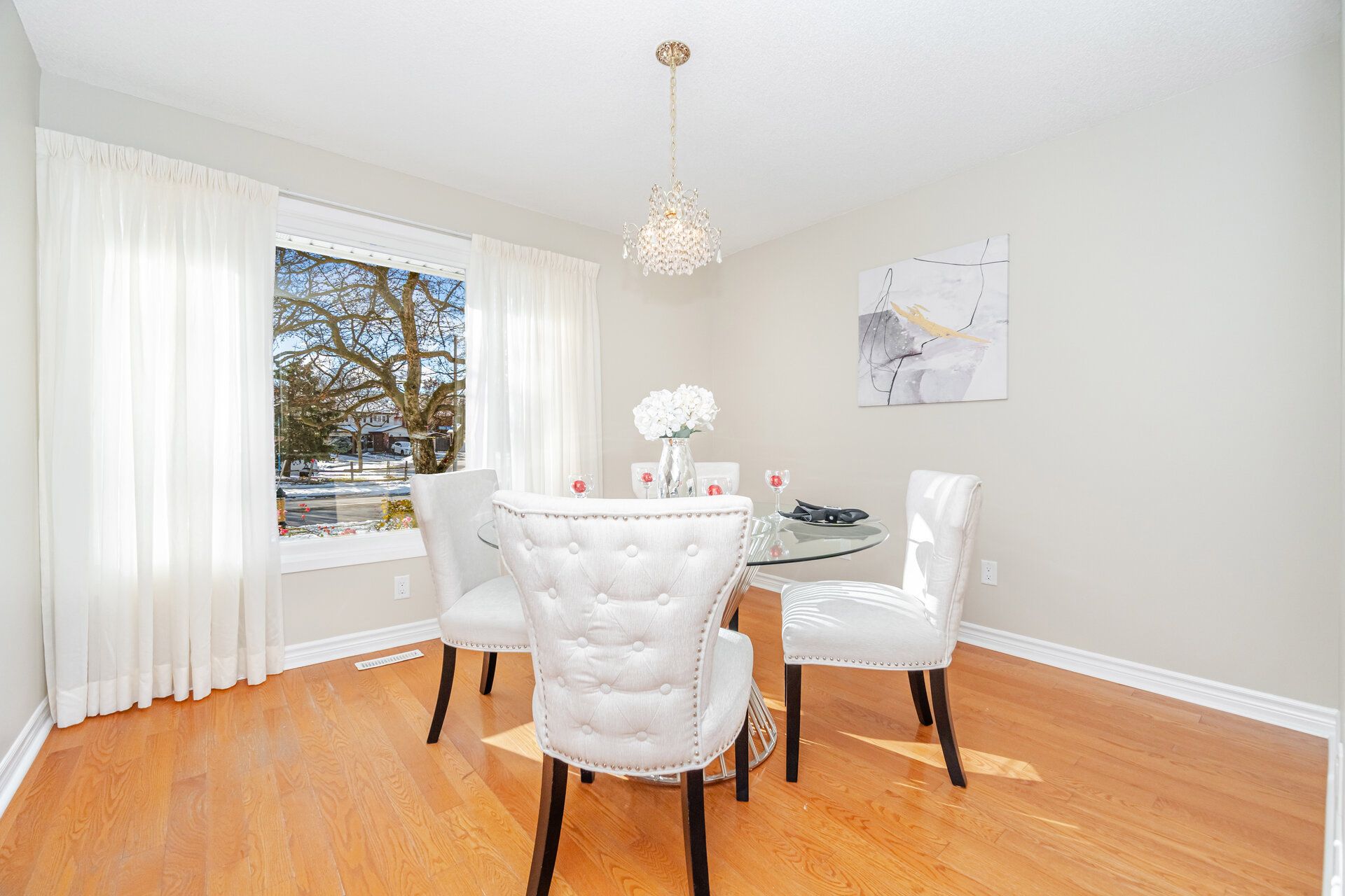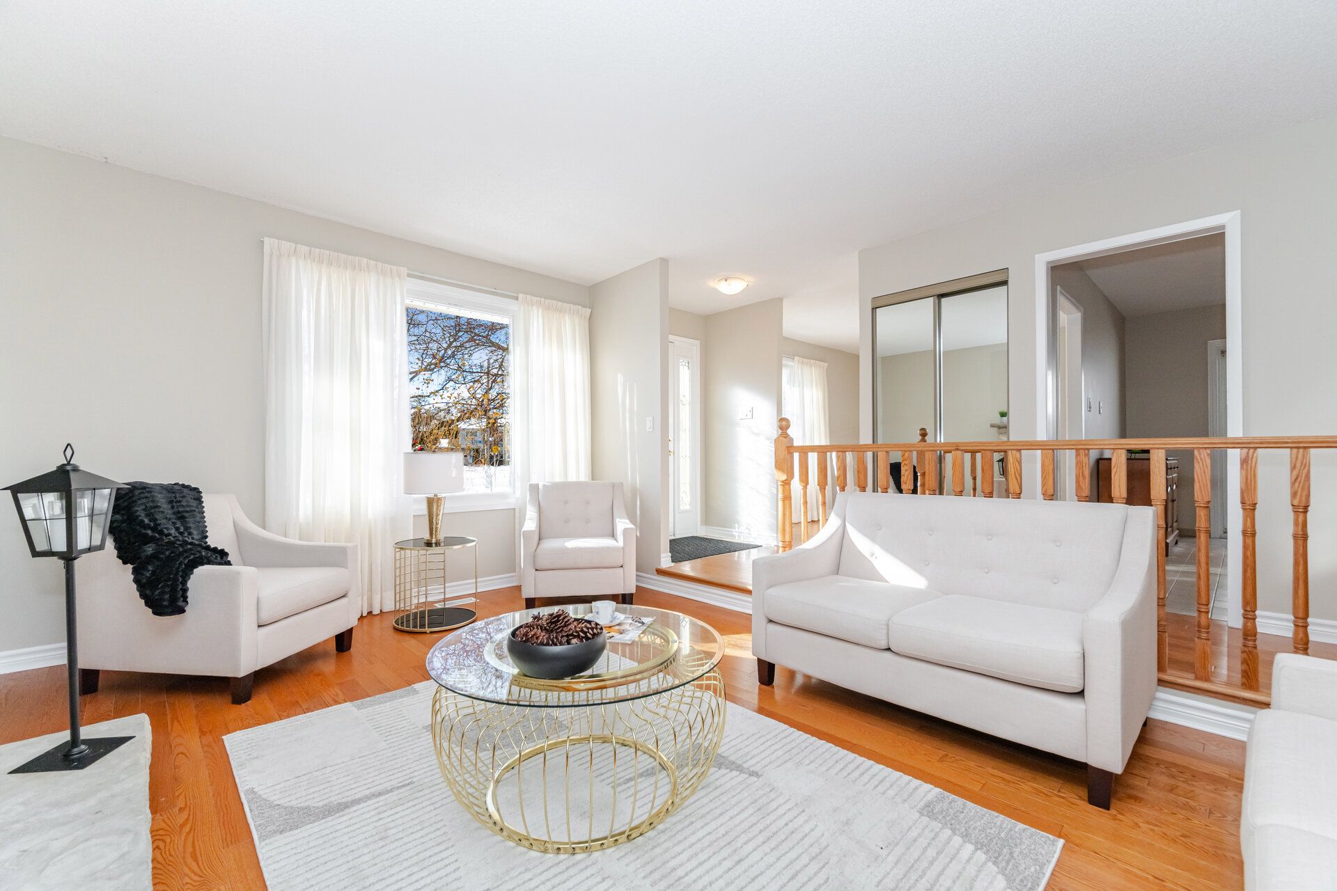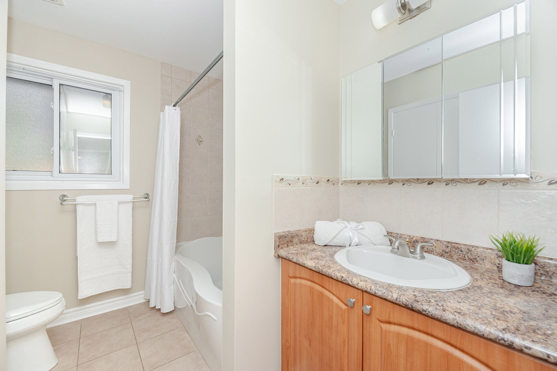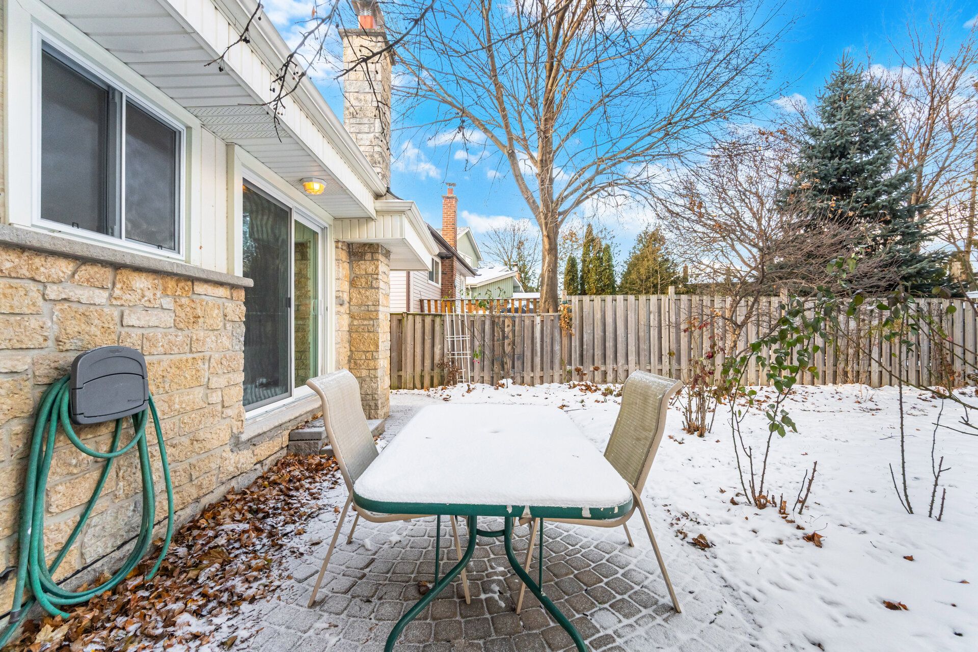 This meadowvale bungalow offers seamless single-level living with convenient access to shopping, public transit, and major transportation routes, presenting an excellent opportunity for buyers prioritizing location, style, and comfort with excellent walk scores. The residence features a distinguished stone brick exterior and extensive interlocking pathways, leading from the driveway along both sides of the property and rear patio area. The front entry with stone steps opens to a spacious foyer, where high-quality solid hardwood flooring extends throughout the main hallway, dining area, living room, and all bedrooms. The sunken living room is accentuated by a large window and a classic brick fireplace, creating an inviting ambiance. A separate formal dining room provides an ideal setting for family gatherings. The generously sized eat-in kitchen is equipped with ample cabinetry and counter space for efficient meal preparation and includes a sliding door walkout to facilitate outdoor grilling. All three bedrooms feature hardwood flooring, with the primary bedroom offering two large closets and direct access via a sliding walkout to the private, landscaped rear patio. The oversized attached garage adds further utility with a second roll-up door at the rear, allowing direct entry to the backyard. The finished lower level includes a spacious 38' open-concept recreational room with a wall-to-wall fireplace, a 3-piece bathroom, dedicated laundry area, a versatile utility or workshop measuring approximately 17'x16', and a walk-in closet suitable for seasonal storage. Recent enhancements to the property comprise comprehensive updates to the interlocking driveway, walkway, and rear patio, as well as improvements to the roof, eaves, soffit, fascia, windows (including two sliding walkouts), installation of a steel insulated garage door, and a central vacuum system. Both fireplaces have not been recently used.